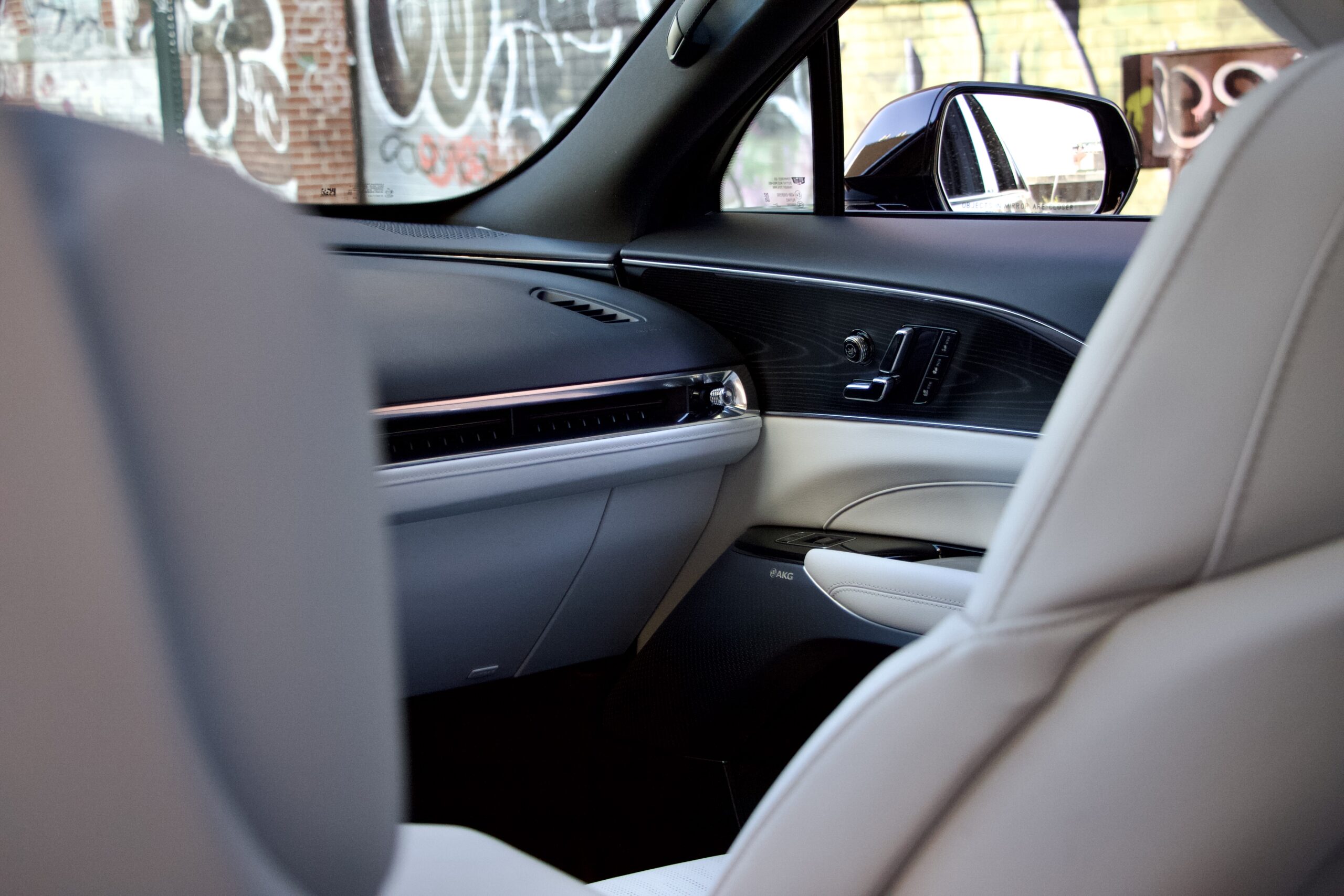 The centerpiece of the Lyriq’s interior is a 33-inch display that houses all of its infotainment functions but mercifully not its climate control. Also present on the steering wheel are hard audio controls along with touch-capacitative ones (can’t win ‘em all) for GM’s Super Cruise hands-free highway driving aid. Don’t hop in and stroke the side of the seat for a little too long looking for adjustment controls like I did—they’re on the door, Mercedes-style.