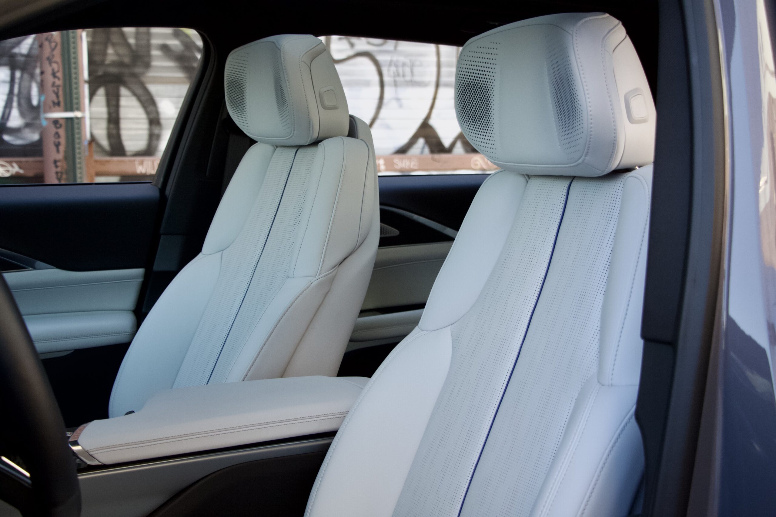 The Lyriq’s interior just might outdo its exterior, with high-quality touchpoints and supportive seats. There’s not an inch of fake carbon fiber here, just leather, layered wood, and metal. Its interfaces work intuitively, with enough hard keys for everyday functions. I also liked its parking sensors and cross-traffic alerts, which vibrate specific areas of the seat to indicate the position of moving cars, bikes, and pedestrians. It’s bizarre the first time it happens but quickly becomes normal.