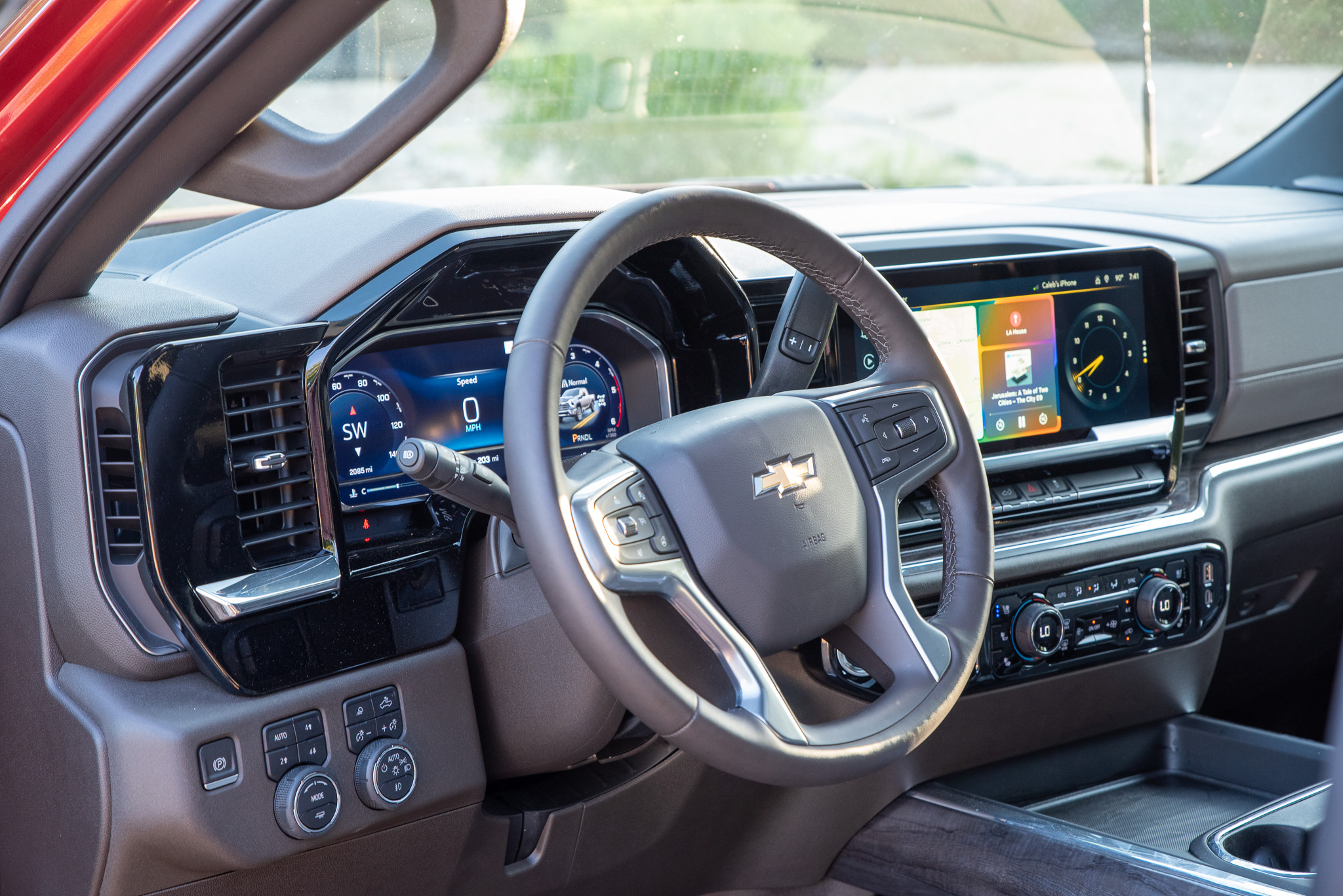 My gripes about the truck are limited. I already mentioned the “buckle to shift” feature, and those power running boards are a little slow to deploy. And while I do like the new infotainment overall, the digital real estate could be used a lot more effectively. It’s always in split-screen mode, even when you’re using Apple CarPlay, and the info on the right-hand side is often redundant. You can scroll between an analog clock, media that’s currently playing, or nav, but the CarPlay home screen already shows all of that. Again, it’s minor, but I’d like to be able to make it full-screen.
