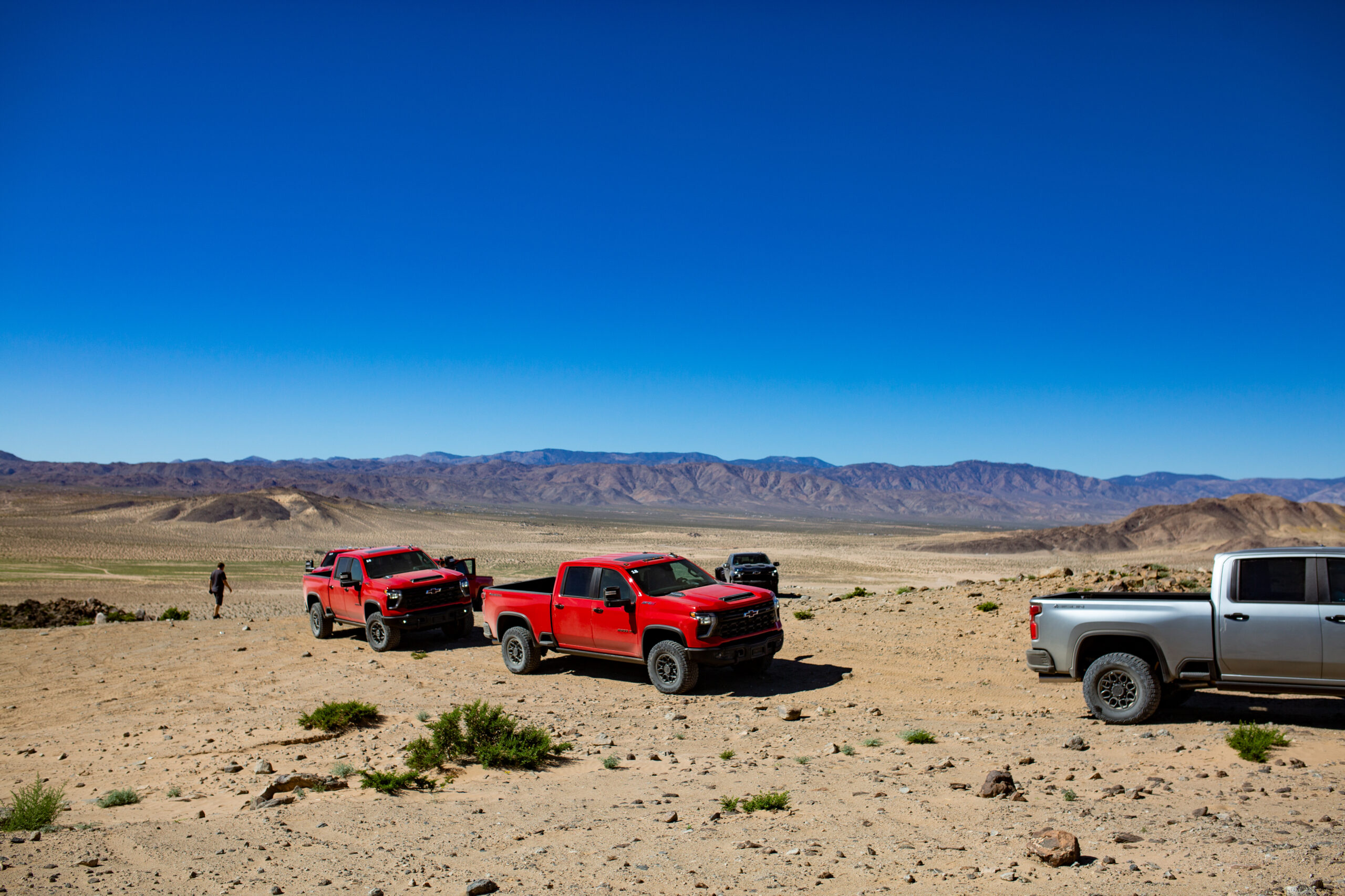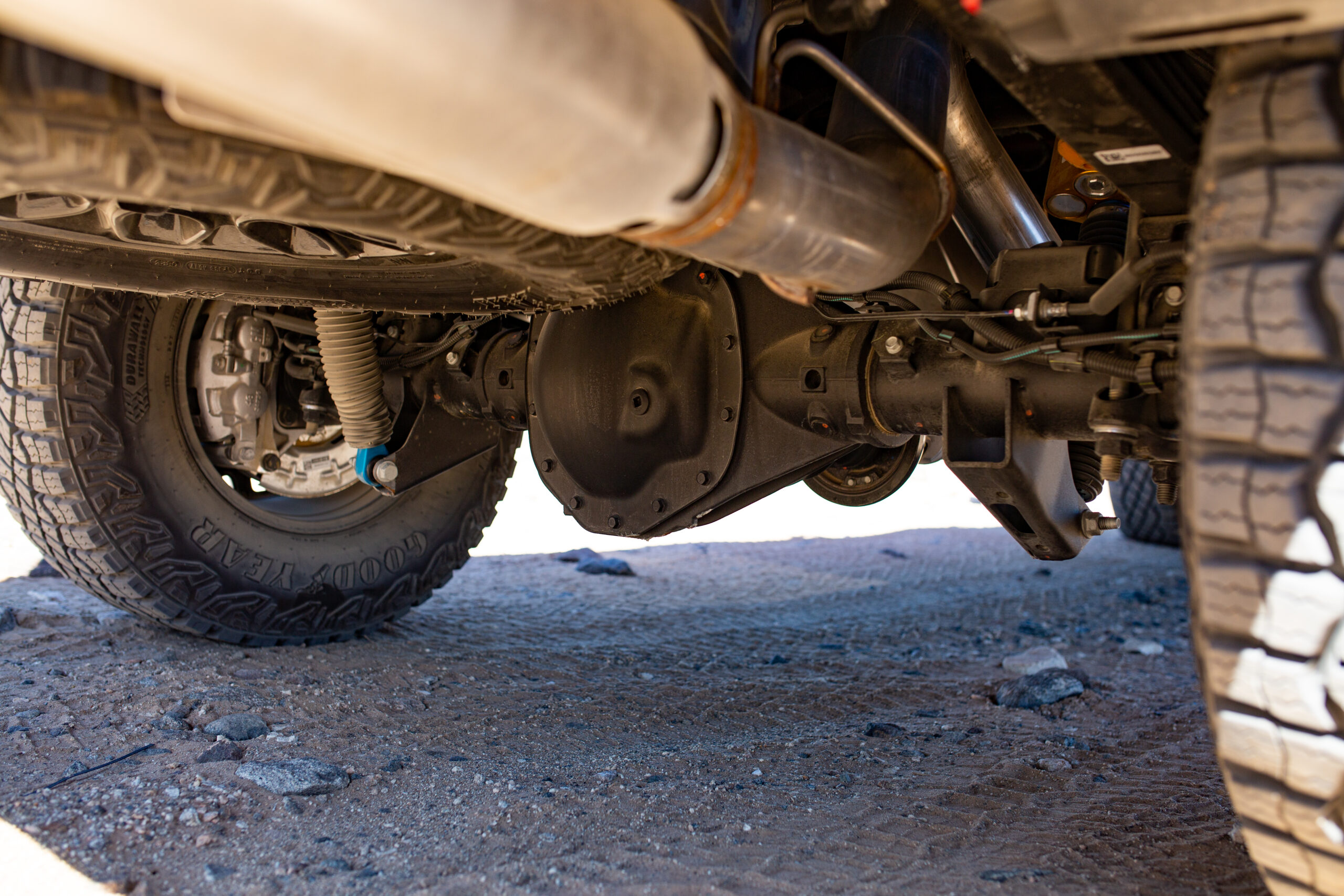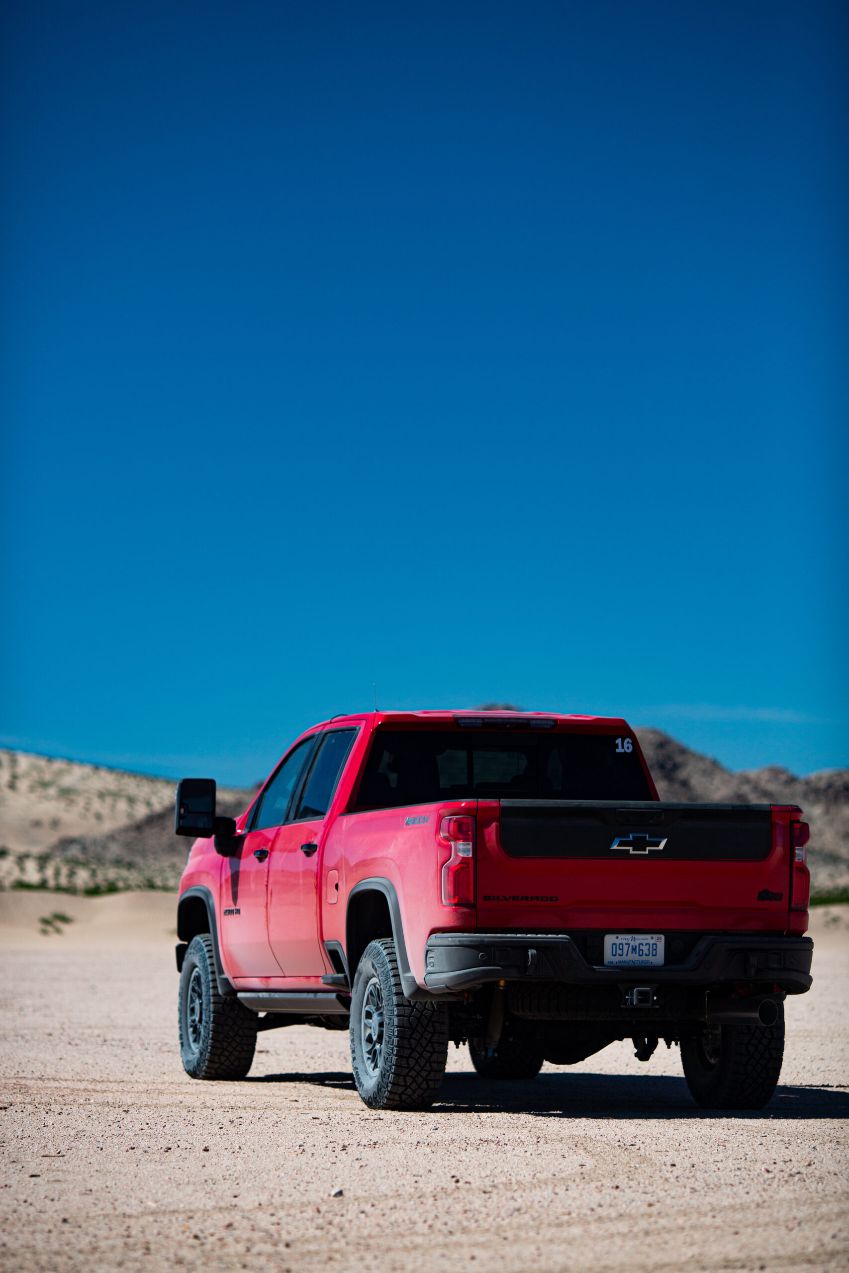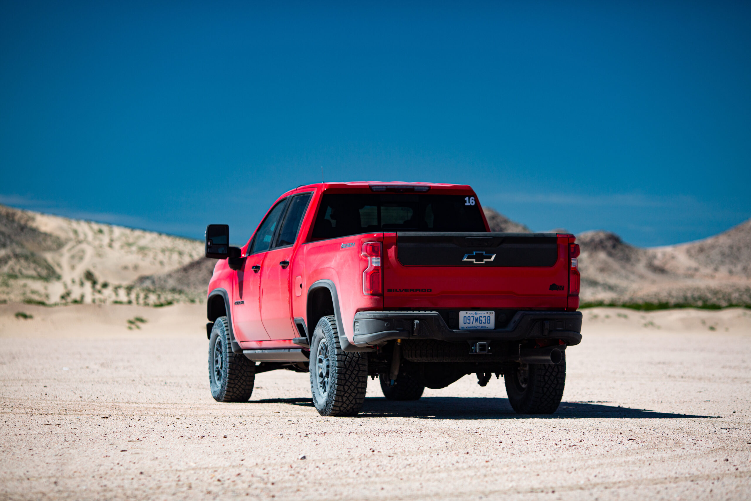 Get the HD ZR2 on some dirt, and you’ll find that partying attitude I mentioned. The thing boogies. On the Johnson Valley dry lake bed, the dampers absorbed the rapid, small bumps with shocking ease. And the truck was not overwhelmed by any of it, mostly evidenced by the easy powersliding at speed. That colossal diesel power plant would spool quickly, light up the rears in two-wheel drive, and create a large enough dust cloud that it might trigger localized climate change.