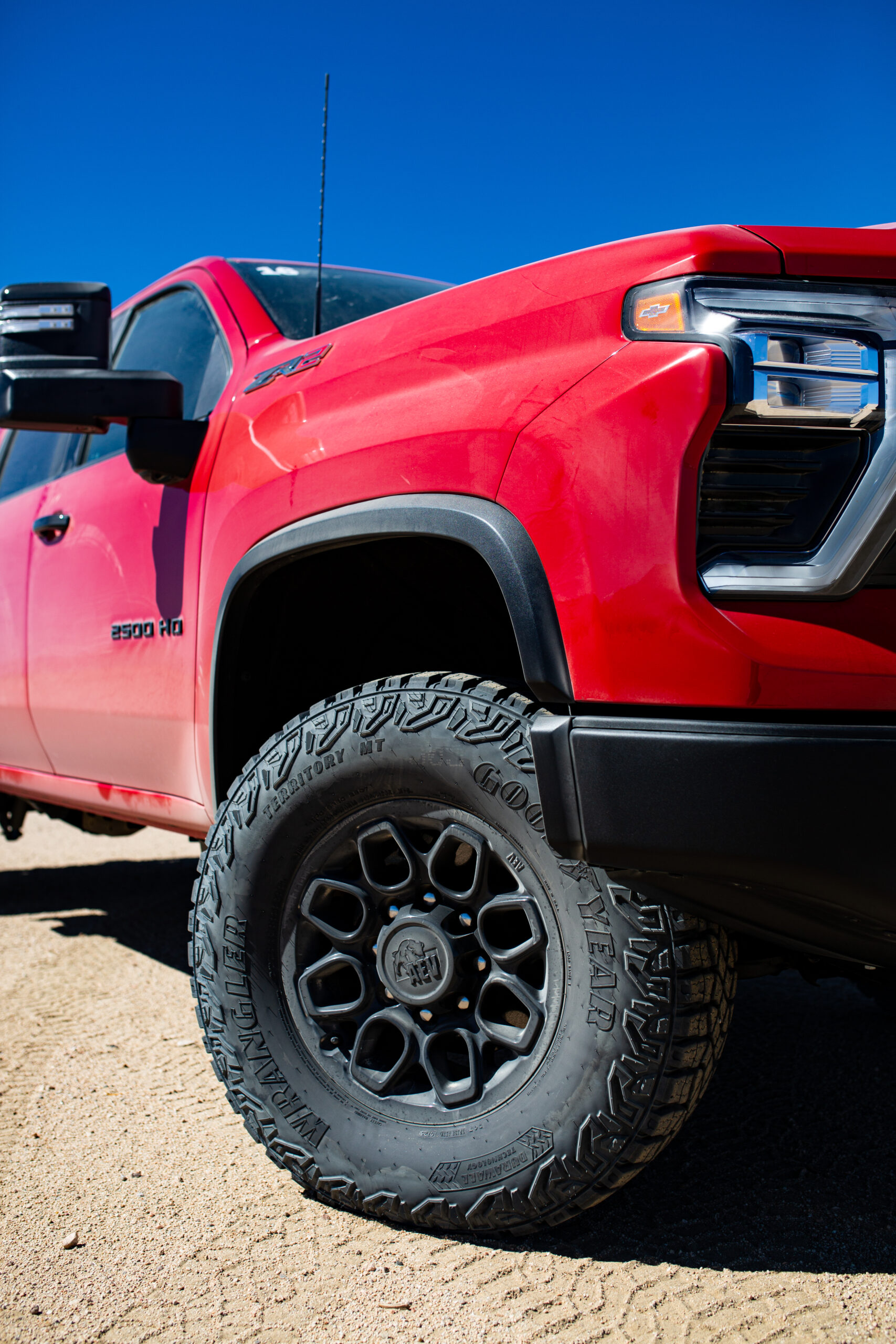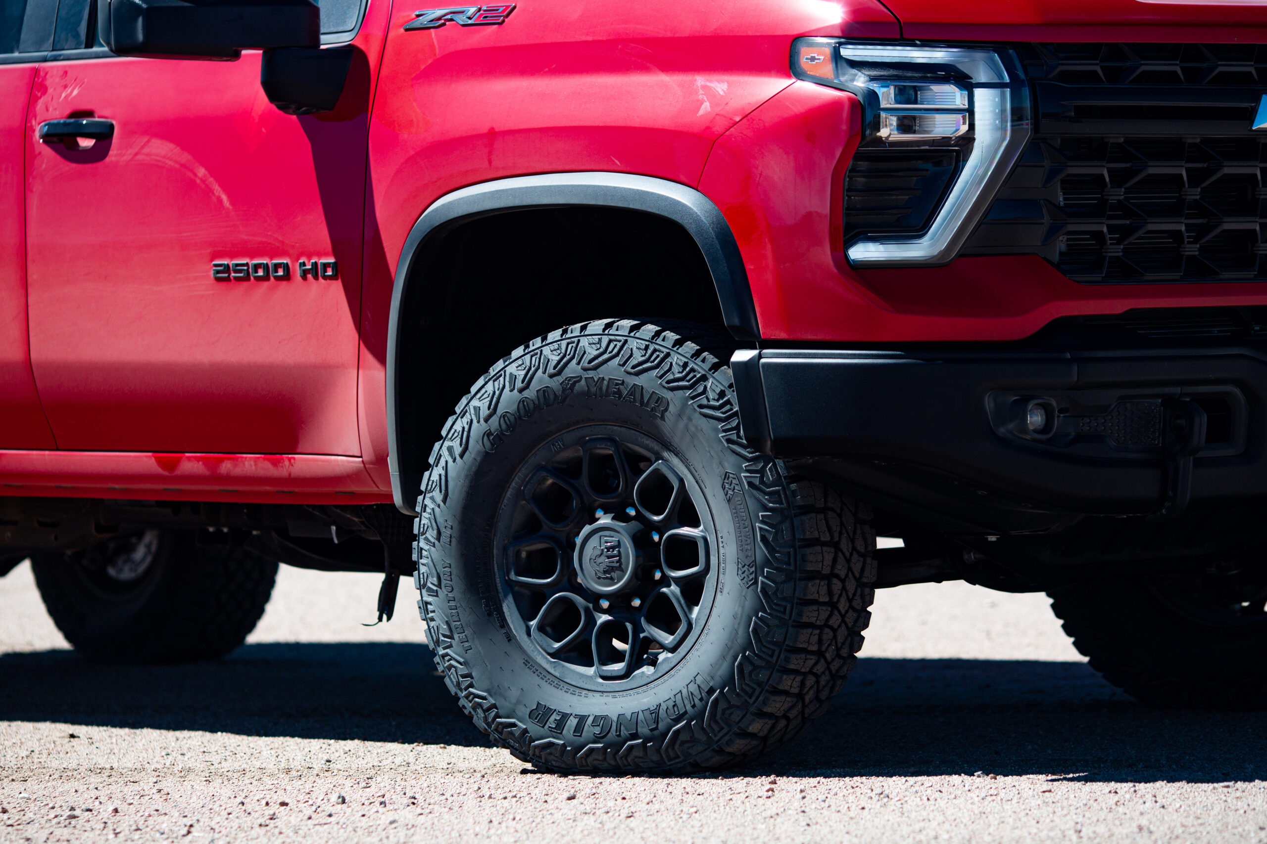 The HD ZR2 comes with a long list of standard features and a fair few option packages. Adaptive cruise, heads-up display, and the rear camera mirror are part of an option package, but adaptive cruise really should be standard for the base price of the ZR2. As standard, you get a huge 13.4-inch infotainment display, electronic locking rear differential, wireless Apple CarPlay and Android Auto, and Goodyear Wrangler off-road tires. The gasoline engine is standard, while the Duramax diesel is a $9,490 option.