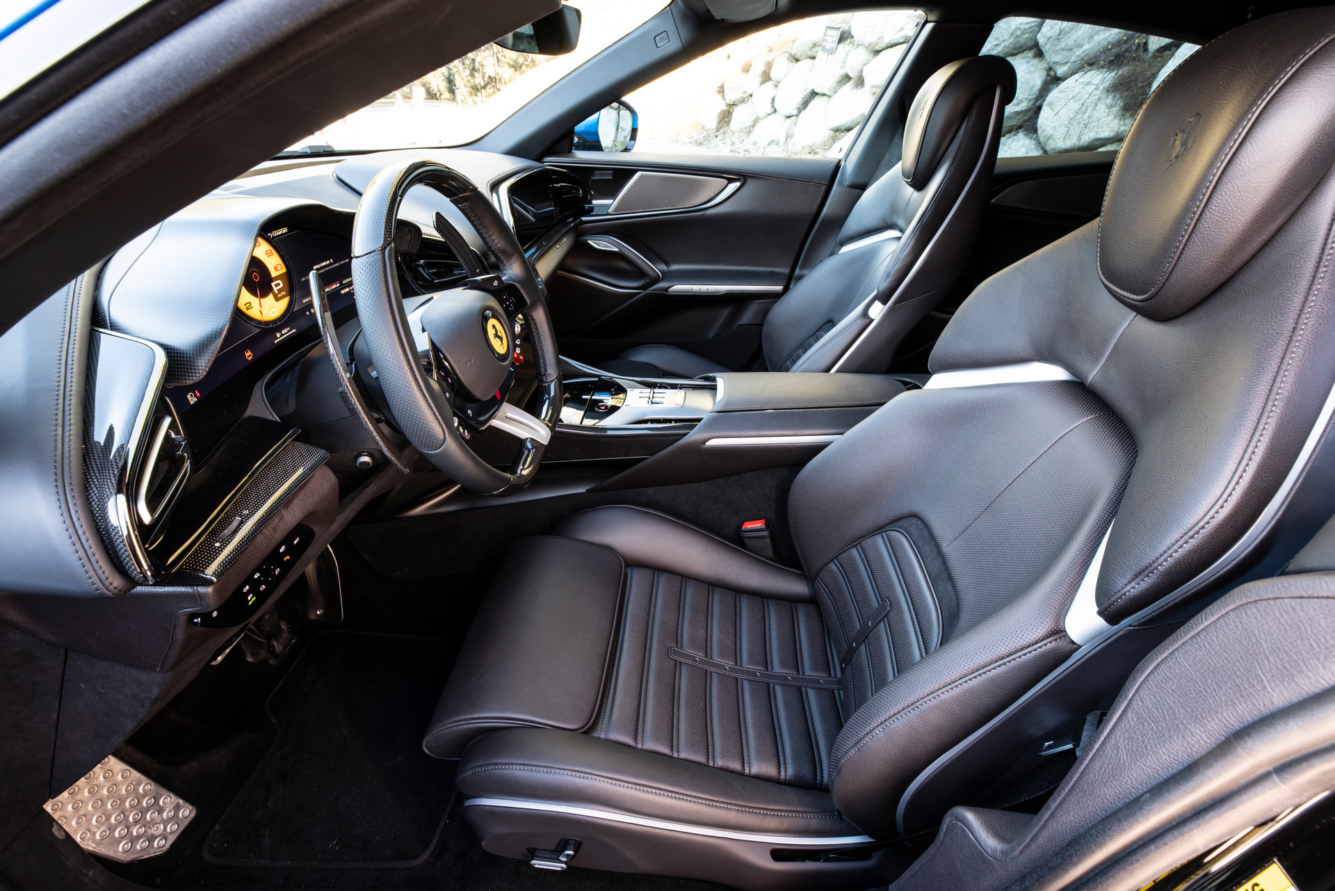 Open the door and step inside the Purosangue. Did you feel that? You just stepped in—no circus act, no special procedure. Most noticeably, no barely squeezing in if you’re a big guy like me. Just throw a leg over and take a seat. The door opening is wide and generous, and while it still sits a lot lower than your average vehicle, it’s an easy ingress. Ferrari didn’t disclose how many ways the front seats are power-adjustable, but it’s a lot—and one of my favorite parts of the car, for sure. Remember, a good driving experience begins with a really good driving position. The bolstering, the firmness, and the angle of every section of the seat can be adjusted. You can, in fact, spend 10 hours sitting in one. And when you start to feel tired, turn on the massage function—a Ferrari first—and buckle up for another 10. That’s not something I can say about my experience in the F8 Tributo, or perhaps even the Roma.
