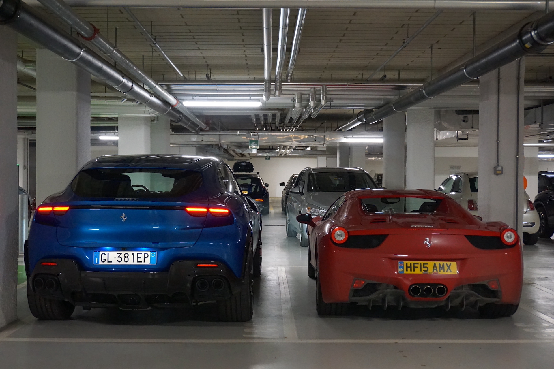 But first, I had to venture into an underground parking lot with steep ramp access and make my way through tight rows of cars—the combined value of which probably didn’t even add up to the starting price of the Purosangue. The experience was easy breezy and nowhere nearly as nerve-wracking as it would’ve been in other Ferraris. While the entry was pretty steep (and I was cautioned by the front desk staff that most Ferraris don’t make it there), the nose lift system in the Purosangue came in clutch and took all the drama out of the situation. Then, the surround-view cameras kept an eye out as I made my way through the garage on the lookout for a safe corner spot. Suddenly—bingo, another Ferrari! A 458 (whose owner clearly went against the front desk staff’s advice) with an empty spot next to it. Parking was painless. The Purosangue was easy to maneuver, visibility was great, and the technology (cameras and sensors) worked perfectly. I pulled both paddles to shift into neutral, made sure the auto parking brake was engaged, and wished the ‘Rari along with its new friend a good night.