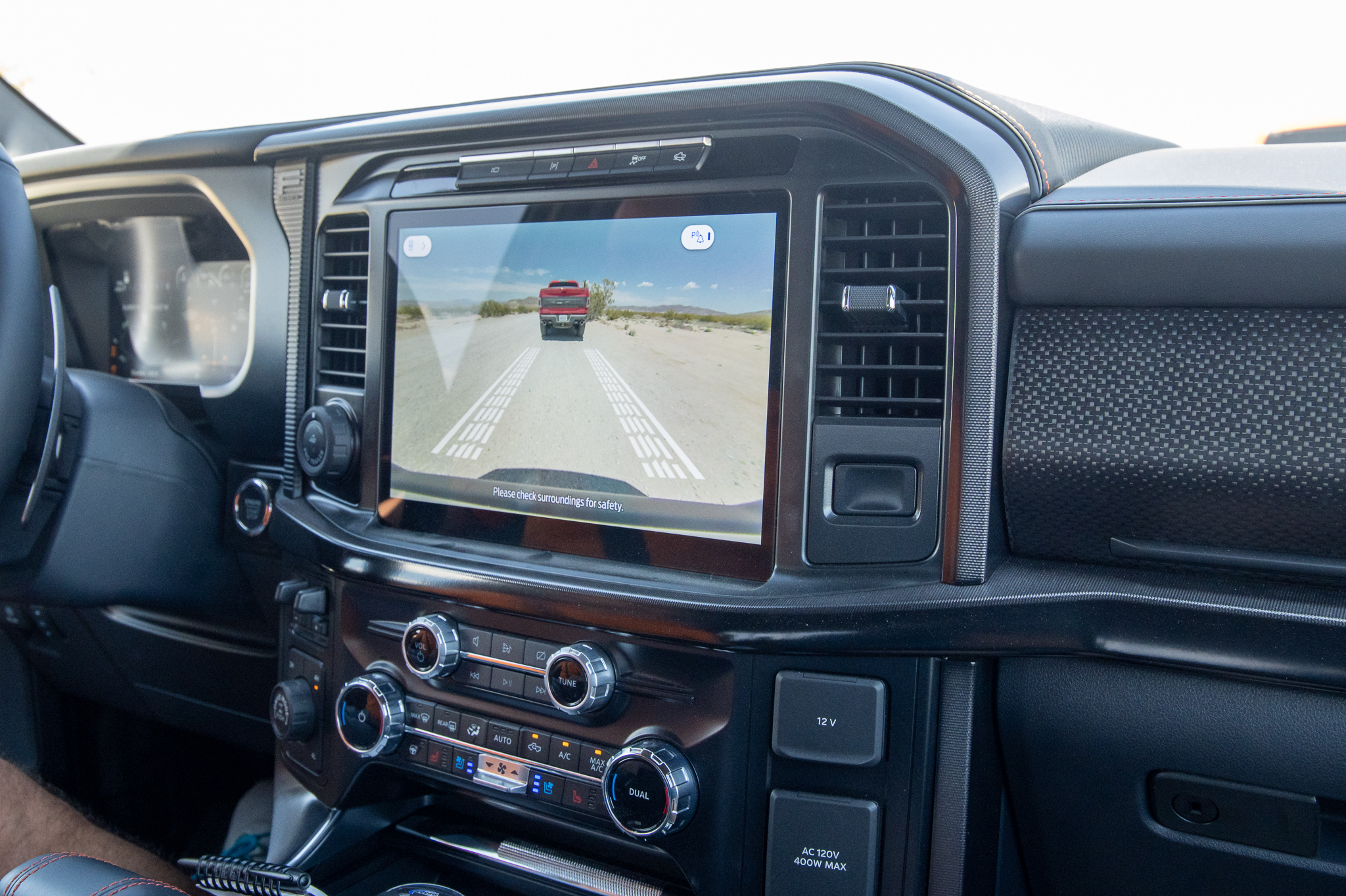 Infotainment comes in the form of a massive 12.0-inch center screen and a 12.0-inch digital gauge cluster. Ford’s UI does a good job of segmenting Apple CarPlay and Android Auto into one section of the screen while still showing you some of the truck’s metrics. But making use of all the detailed off-road info and onboard cameras on the trail means giving up CarPlay while you’re out ‘wheelin.