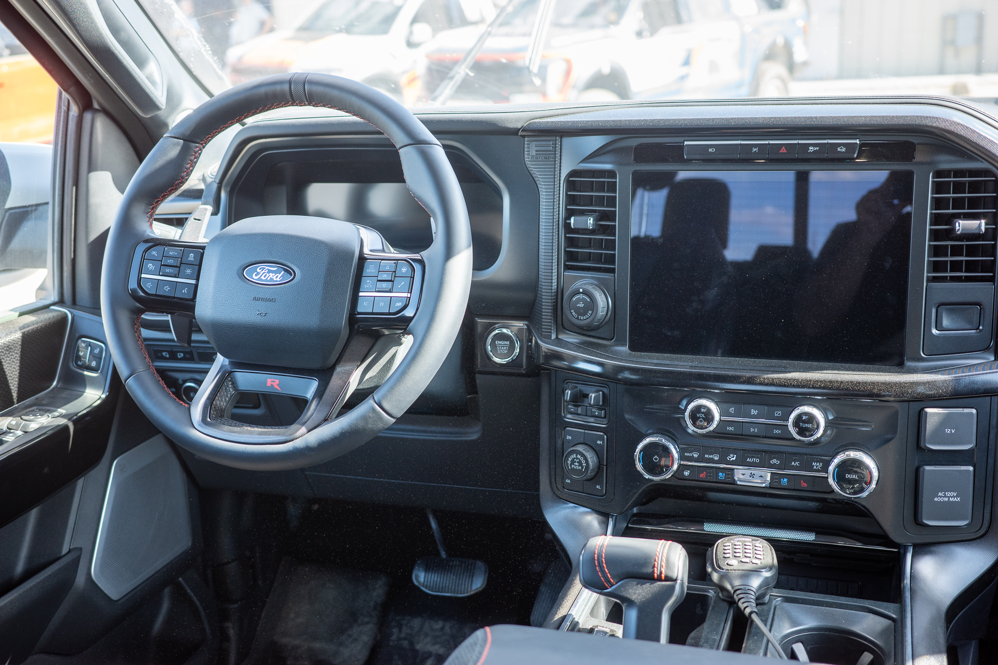 Ford says the hood scoop is part of the Raptor R’s optimized air intake system, which helped engineers squeeze more power from the engine. The Raptor R’s 5.2-liter supercharged V8 now makes 720 horsepower and 640 lb-ft of torque. That’s an increase of 20 horses over the previous model courtesy of “reduced air inlet losses” and an optimized engine calibration for a wider torque curve, according to Ford. The Raptor R still uses a 10-speed automatic transmission with two coolers, though it differs from all other F-150 models by using a planetary gear set borrowed from the F-250. The transmission is excellent, and using the paddle shifters is not necessary but still fun.