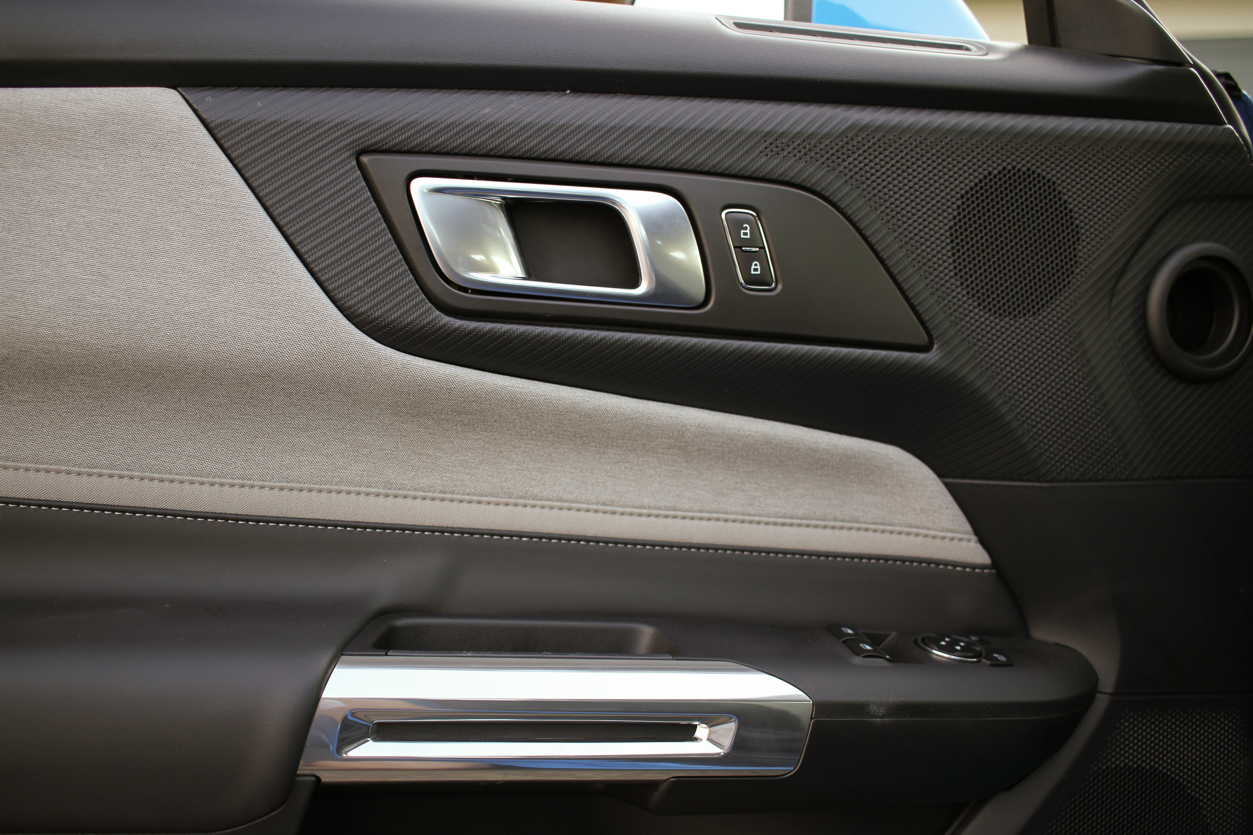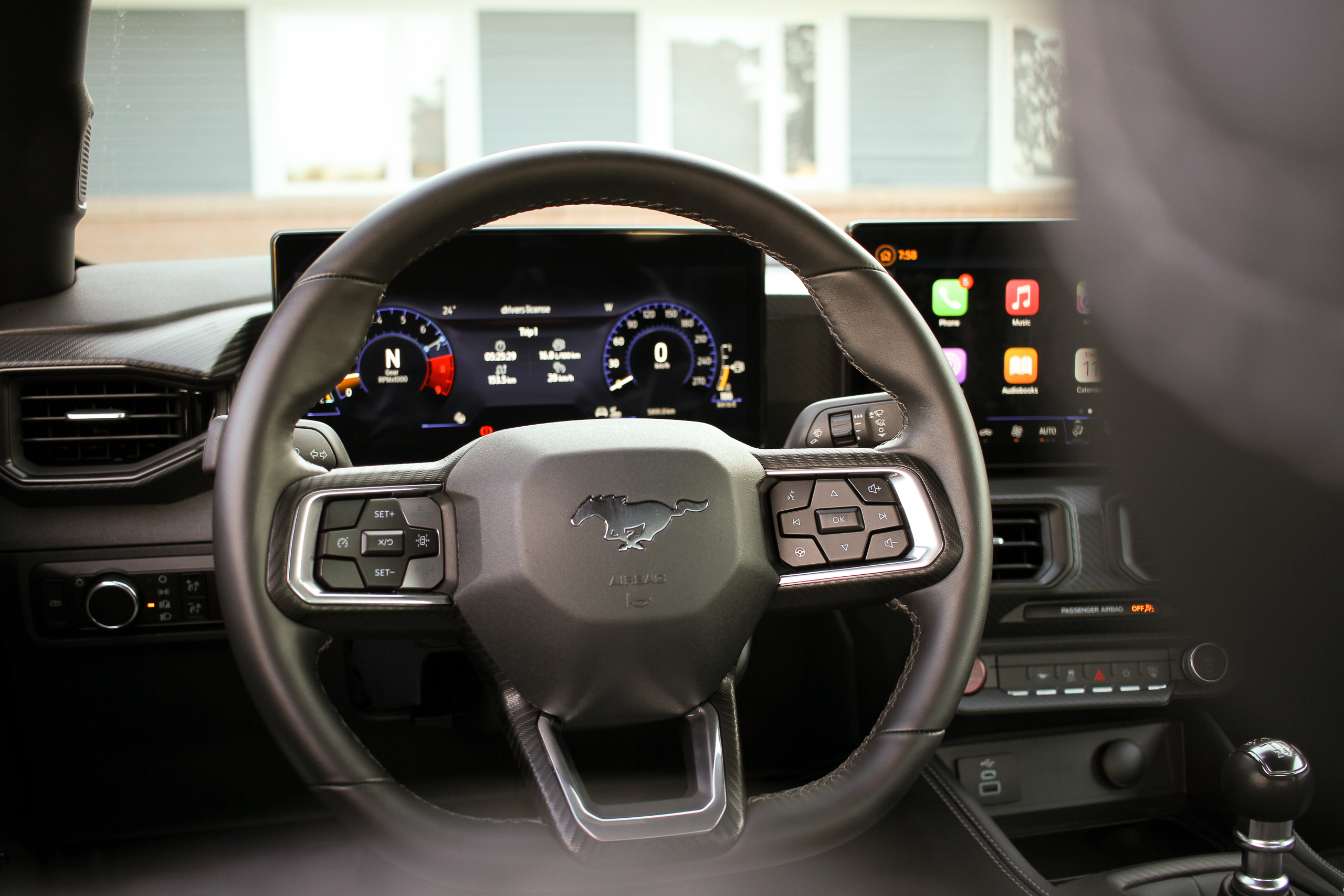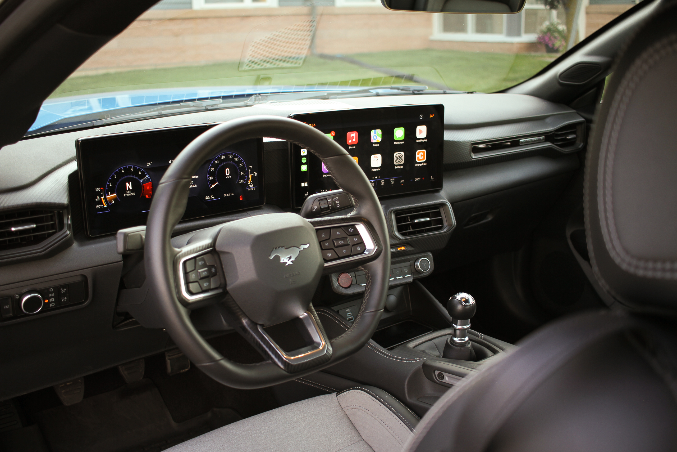 Inside, Ford has really stepped things up from the previous ‘Stang with a pair of massive screens: 12.4 inches behind the steering wheel and 13.2 inches in the center. These can be optioned to be connected within the same piece of glass, but they’re separate in this example. The screens themselves are sharp and high-quality, and the whole experience boasts some really cool Unreal Engine 3D-based animations, but the system takes a while to load when you first start the car.