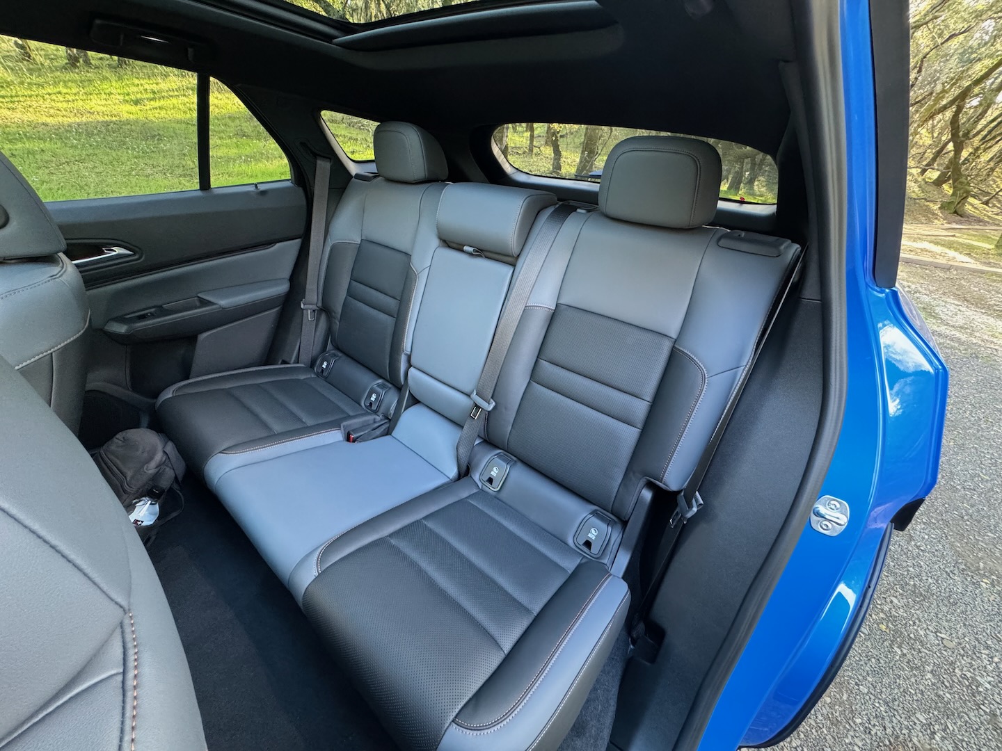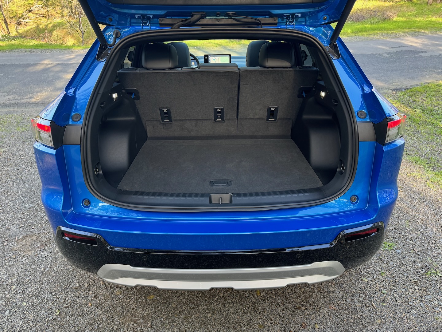 The Prologue’s low roofline necessitates a lower seating position from the typical crossover barstool. A low hip point and more stretched-out heel position remind me of the original Acura ZDX, still one of my favorite Honda products. The Prologue’s interior is spacious and full of storage. Honda claims four inches more legroom than competitors without naming them, but a quick look at the Tesla Model Y and Kia EV6, which are slightly smaller vehicles, says the Prologue’s 39.4 inches is about average. Either way, the materials are nice, and the two-tone leather looks and feels more premium than the class requires. The two front cupholders are designed to fit 32-ounce Hydroflasks—shots fired, Subaru! There are plenty of modern necessities: two USB-C ports in the front and two in the rear, a 12-volt socket up front, a 110-volt in back, and a somewhat poorly designed wireless charging pocket in the front console. A phone sits upright in the pocket and tips over when turning—a small nit to pick.