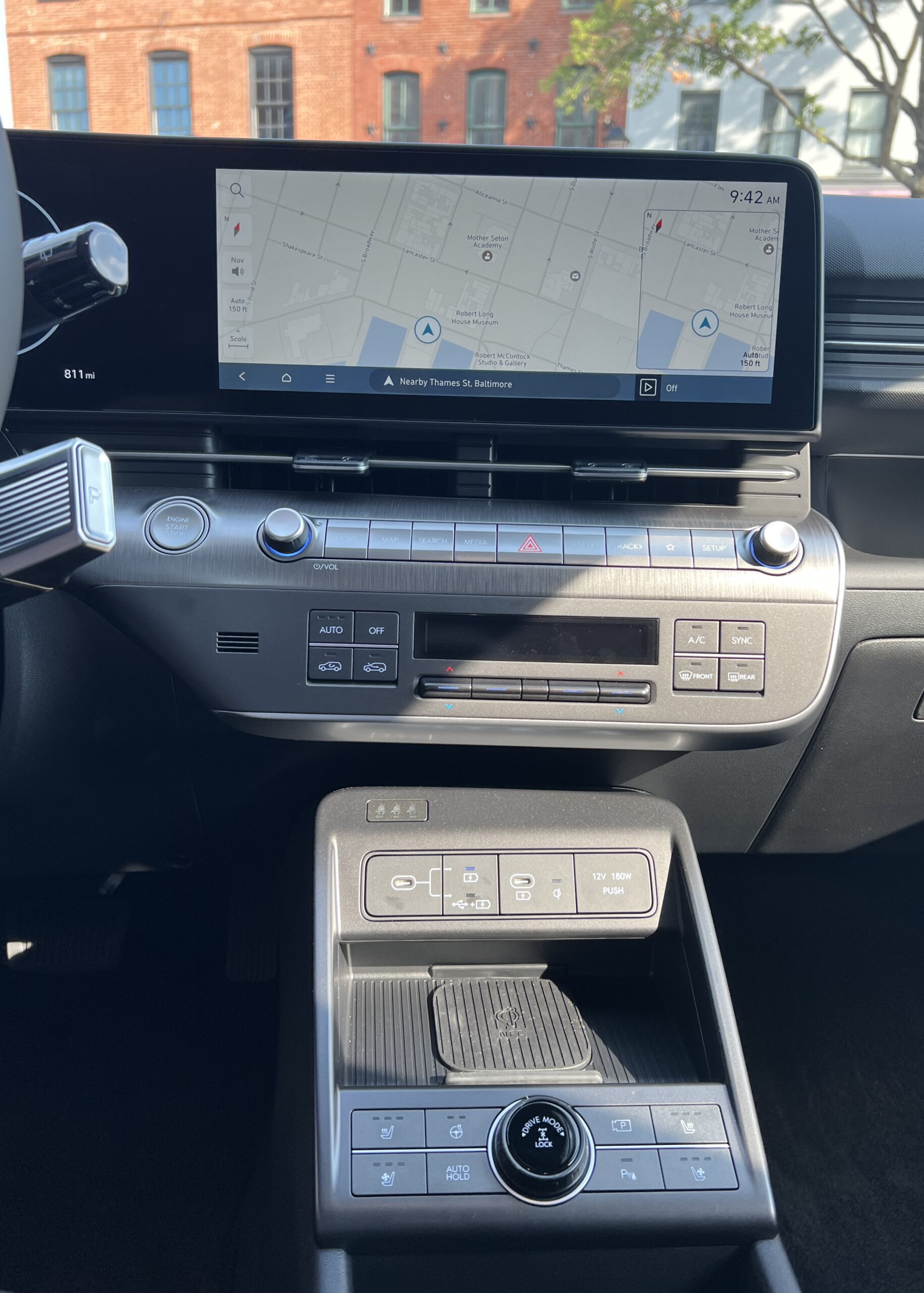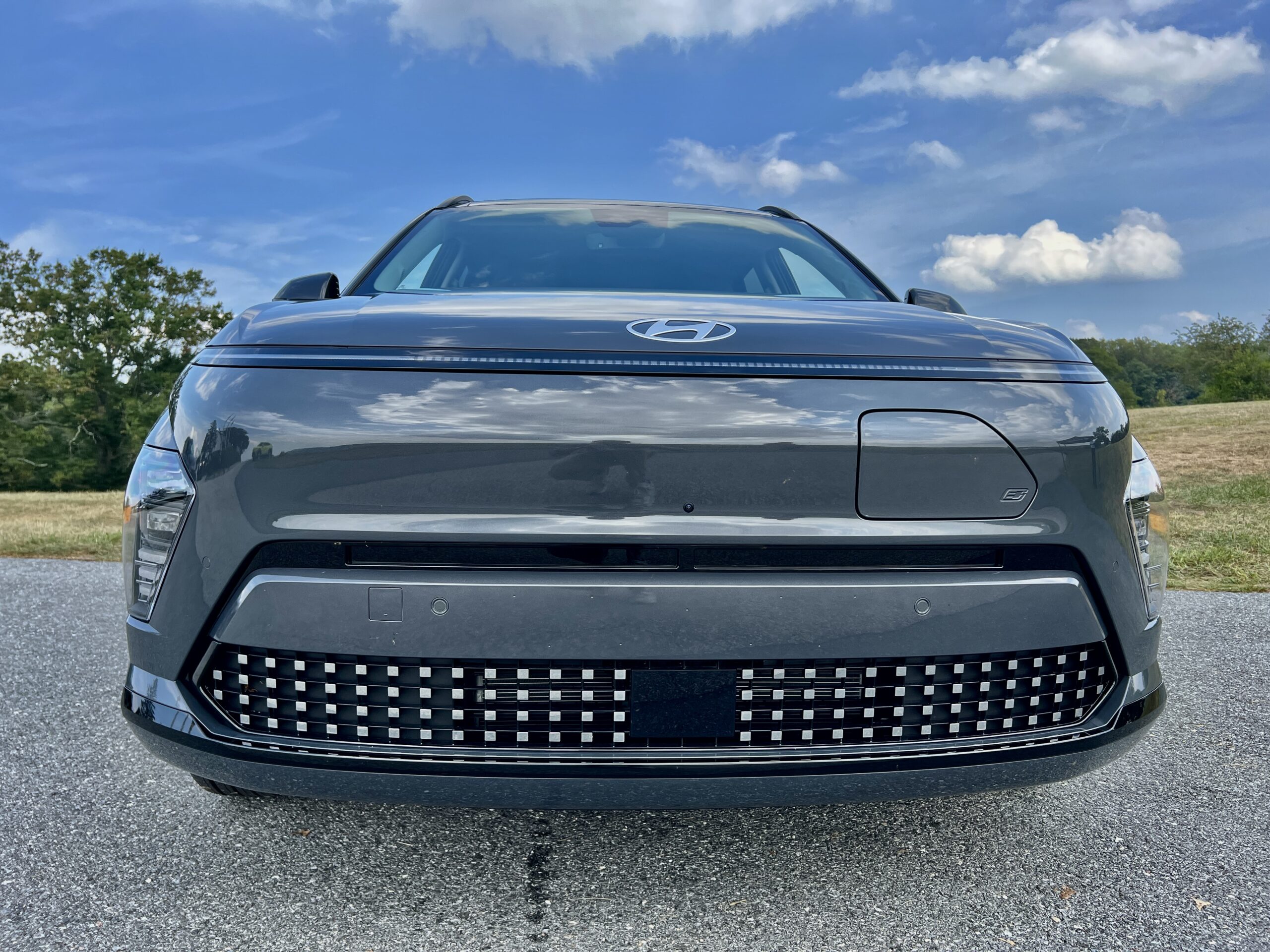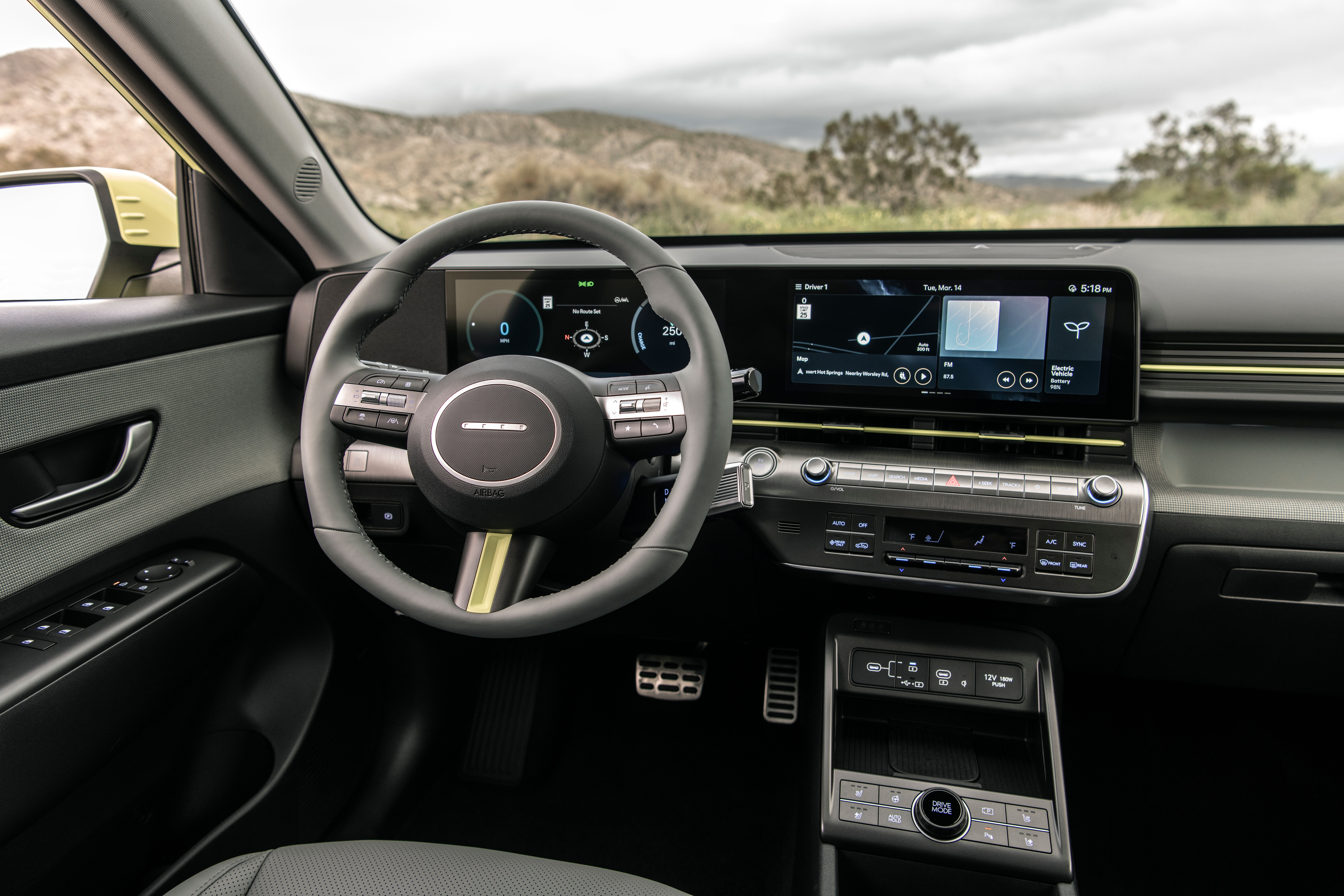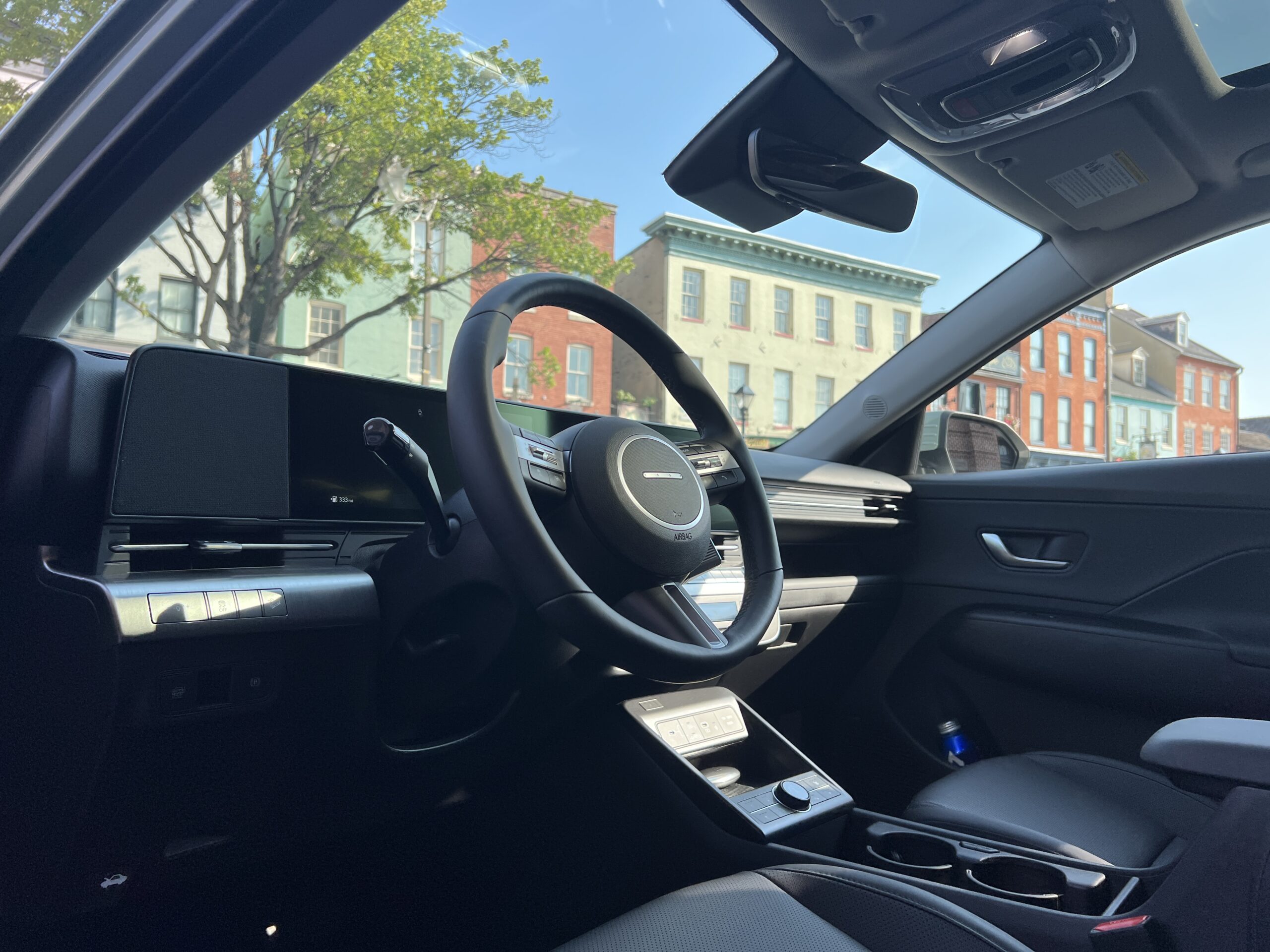 Stepping into the Kona, it’s immediately apparent that Hyundai was going for a classier vibe. In the Limited AWD trim, you’re greeted by a leather seat, Hyundai’s four-dot steering wheel, and a configurable center console with flip-out cupholders similar to those in the Palisade and Kia EV9. Selecting drive and getting going with Hyundai’s new shift-by-wire stalk takes a little practice but is reasonably intuitive. My only gripes are that the wireless charging pad’s enclosure is slightly small for a phone that’s plugged in—there’s no wireless Apple CarPlay, weirdly enough, more on that later—and that even on the top trim, there are some cheap-feeling plastic bits on the door card armrests. The front passenger also gets a storage slot above the glove compartment, but it’s half an inch too narrow to accommodate a standard iPhone 13 in a case.
