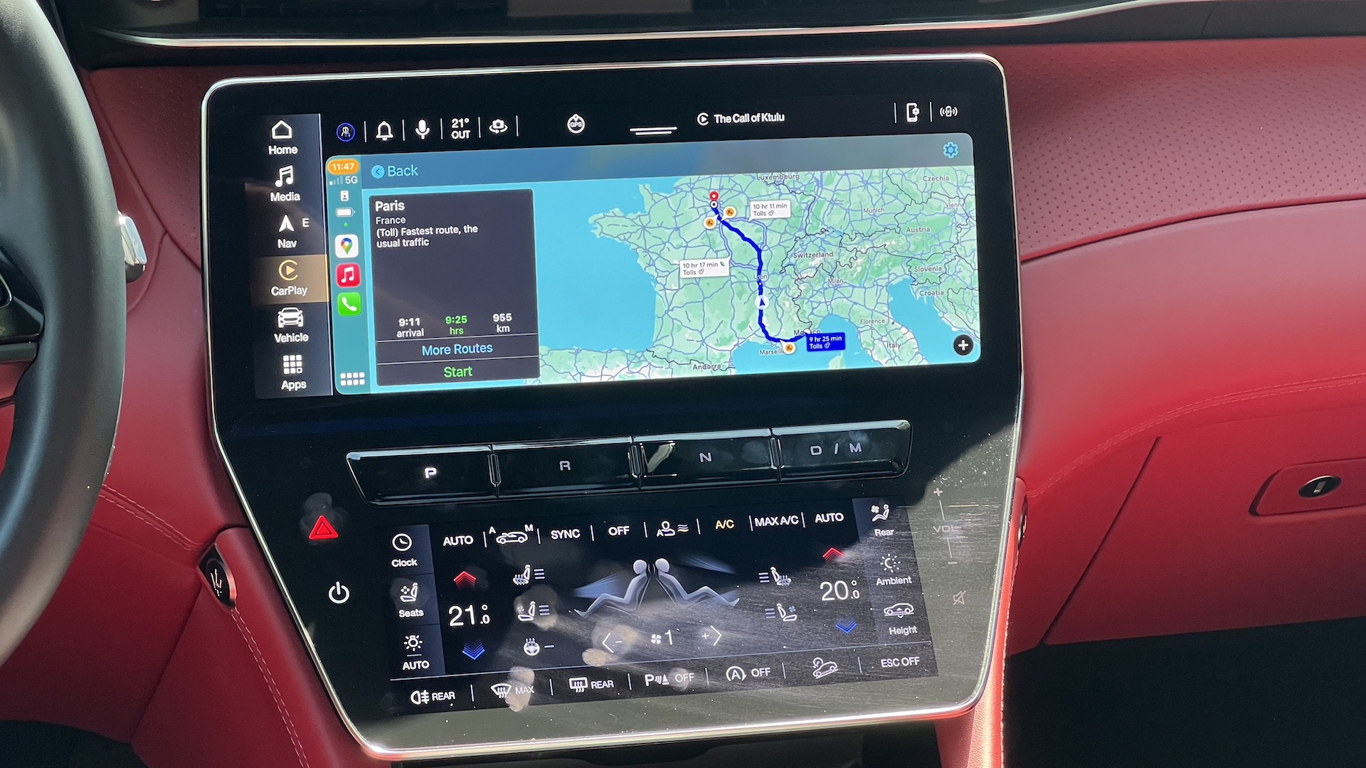 Two hours in and I was beginning to get comfortable with the Grecale. I had tweaked and saved my seating position for optimum comfort and figured out the adaptive cruise control, headlights, wipers (for the occasional splash of washer fluid to clear bugs off the windshield), and deciphered what each of the two touchscreens did. The setup made sense and was easy to operate, with Apple CarPlay on the 12.3-inch top screen and climate controls, seat massage settings, and ambient lighting on the 8.8-inch bottom screen. When not using CarPlay, the top screen displays a dressed-up version of Stellantis’ Uconnect, which is mostly fine. Adjusting specific settings like sound, screen preferences, user memories, and other less-common features took a bit of time to figure out, but it wasn’t a big deal. Everything I needed to drive the Grecale and have a good time behind the wheel was easy to figure out.