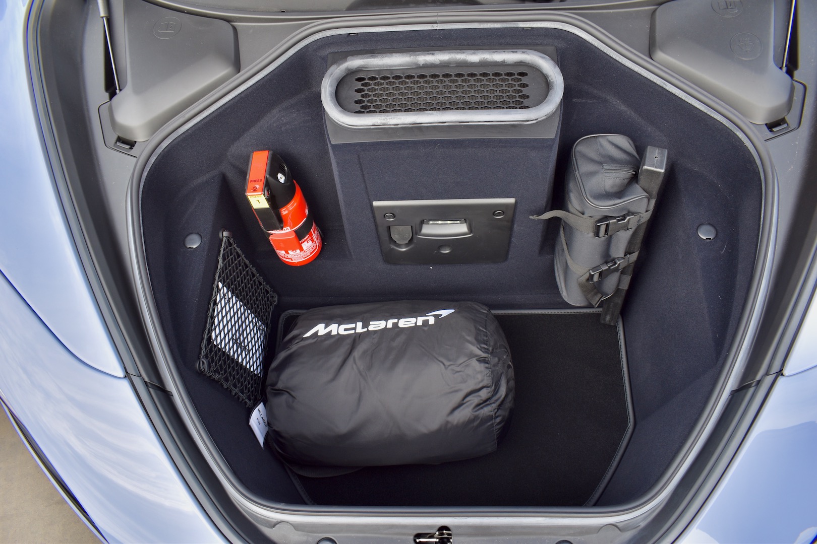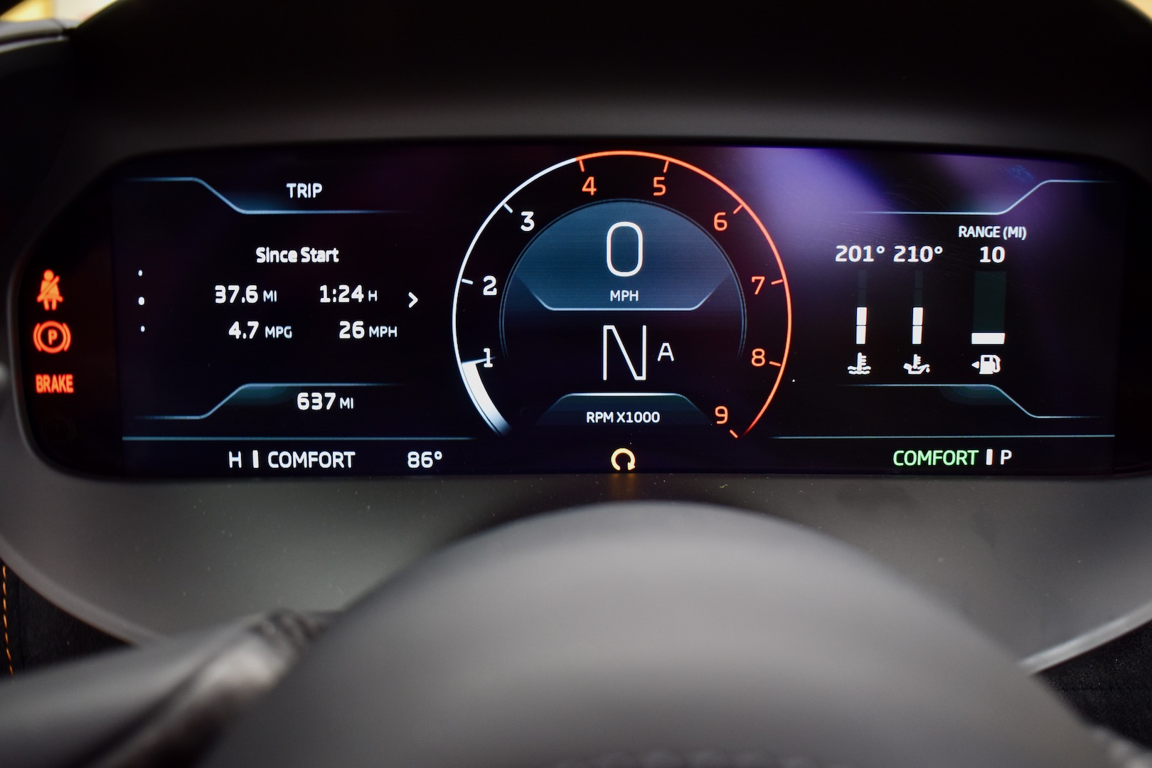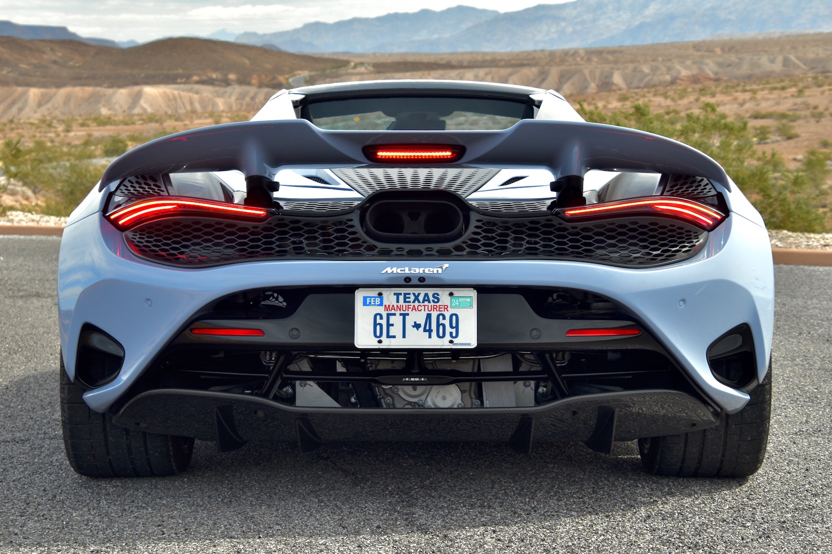 Most of what you hear is road noise, but the engine is omnipresent, and the wind speaks its part starting around 50 mph. That’s also when the Spider becomes overwhelming with the roof down, so it’s not the most tranquil place on the highway. While McLaren tuned the stereo to rise in volume with speed, I found the 12-speaker Bowers & Wilkins underwhelming. There was also a rattle in the exhaust’s heat shield while cruising at low throttle. I won’t say you couldn’t road-trip a 750S, because I would, but it won’t be the best thing in your garage for it.
