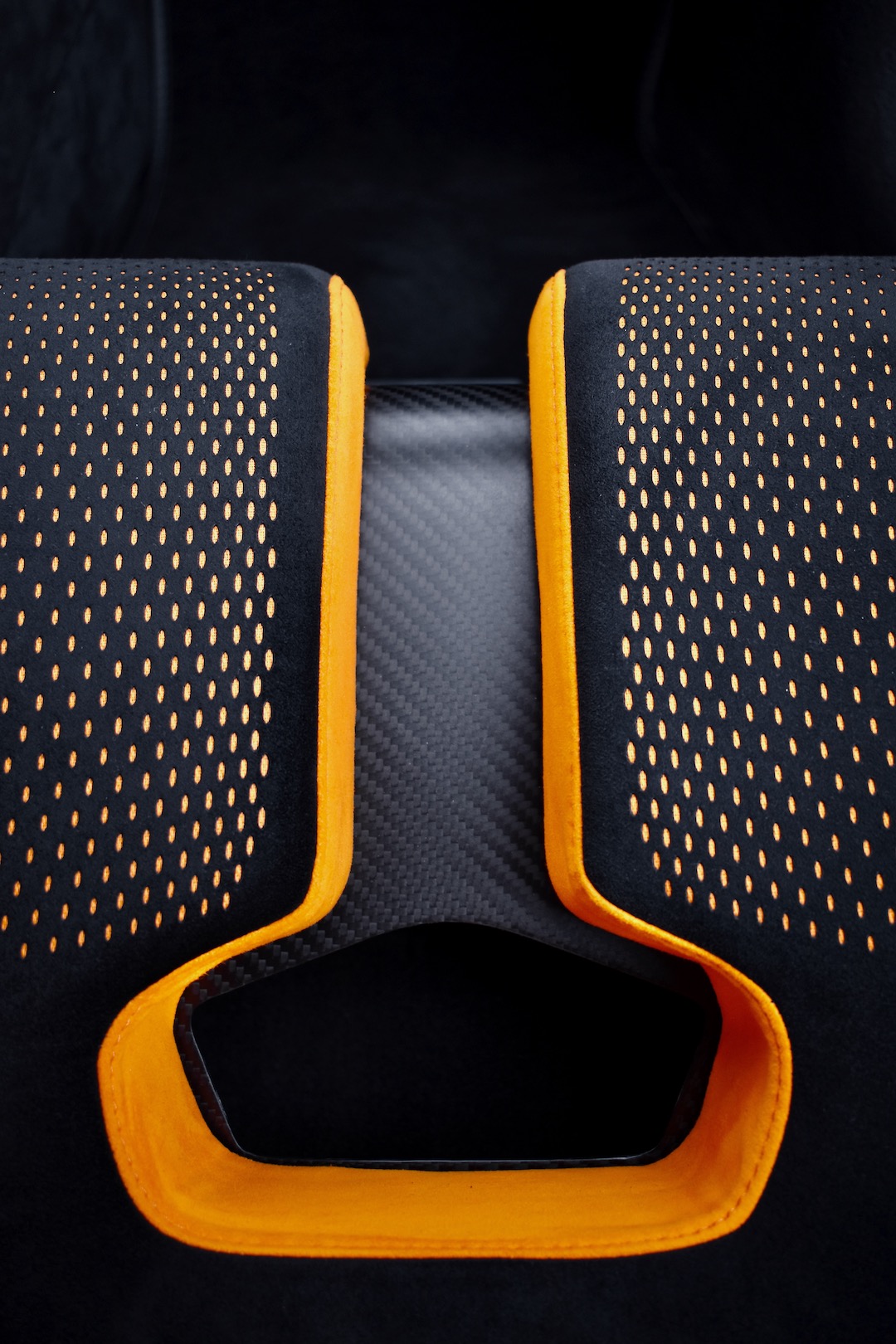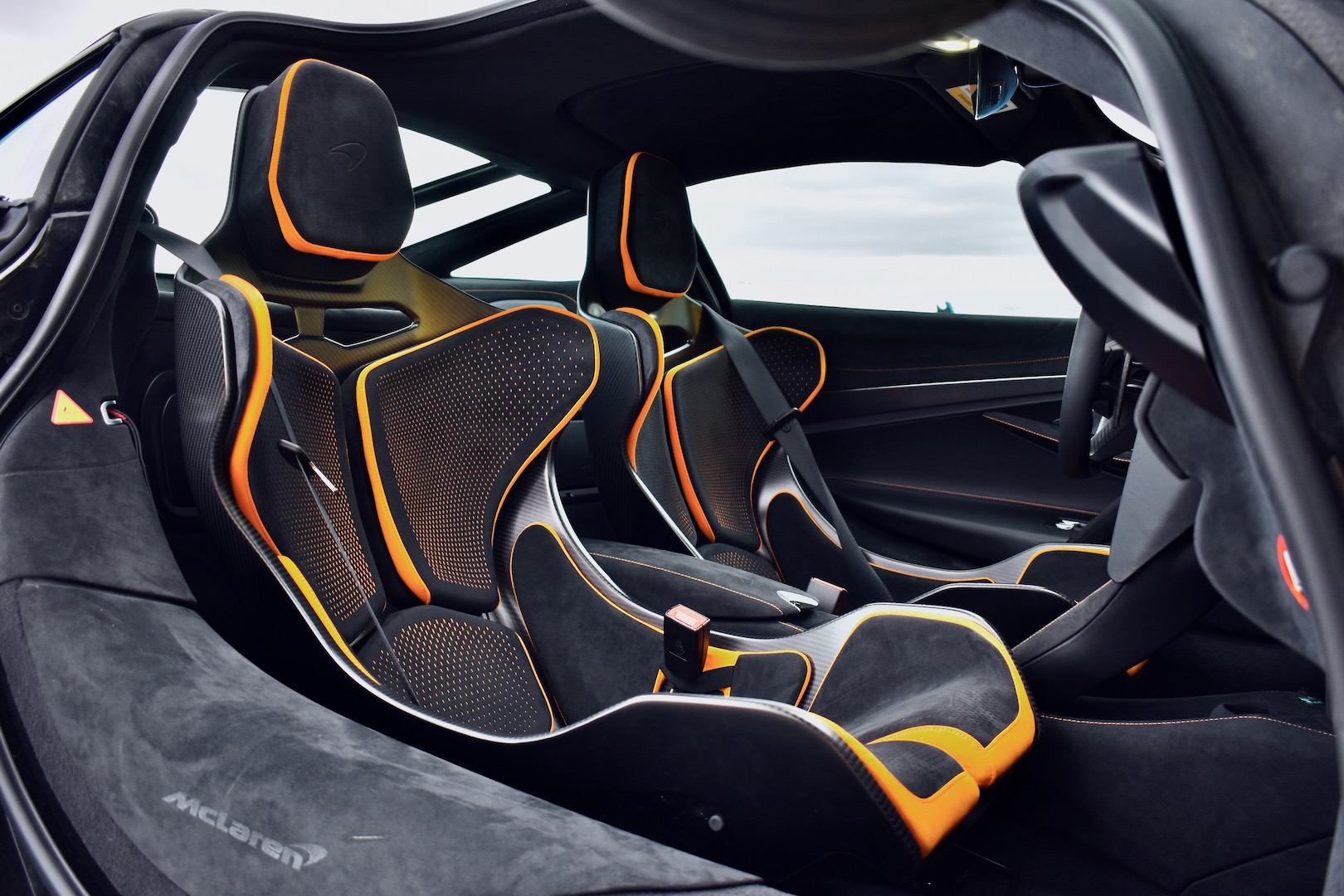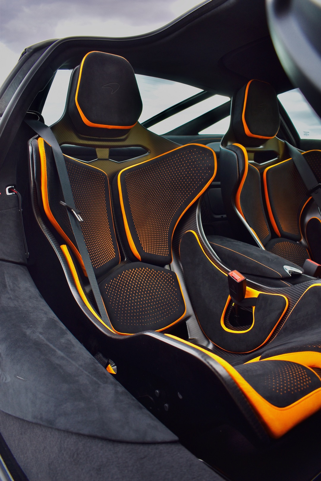 Generous use of mesh and open space above the diffuser show off the rear subframe, transmission, and exhaust: This McLaren means business. It can draw attention to (or away from) brakes behind subdued, spindly forged wheels or flashier options with machined faces—I think I like the latter more. The paint selection is a mushroom trip, where even the grayscales are stunners. Still, just get the papaya orange; you can almost taste it by looking at it.
