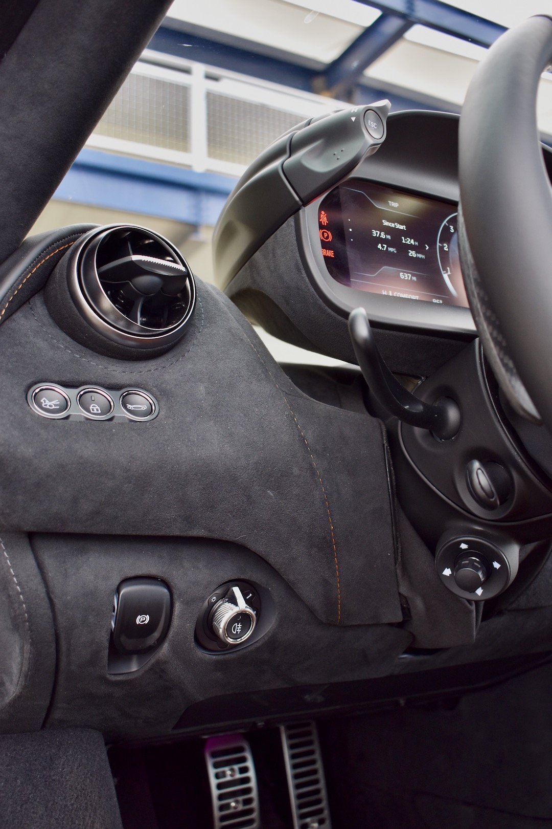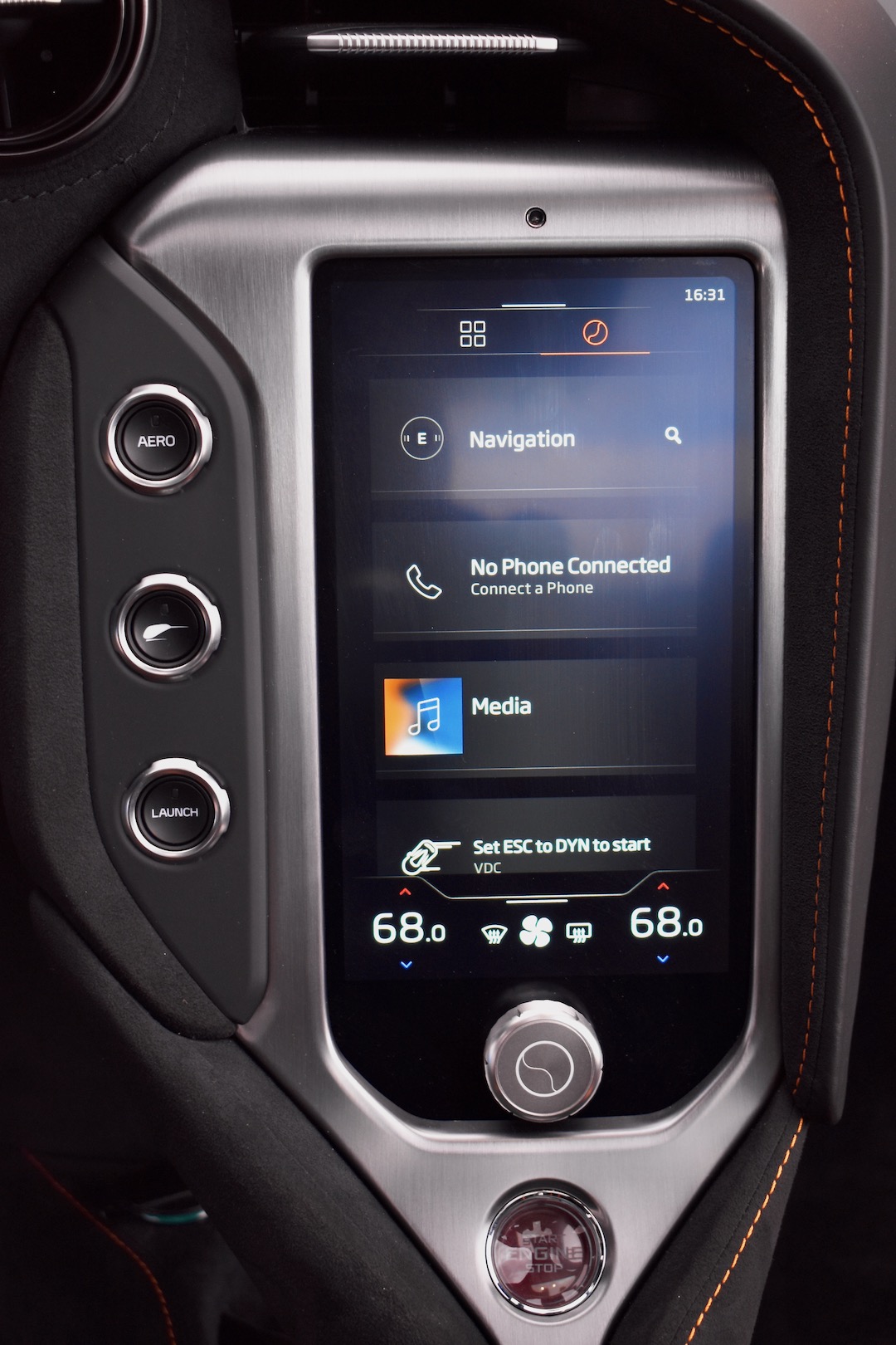 The interior, meanwhile, is the one you know from the 720S. Not flashy, but focused and clutter-free. The mini tablet-sized touchscreen is no larger than it needs to be and doesn’t aggregate the most important controls. All those remain physical and within easy reach of the button-free steering wheel. Shift buttons live on the center console, drive modes are toggled from the corners of the instrument binnacle, and less-used functions are out of the way where they belong. This is a space designed for the act of driving and a sterling example of how purposeful design often isn’t the flashiest. That’s not to say McLaren neglects styling, but it definitely comes secondary.