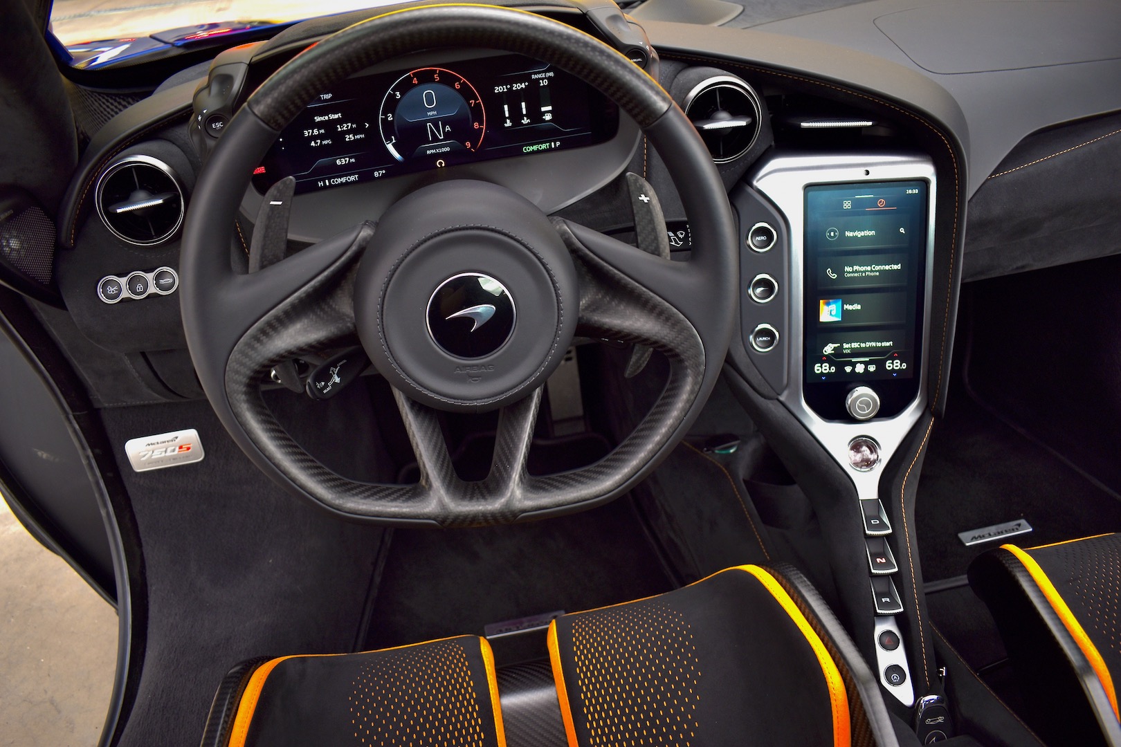 The McLaren 750S has the usual performance tech, with adjustable drive modes for all environments to configurable oversteer assists, launch control, and adjustable aero. The infotainment supports only wired Apple CarPlay, though.