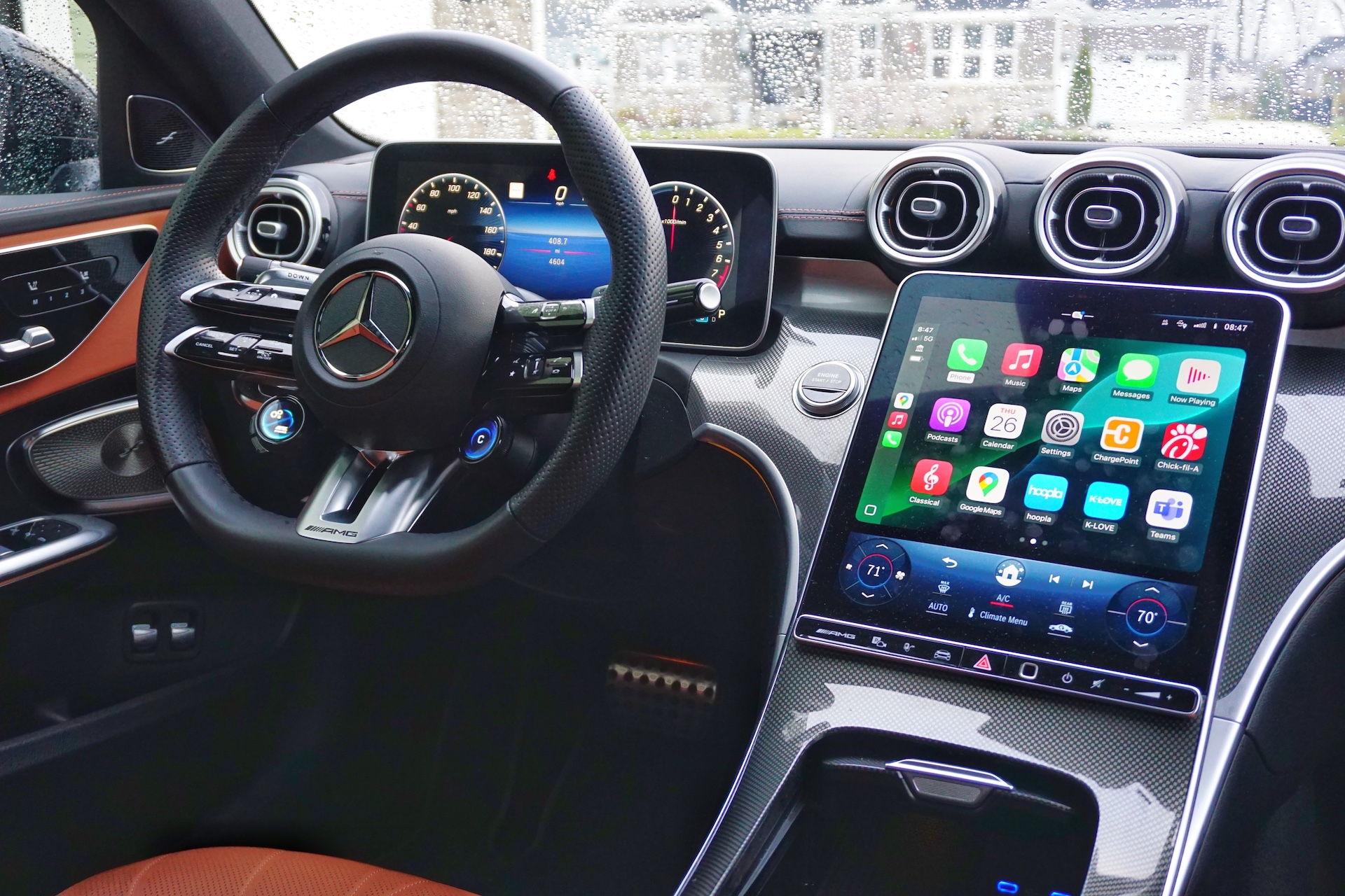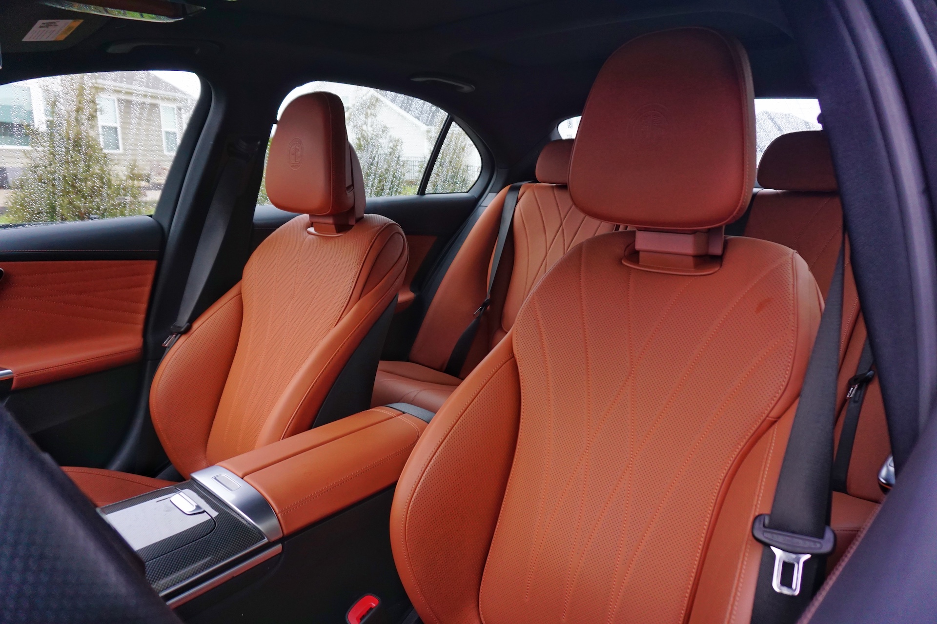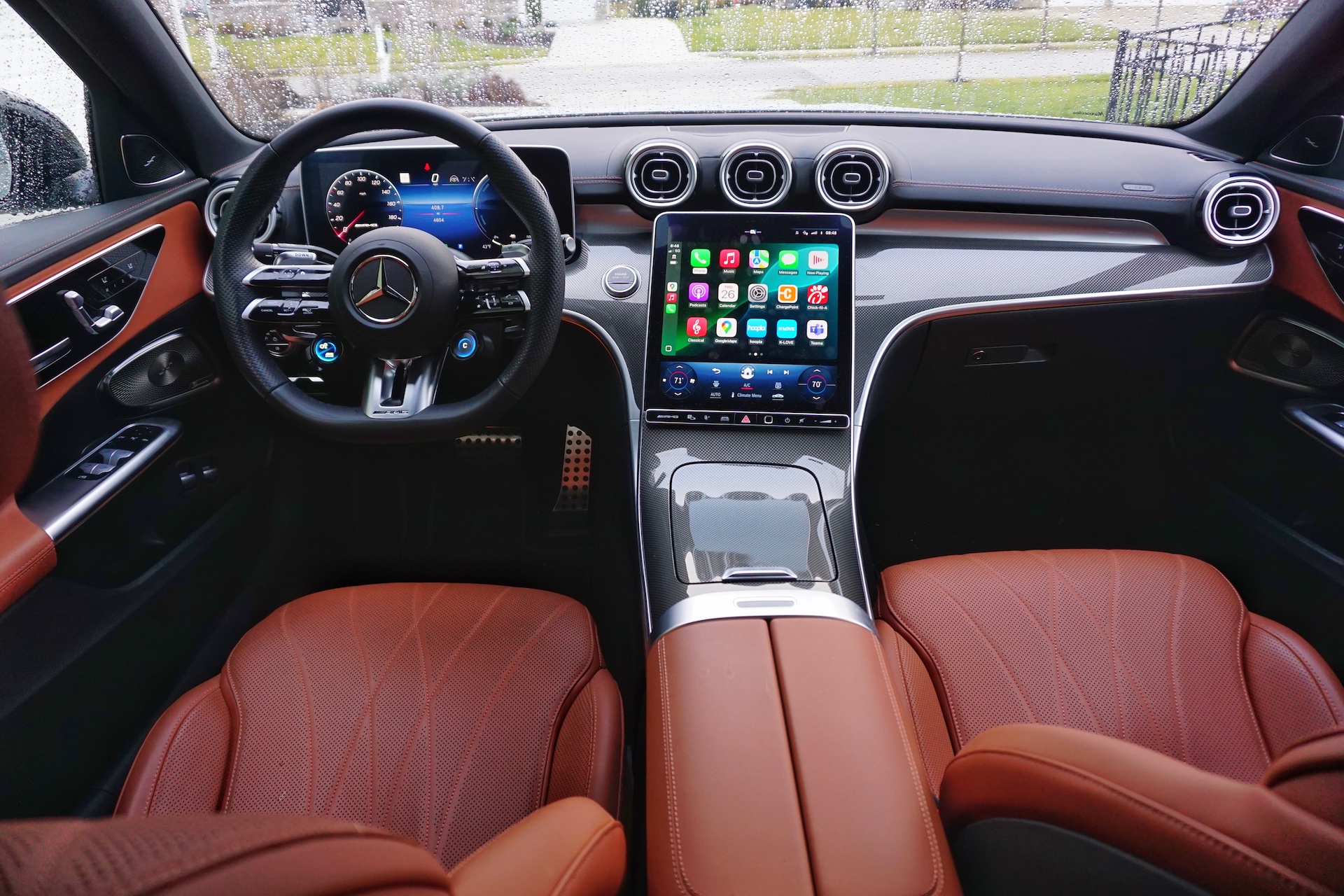 Things get better inside, with a sleek and driver-oriented cabin as well as a phenomenal steering wheel. Mercedes-AMG makes some of the best-feeling, chunky wheels in the business, and they are a joy to operate whether you’re cruising around town or beating up a country road. The seats are well-padded and supportive and can be customized in any way you’d possibly want. If you’re taller or wider than average, entry into the vehicle can feel a bit low and tight. Moving the seat back and the steering wheel forward helps, but it mostly feels like there isn’t enough space between the A and B pillars. It’s the same story for the backseat, where you’ll struggle to fit if you’re more than six feet tall.