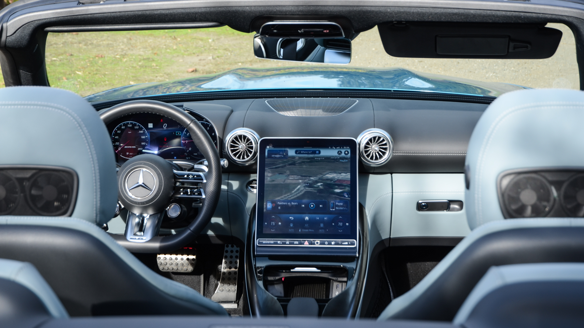 If there’s an area where the SL43 doesn’t feel quite up to SL standards, it’s inside. Visually, the cabin is gorgeous, with a waterfall-style infotainment system and center stack, wonderful seats, stylish aviation-inspired air vents, and a sporty-looking steering wheel. And, for the most part, it’s a lovely place to spend some time. However, there are a few materials that would feel subpar in a $40,000 C-Class, making them feel incredibly out of place in a six-figure SL. For example, both the gear selector and wiper stalks feel cheap, the air vents look cool but feel Hyundai Elantra-grade in the hands, and the piano black touch buttons on the center console have a squishiness to them that doesn’t feel very premium. It’s a far cry from the bank-vault-grade cabins of the R129. Also, with the roof up, outward visibility is atrocious.