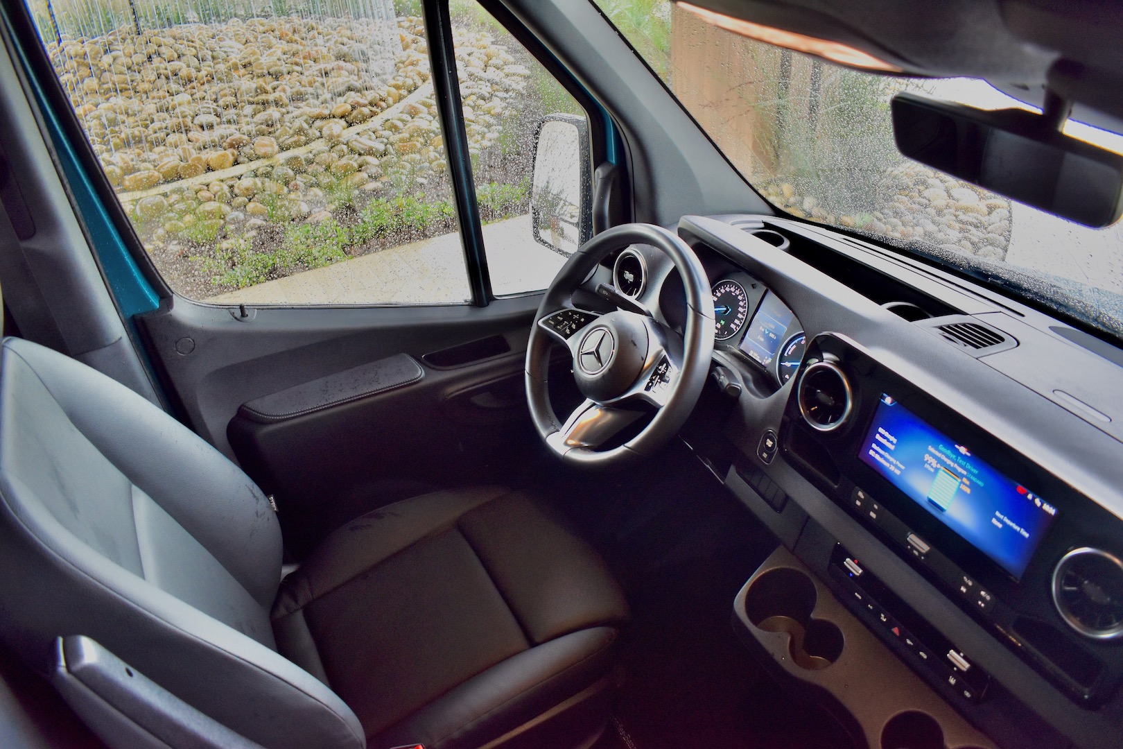You can’t call many commercial vehicles pleasant to drive, but the eSprinter is. Its manually adjusted seats are well-bolstered and supportive, and it rode well over subsiding coastal roads even with a minimal 441-pound test load on board. Its quiet electric drivetrain reduces cabin noise at all speeds, which only peaks on the highway with a modicum of wind noise and some inescapable road noise. (It’s almost 7,000 pounds with you in it.) The stereo ain’t bad either.