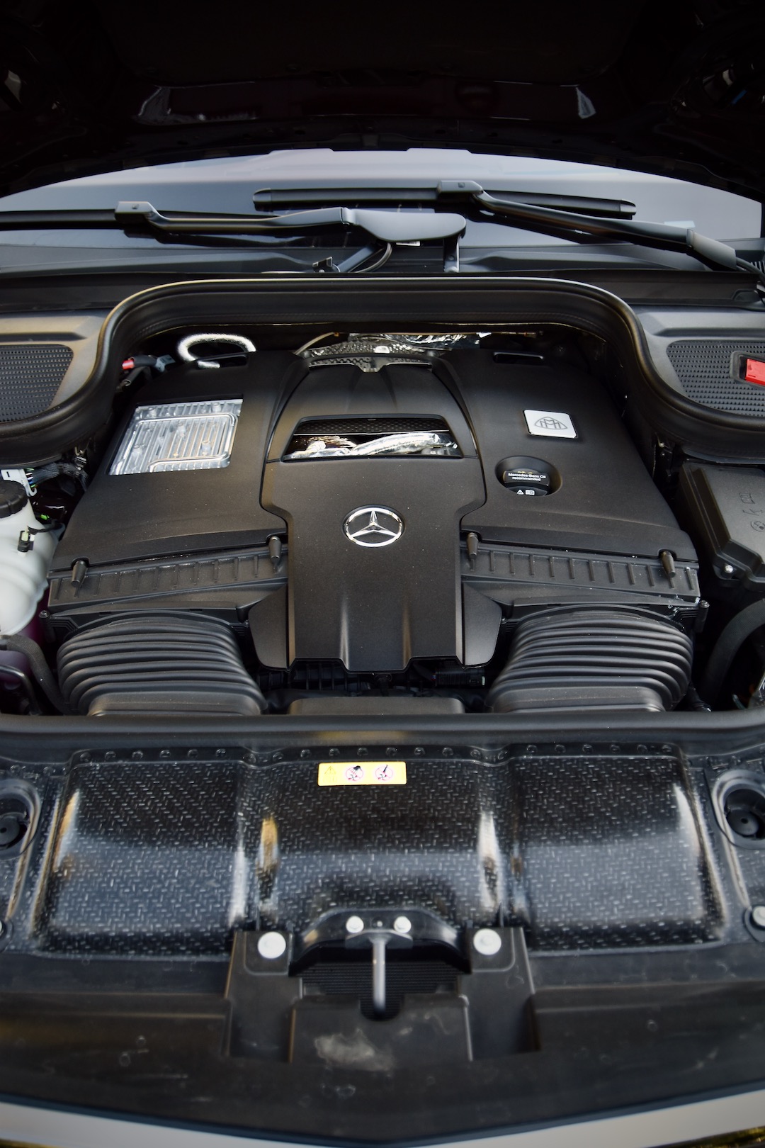 Despite a high driving position, the GLS provides an unexceptional view of the road around you. While its rear window is large enough, the sloping hoodline makes gauging where the corners are tricky. I leaned on the surround-view cameras and blind-spot monitors a lot, because mother of god does it have blind spots.