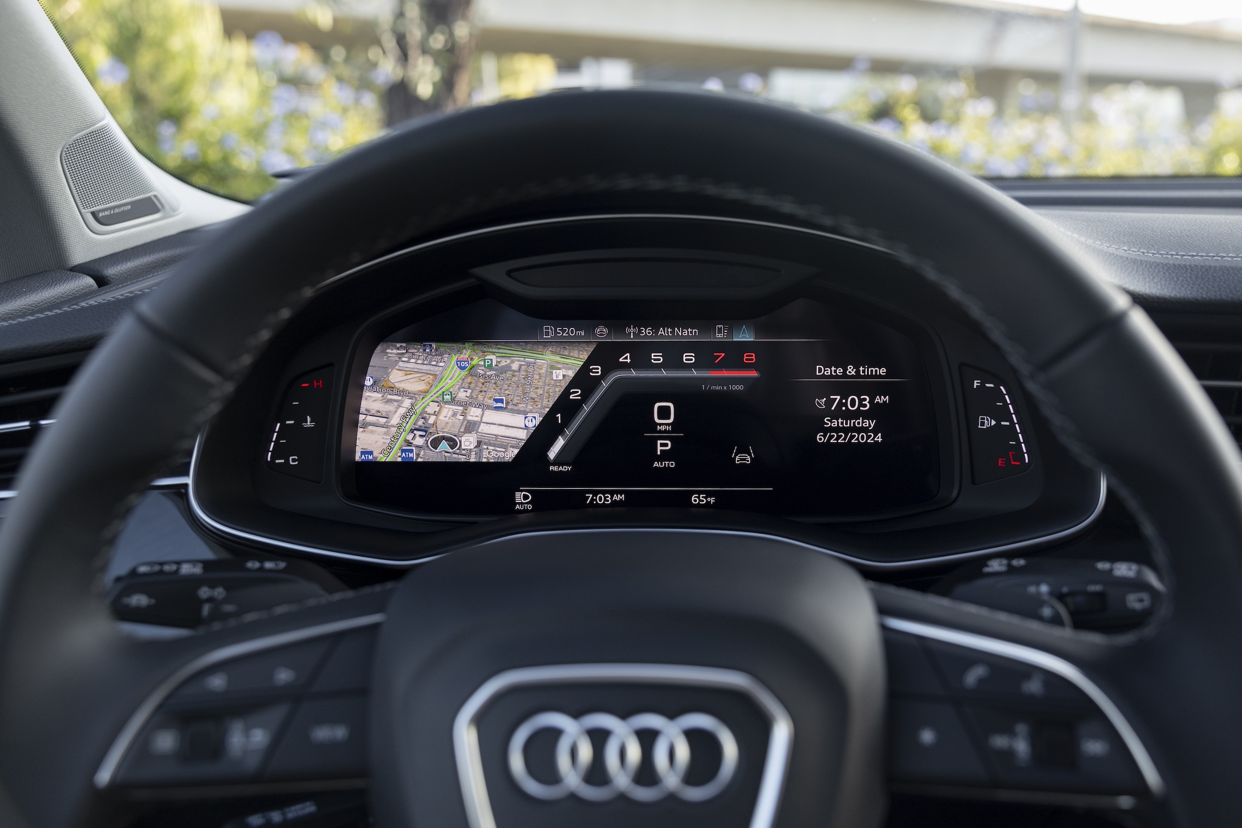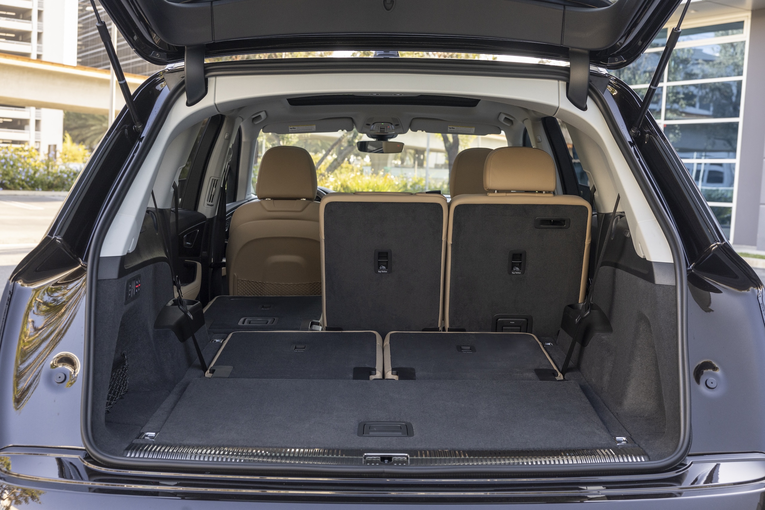 Second-row legroom measures 38.8 inches, which is 1.4 inches more than you get in the BMW X5 but 2.1 inches less than the Mercedes GLE, the latter of which is available as a seven-seater as well. Total all-seats-down cargo capacity comes in at 68.1 cubic feet, lagging behind the X5’s 72.3 cubes and the GLE’s 74.9, but everything is relative and the Q7 is still a big, practical vehicle built to do big, practical things.
