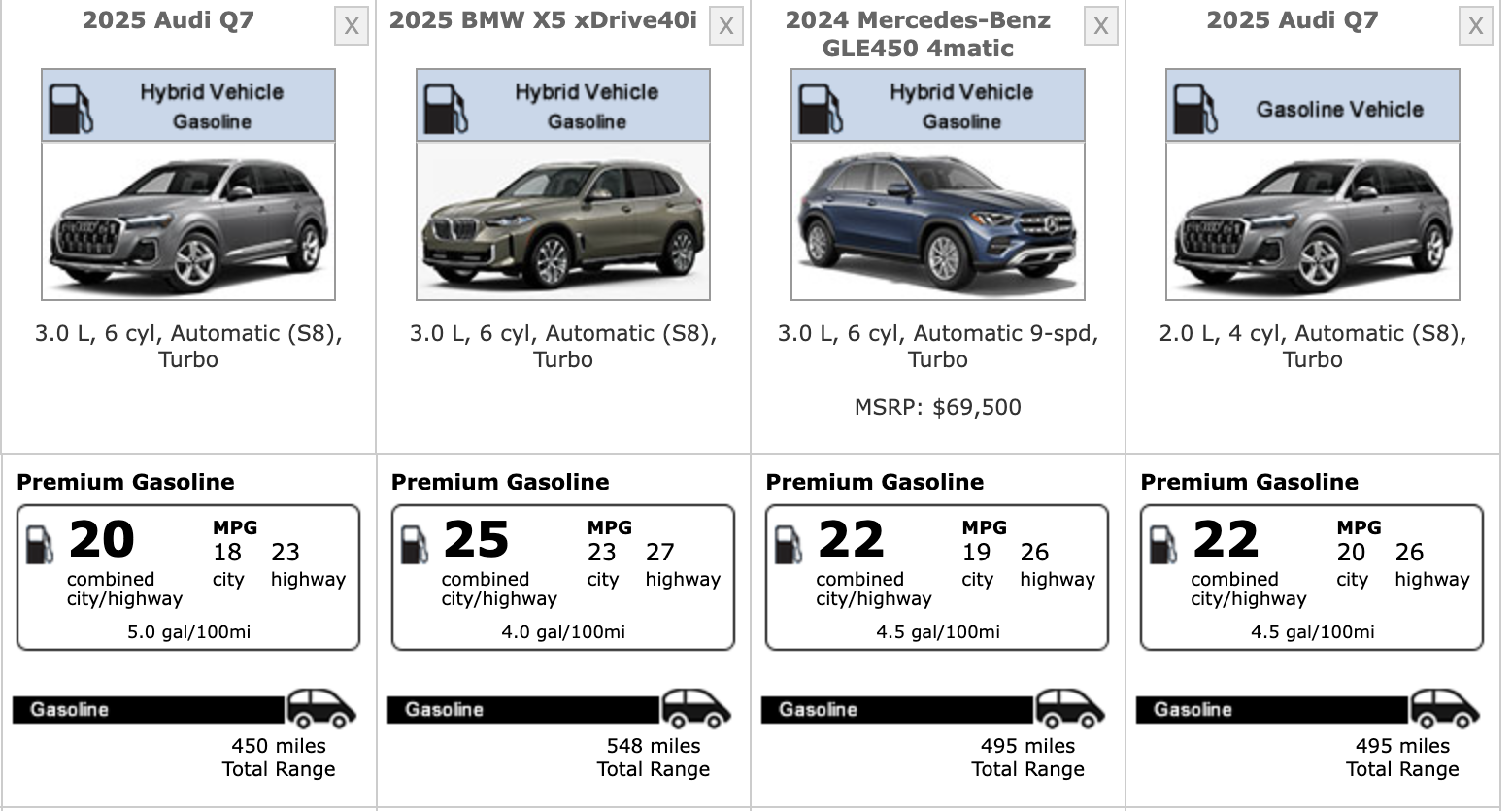The 2025 Audi Q7 starts at $61,795 which gets you into the base four-cylinder model but a V6 like the one tested starts at $67,095. Honestly, in a time where the average new car sold costs nearly $50,000, the fact that a seven-seat, six-cylinder Audi SUV can still be had in the $60Ks almost feels like decent value. Doubly so when you learn that the comparable BMW X5 xDrive40i starts at $68,000 and only seats five. The Mercedes-Benz GLE 450 4Matic, meanwhile, starts in the low-$70Ks.