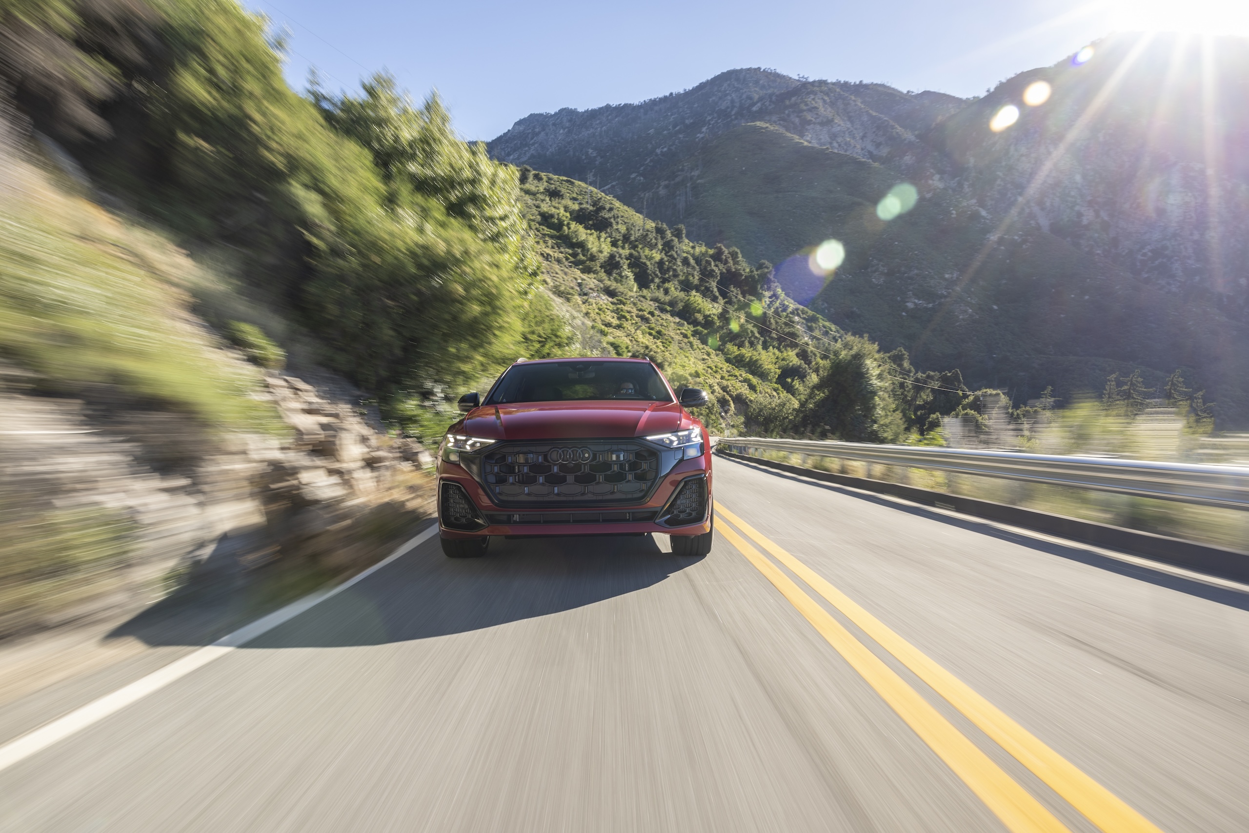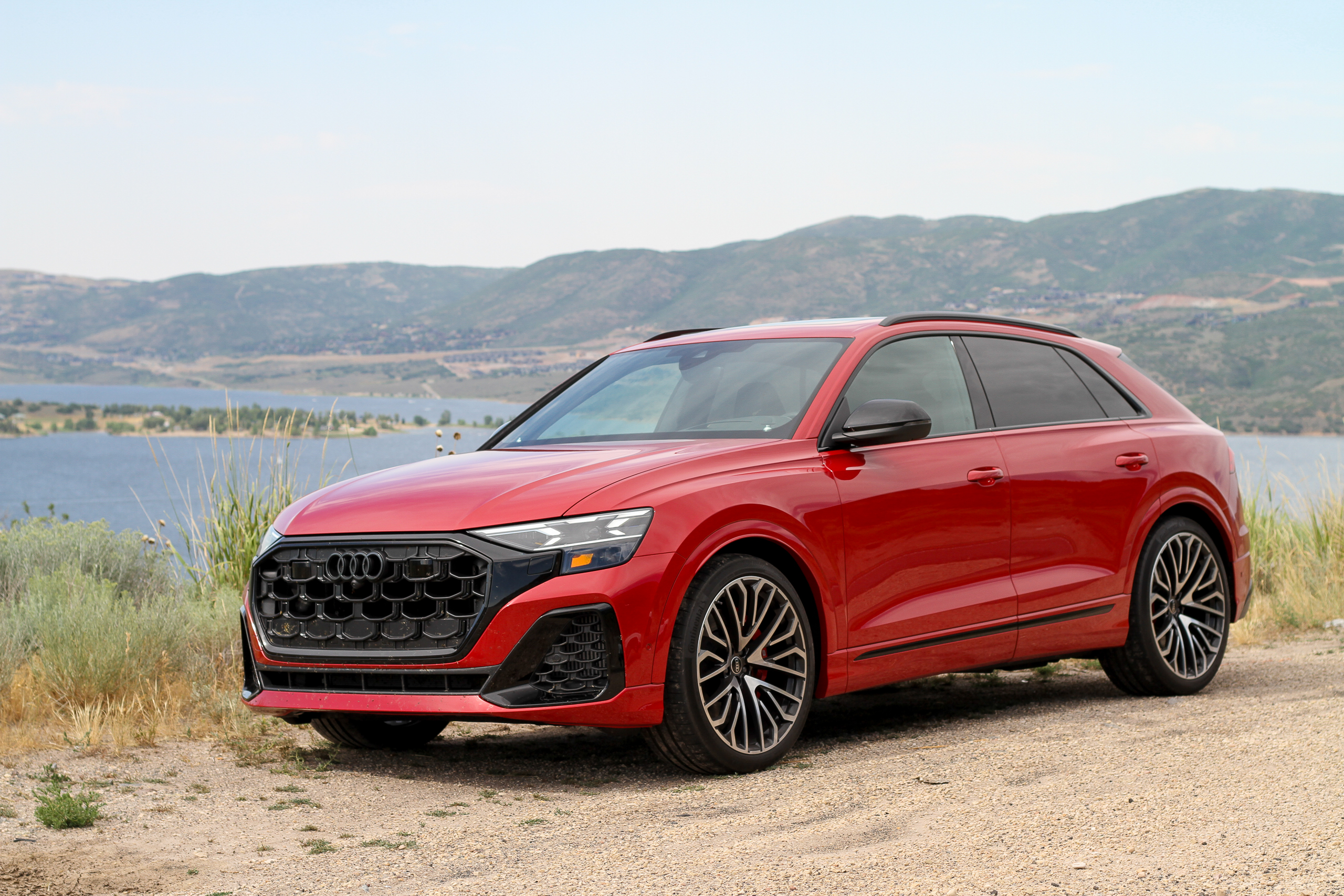 Style-wise the Q8 is, far and away, the best-looking “coupe” SUV out there in that it doesn’t look like an SUV that’s been surgically given a hunched back. It actually looks like its own thing, like it was conceived to be that shape from the start. Boxy fenders and a blacked-out section between the taillights hark back to the original Audi Quattro, a vibe that’s in full effect in this example’s shade of Chili Red. For 2024 onward, the grille has been reworked, air intakes in the lower front fascia are bigger, new wheel designs range from 21 to 23 inches, and both the front lip and rear diffuser are new.