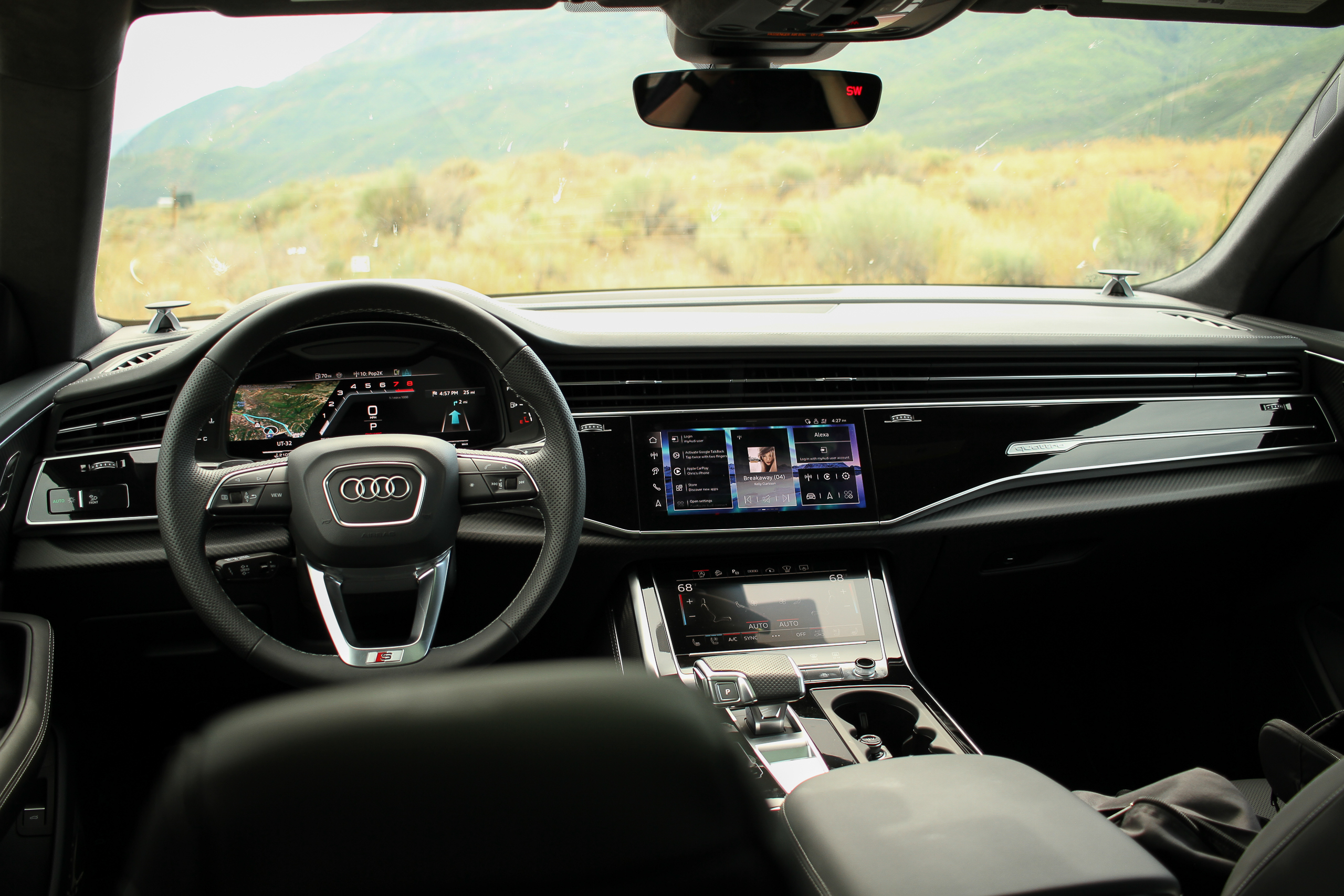 That subtle, solid beauty carries on inside. Clean, classy surfaces and attractive, easy-to-use screens are underscored by a new matte carbon twill inlay. It’s a nice vehicle to house four adults on a road trip since the Q8’s back seat is reasonably spacious, and despite this being a slopey-roofed “coupe” SUV, I found ingress, egress, and headroom back there to be perfectly sufficient.