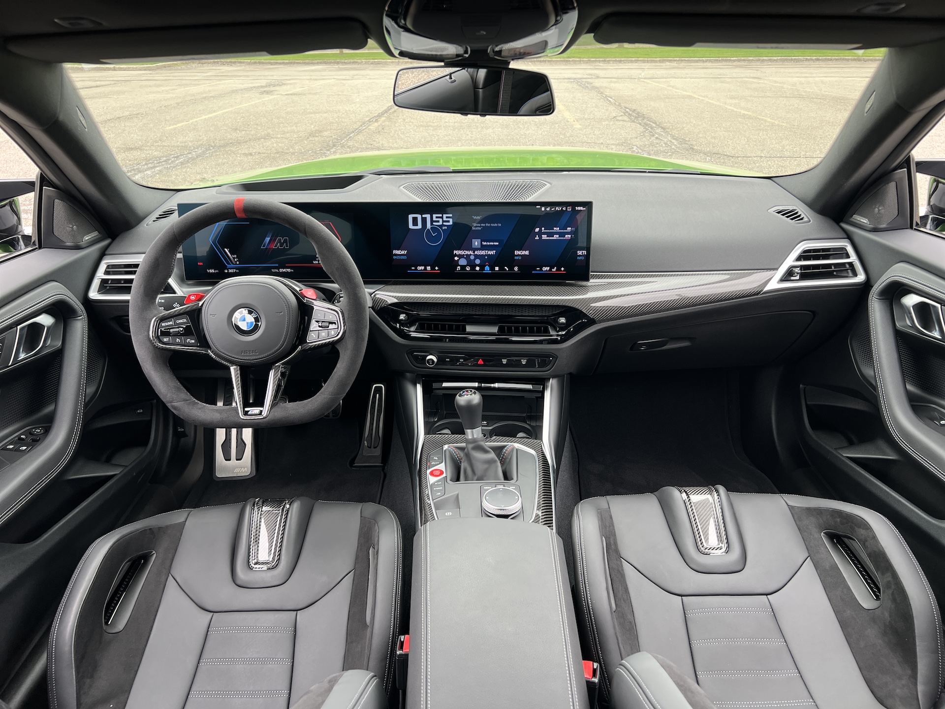 Although the steering wheel is undoubtedly comfortable, it also felt laughably large in such a compact setting. Some might take issue with the carbon fiber seat bottom inserts (“crotch destroyers,” said a friend), but those were actually less aggressive than the bolstering.