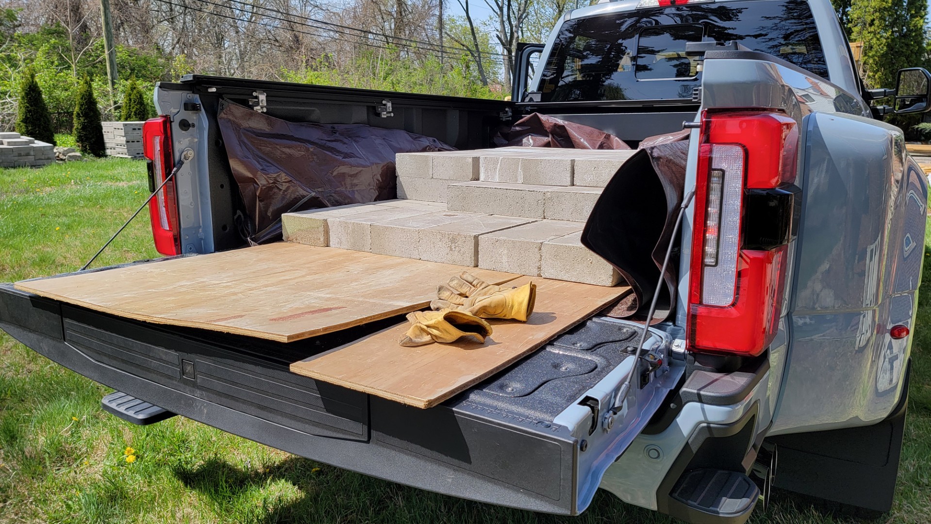 On paper, the truck can do it. But there’s just one problem: I have to load them in there somehow, and unlike mulch, concrete blocks will indeed beat up a truck bed. With the tarp still in place, I put down a piece of scrap 4×8 plywood to protect the bed and tailgate, then set about loading nearly 150 solid blocks of concrete into the back of the Super Duty, by hand, one by one. I was careful not to let any of them careen into the wheel arches as I muscled them into place, periodically checking in with Onboard Scales to make sure everything was going to plan. It was.