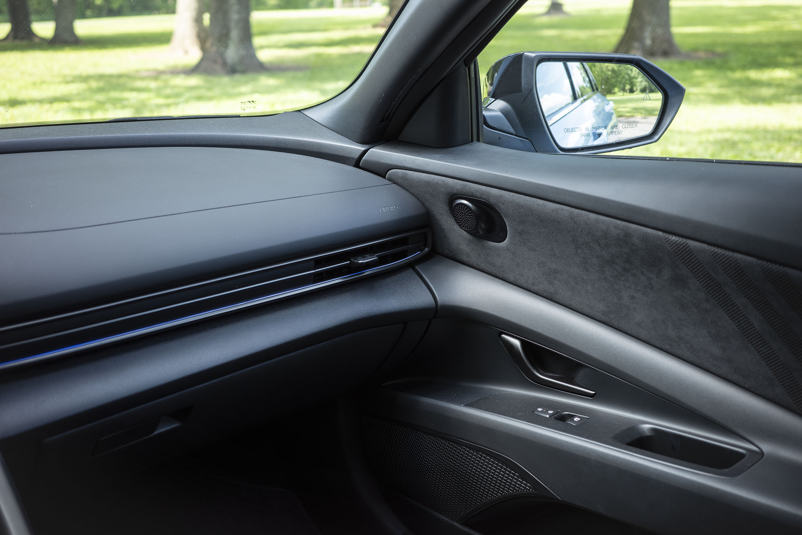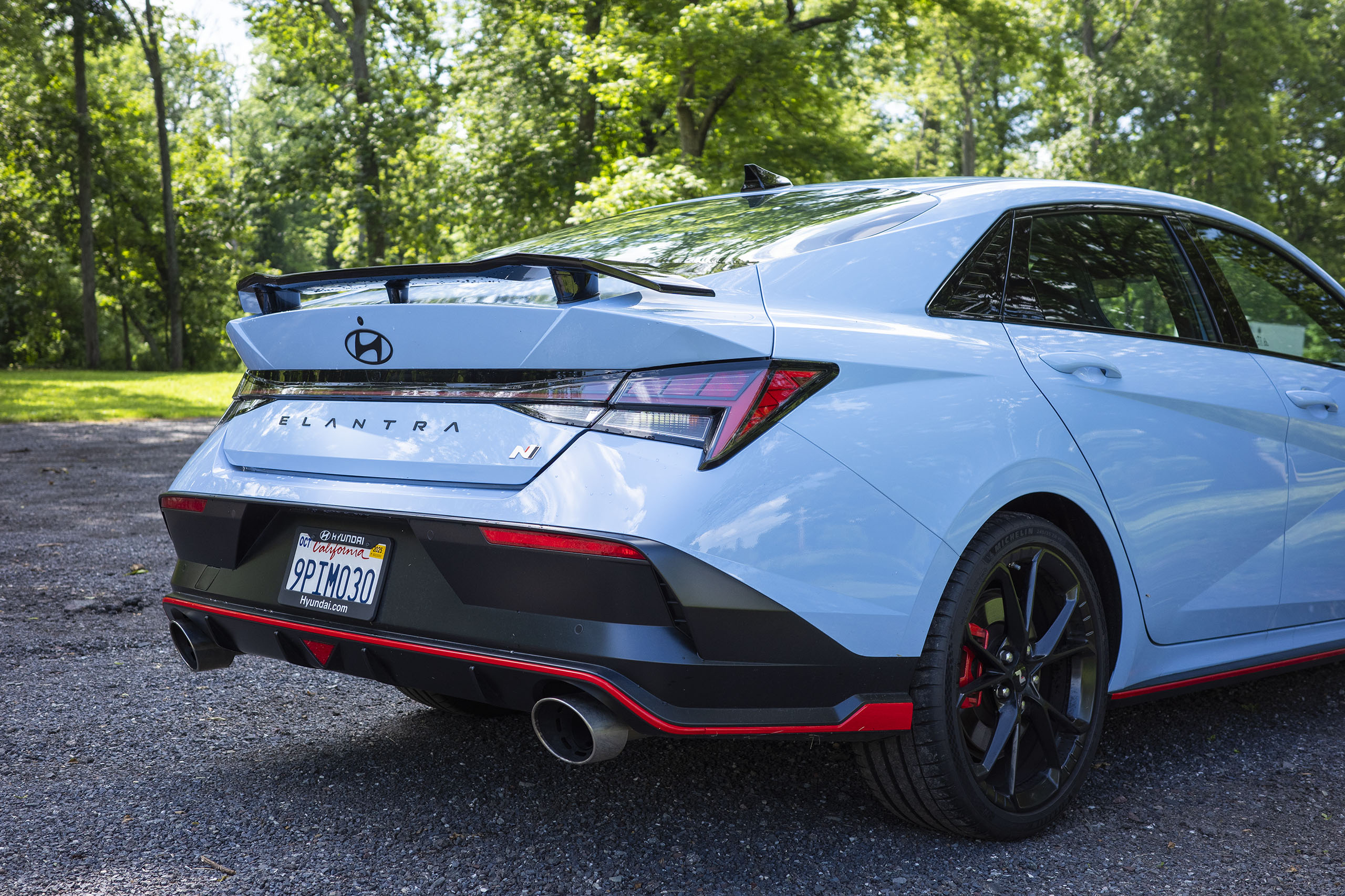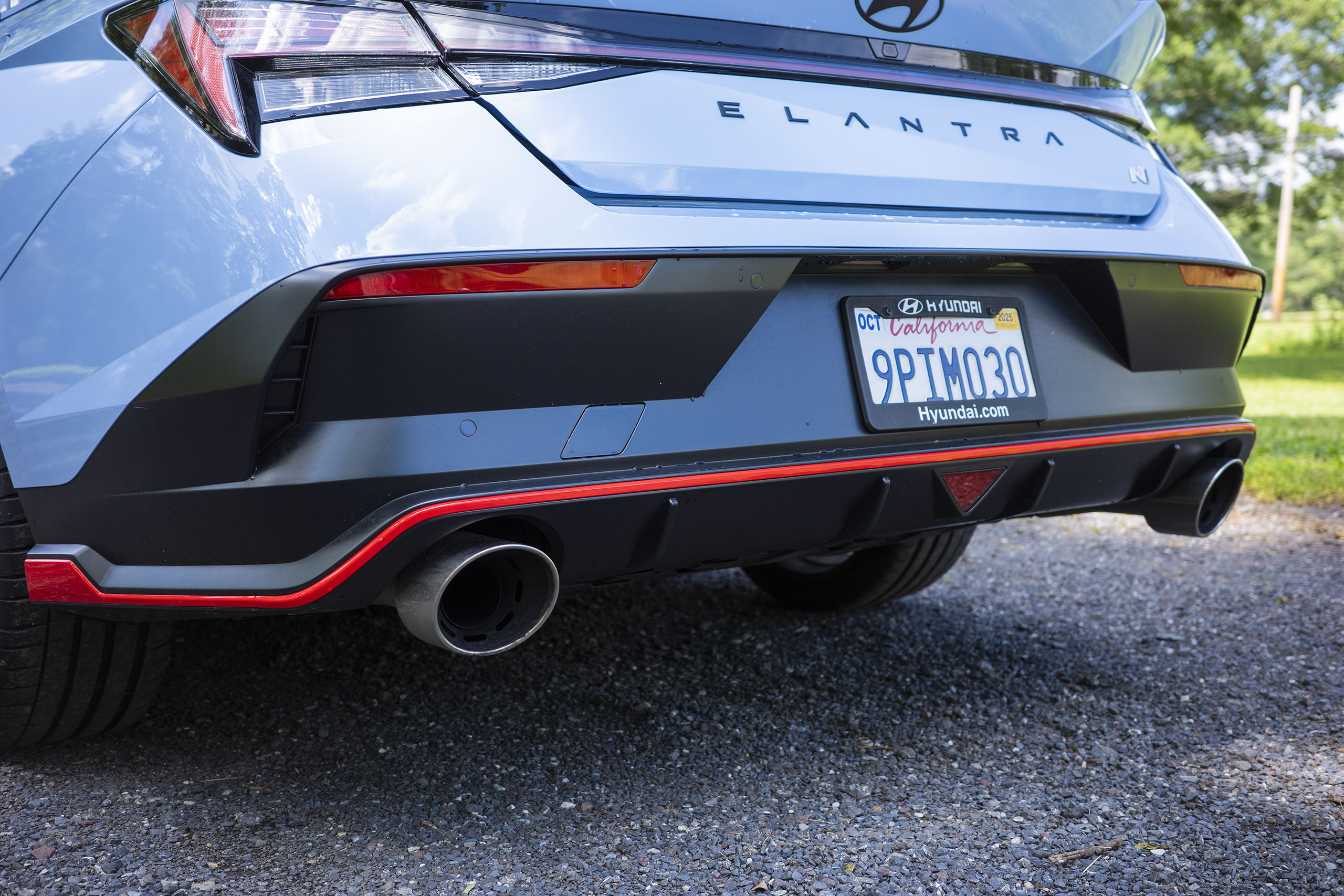 Still, I’ve never been a huge fan of the way this car looks. I won’t knock it for that—taste is subjective—but when I see it, I just get the sense Hyundai‘s designers didn’t want to stop. You have red lipstick around the bumpers and side sills; matte black pops of trim that unfortunately look pretty cheap up close; and a rear deck so pointy you could cut yourself on it. That’s a criticism you could levy at the regular Elantra, too, of course, but the N only amps up the aggression.