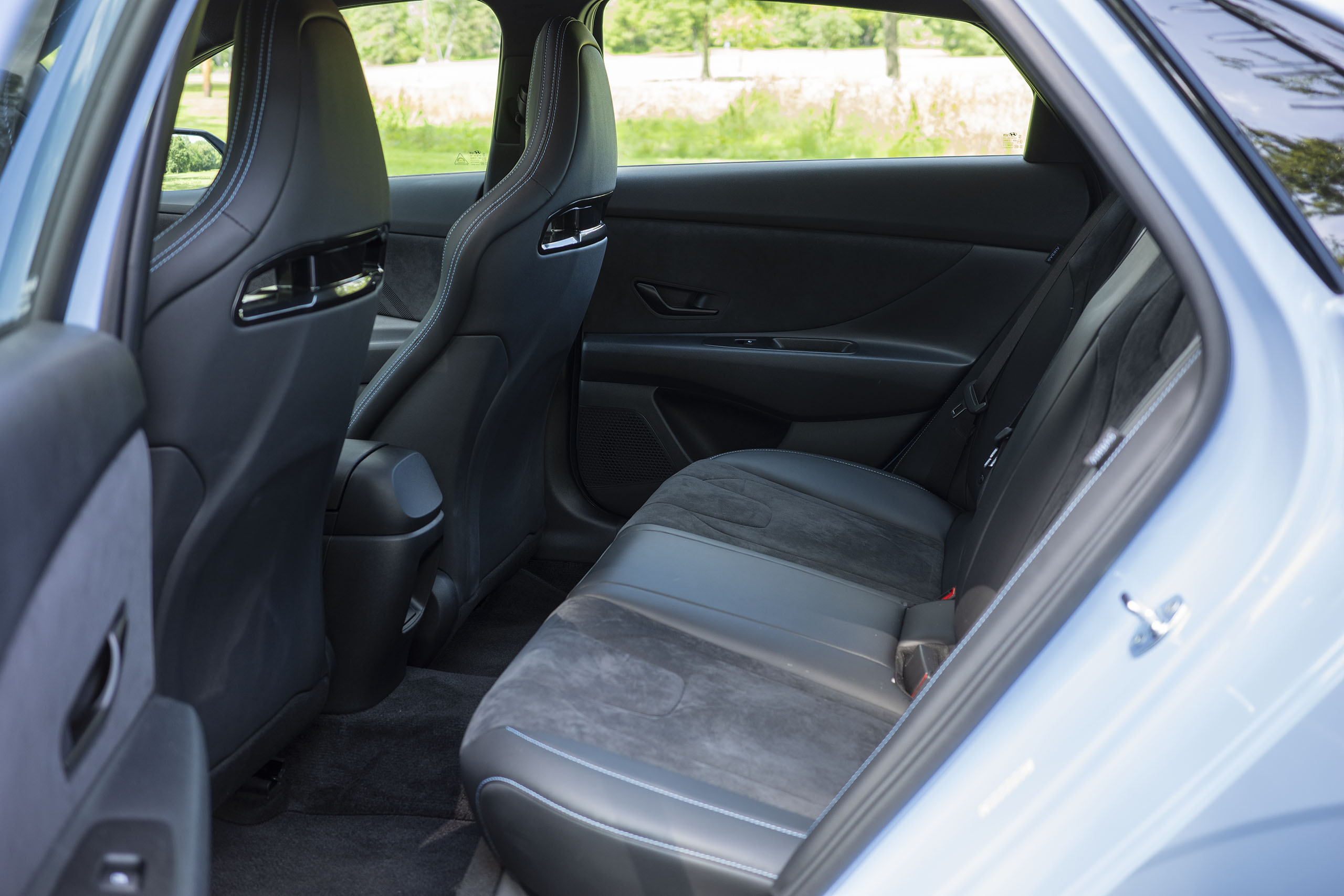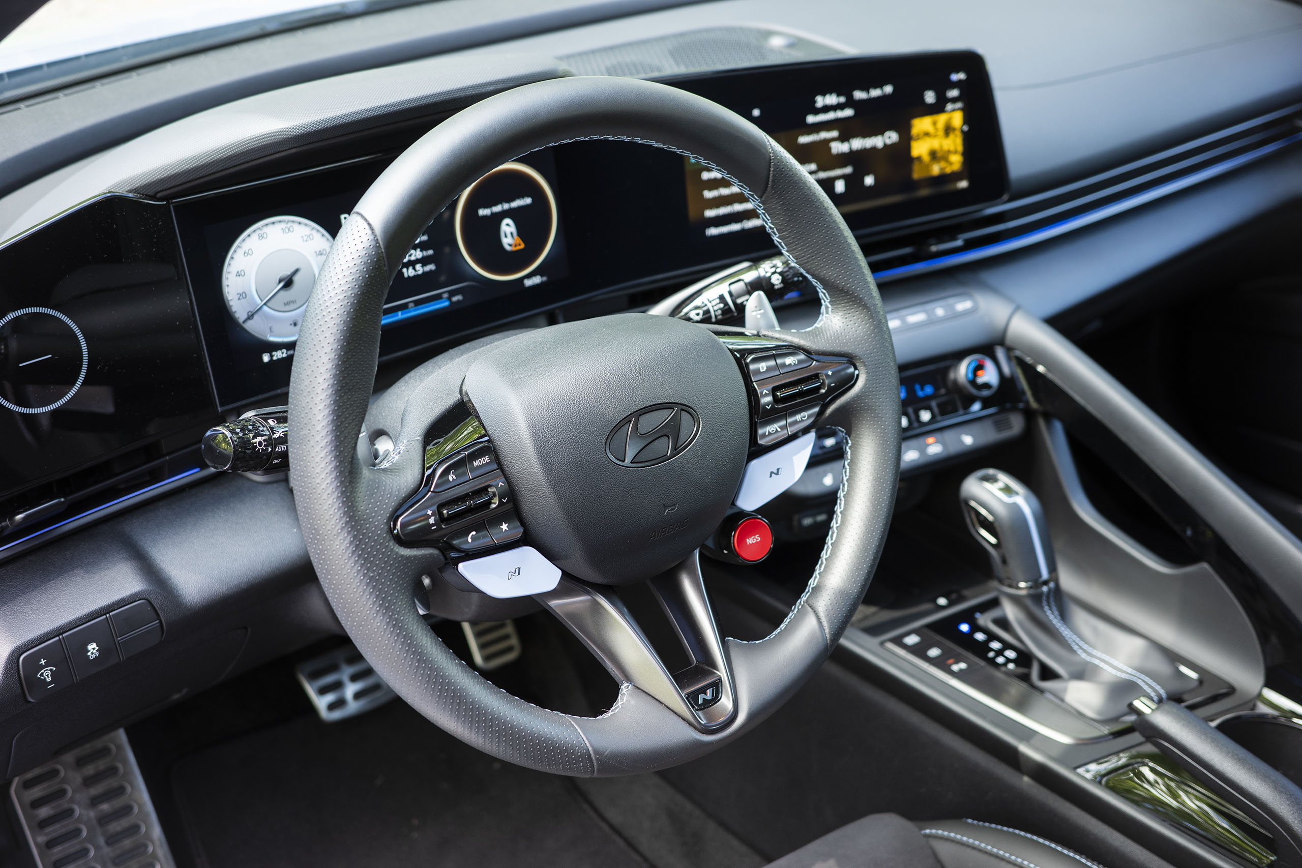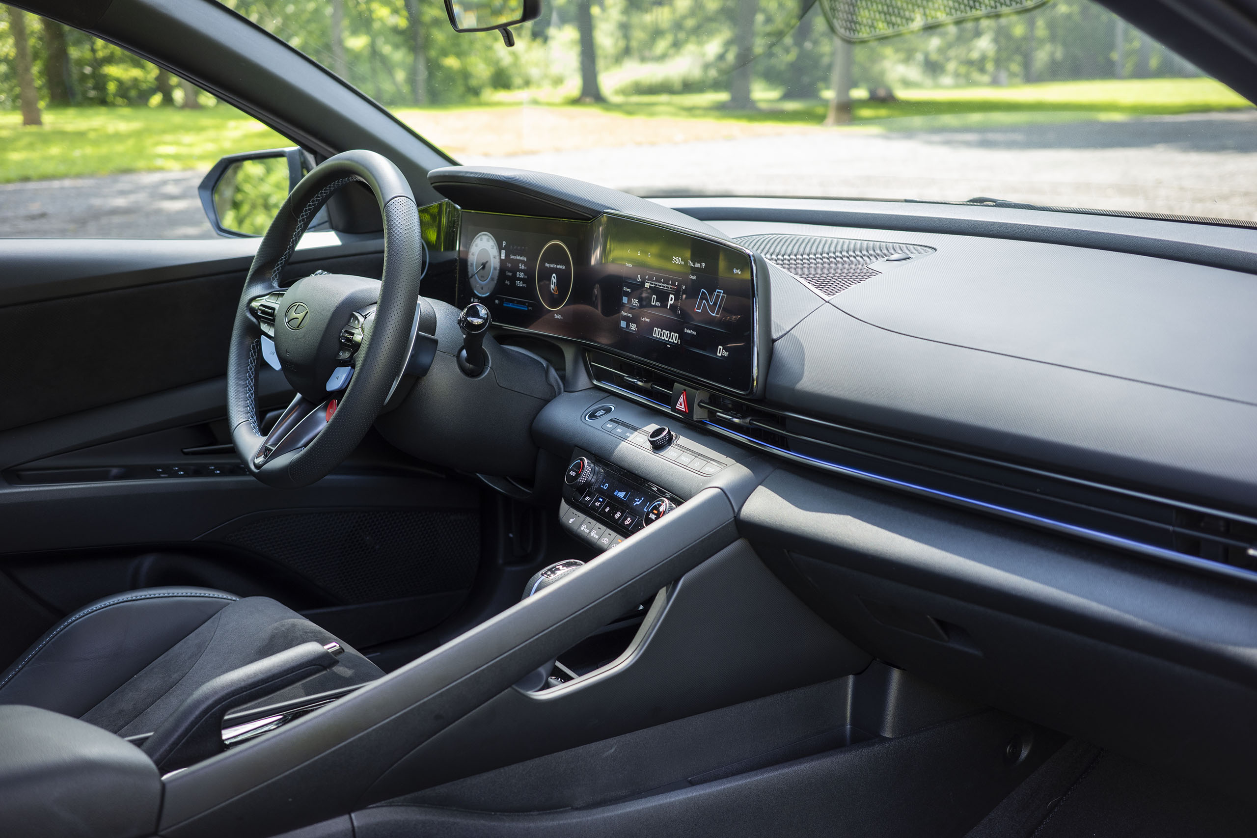 Inside, the Elantra N is very modern, very tech-forward, but also ergonomically sound and surprisingly roomy. Like, really spacious. I could easily fit behind myself in the rear seat, with plenty of room for my head at 5’10.” This is something that also truly impressed me about the Elantra’s cousin, the Kia K4, though the less performance-minded K4 didn’t have this Elantra’s well-bolstered Alcantara seats. (Yes—real, licensed-with-a-capital-“A” Alcantara.)