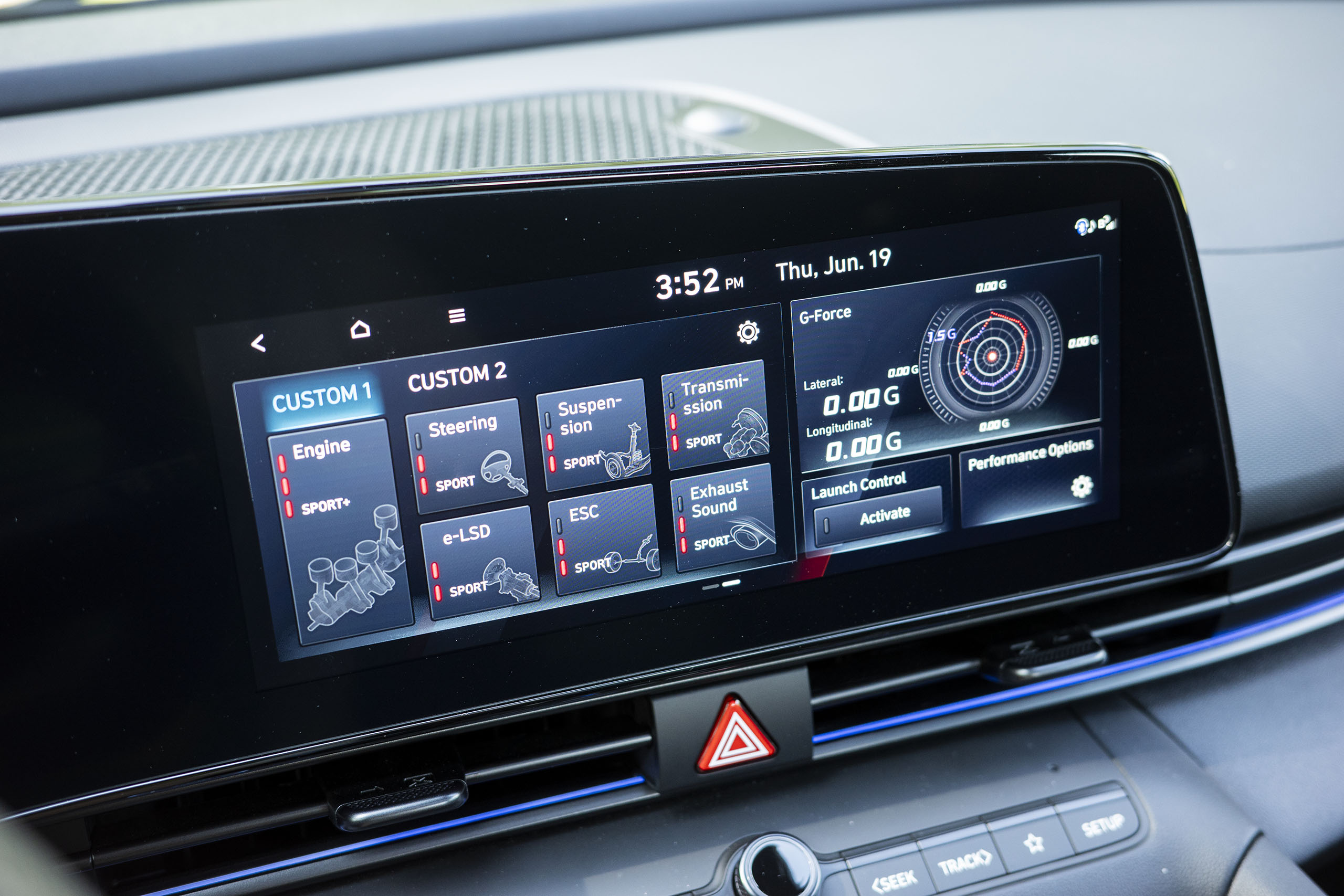 Otherwise, the Elantra N packs the same two-liter turbo-four it always has, making a Gentleman’s Agreement-approved 276 horsepower and 289 lb-ft of torque. That torque rolls in early, at 2,100 rpm, so you can amuse yourself even in moderate traffic. Nevertheless, torque steer is well mitigated thanks to a clever Integrated Drive Axle front suspension design. The exhaust pops and grumbles while vibrations from the powertrain are kept to a minimum, and I’m happy to report that you can turn off additional fake engine noises piped in through the Bose speakers.