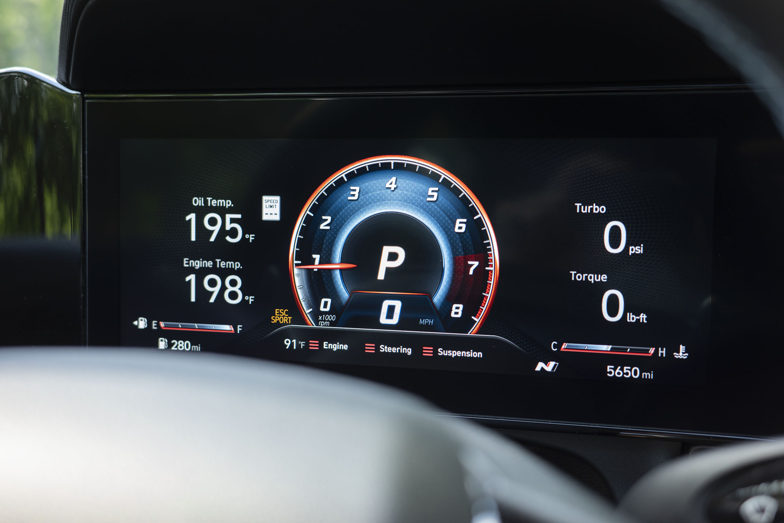 My Elantra N came with the eight-speed dual-clutch transmission rather than the six-speed manual. This adds $1,500 to the sticker and 110 pounds to the car; it also slightly bites into gas mileage, resulting in a 20 mpg city/27 highway estimation from the EPA, compared to 21/29 for the 6MT. I can’t speak to the quality of Hyundai’s manual, but with fewer automakers even offering the choice nowadays, I’m glad Hyundai still is.