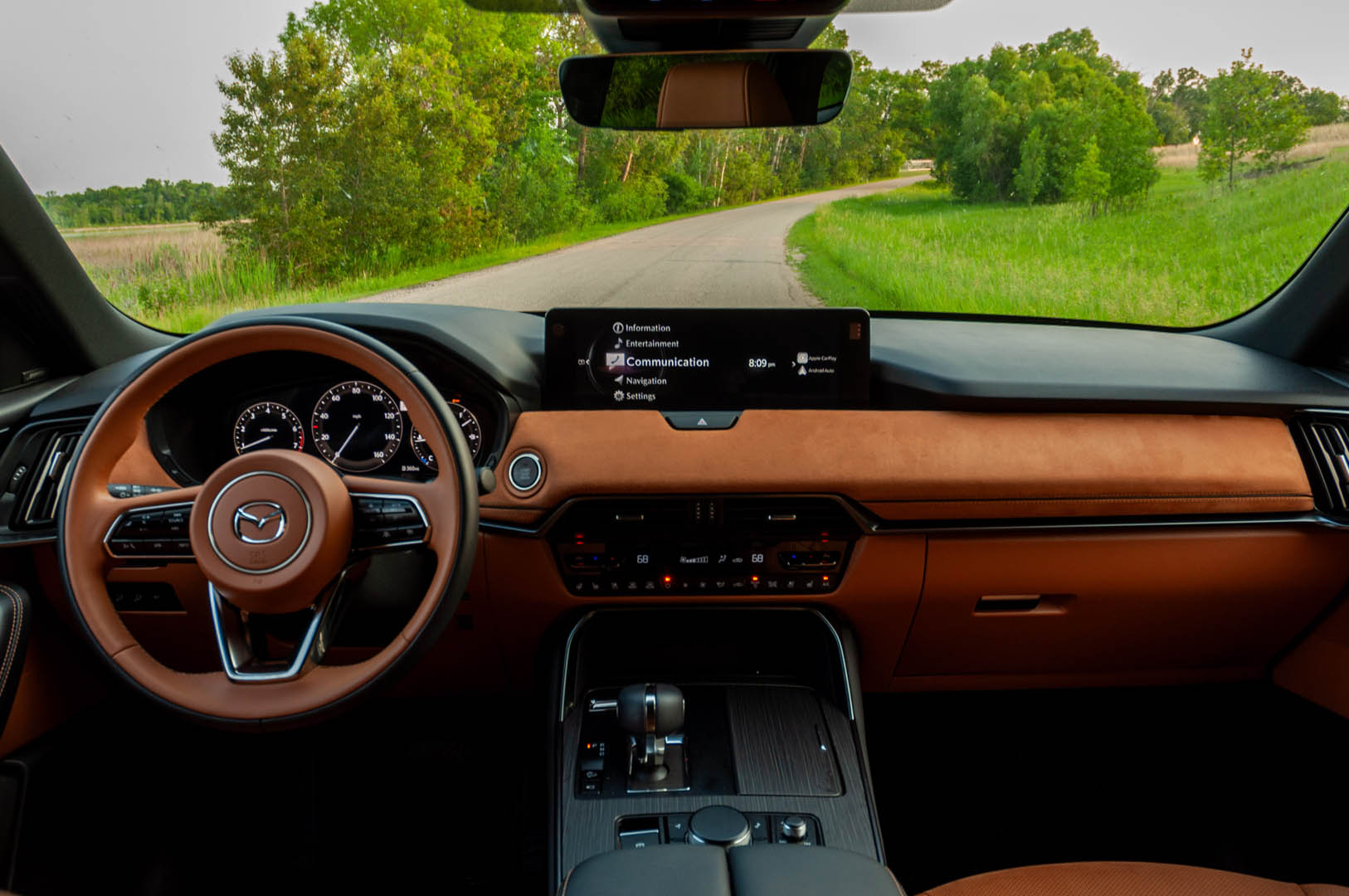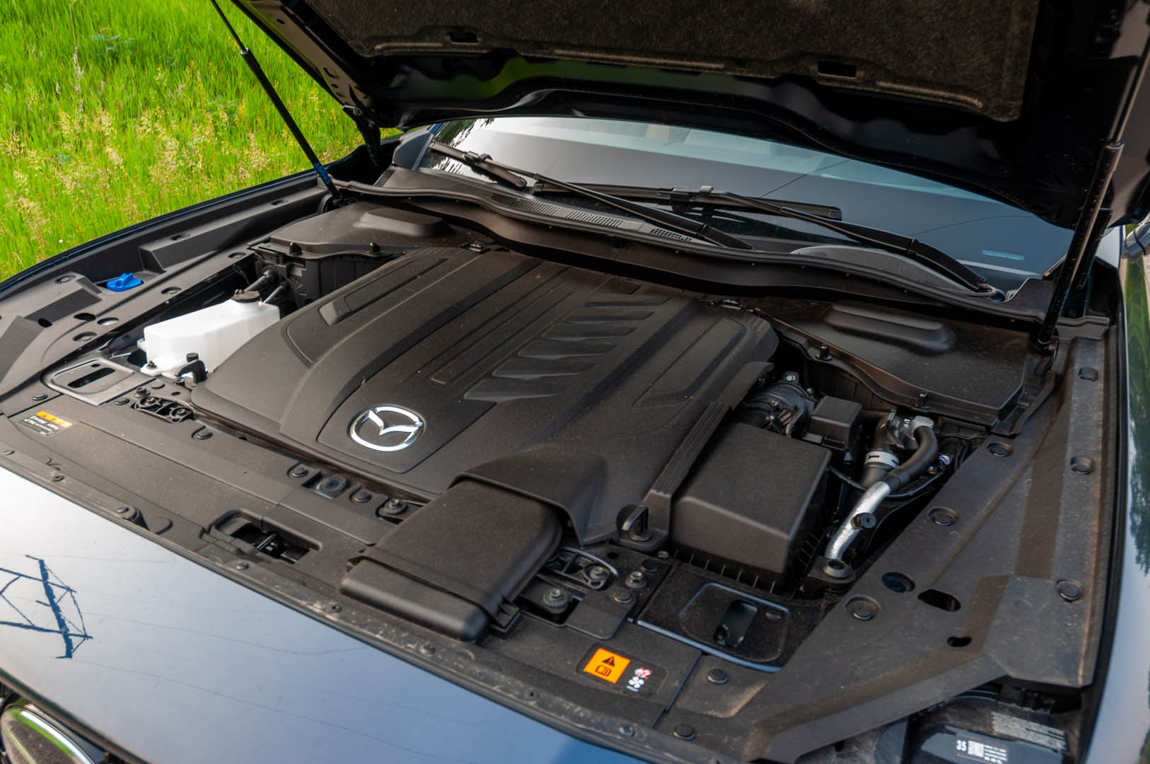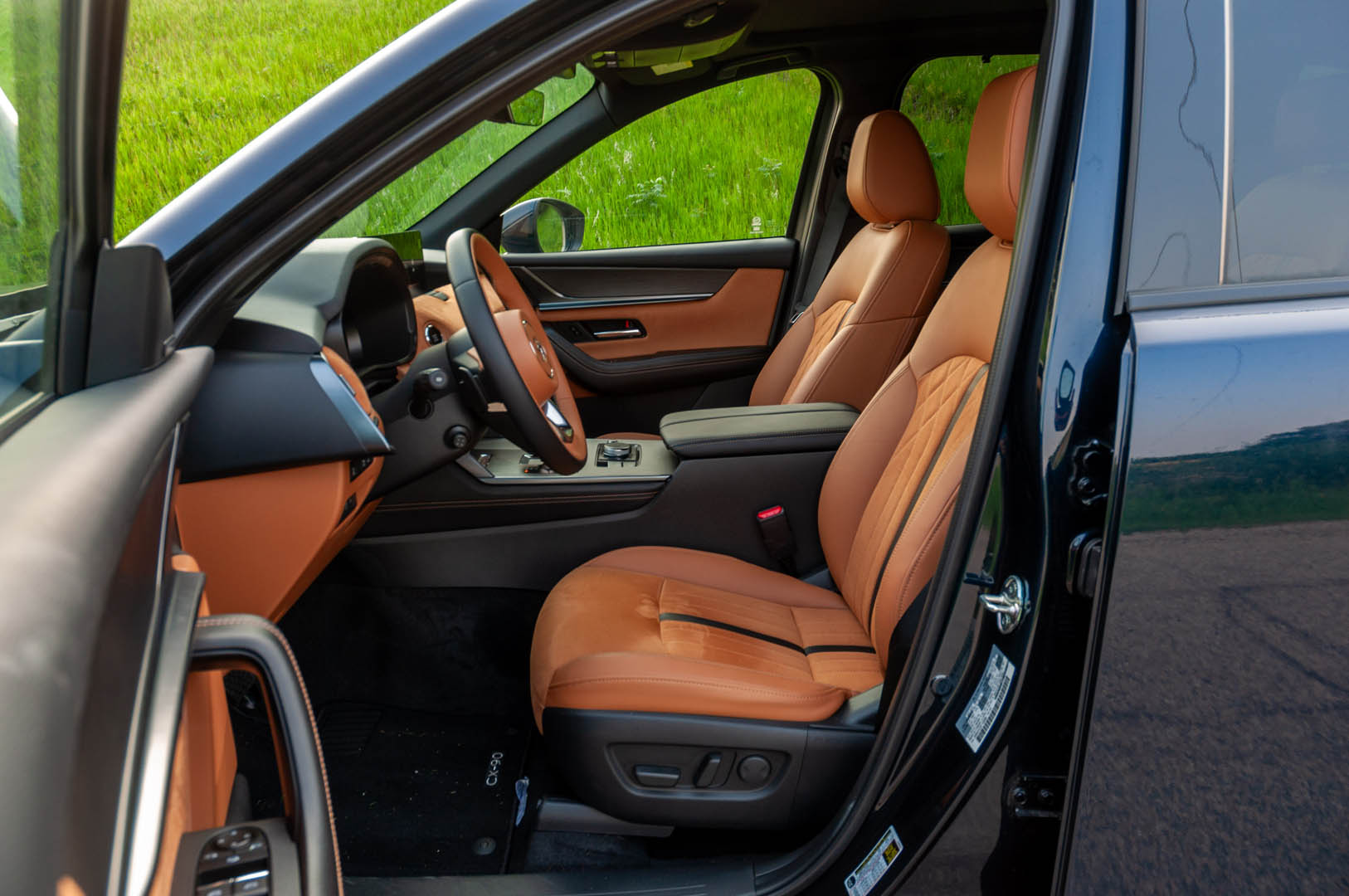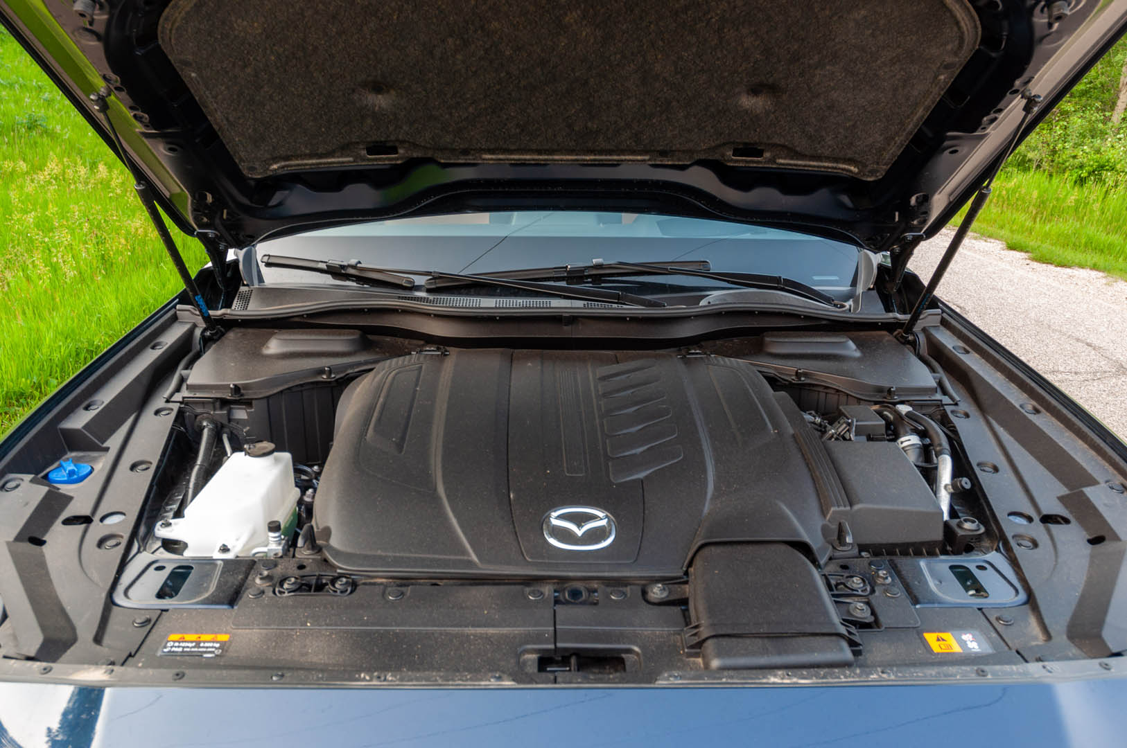 The fully loaded Turbo S Premium Plus model I tested had Mazda’s new 3.3-liter turbocharged inline-six with 340 horsepower and 369 pound-feet of torque. It’s paired to an in-house built and designed eight-speed automatic transmission and sends power to all four wheels. This engine is a gem with its smooth power delivery, windup, and barely a hint of turbo lag. The inline-six has a deeper growl than the ones from Stellantis and Mercedes-Benz, both of which sing at a higher pitch. The transmission is… fine. It’s not as smooth as the ZF-built unit in a Jeep Grand Cherokee L, and at times, the 1-2 or 2-3 shifts stutter while the torque converter locks up when cold. It smooths out once warm.