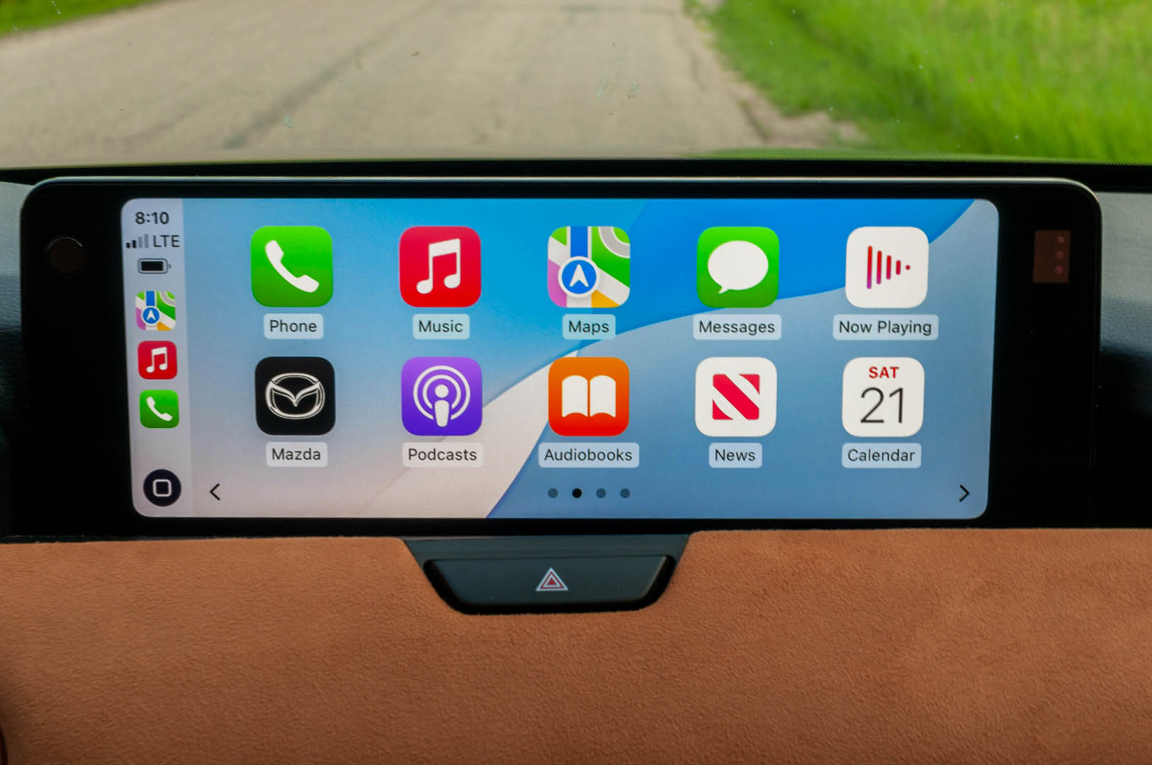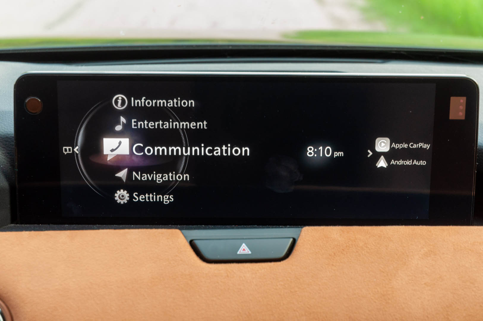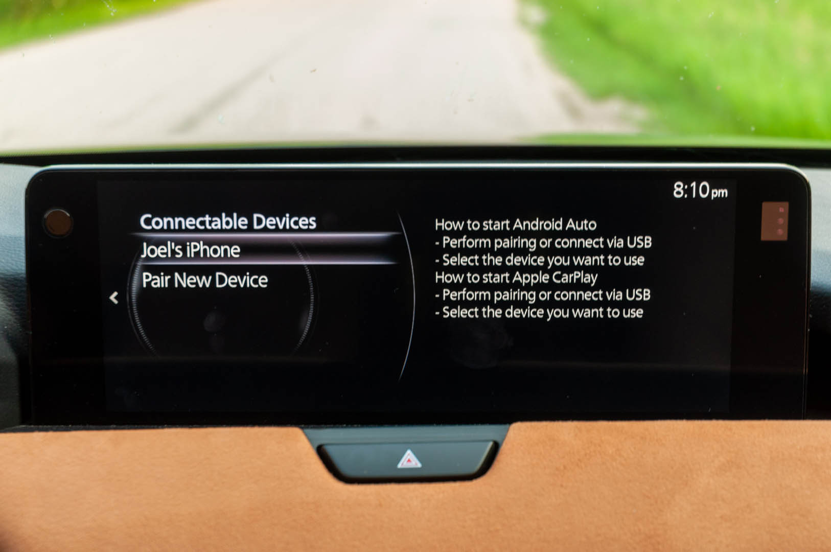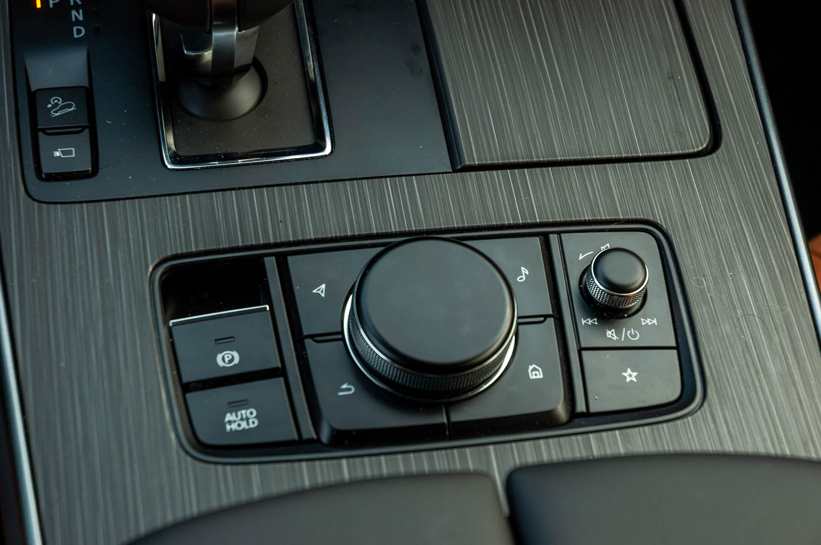 Inside, the horizontal dashboard design is simple and sits low, providing a good view out the front. The thin A-pillars don’t obstruct the view forward or to the sides. The controls are easy to use, featuring buttons and knobs for the climate control and audio system. The 12.3-inch infotainment screen, which is actually a touchscreen, is clunky to operate because Mazda still relies on an outdated rotary scroll wheel. A few functions in Apple CarPlay are the exception and enable the touchscreen itself, but even using Apple CarPlay can be annoying. You must initiate CarPlay every time the car is started, and it requires two clicks of the scroll wheel to get going. No other car on the market requires CarPlay to be started each time the vehicle is turned on. It’s not good.