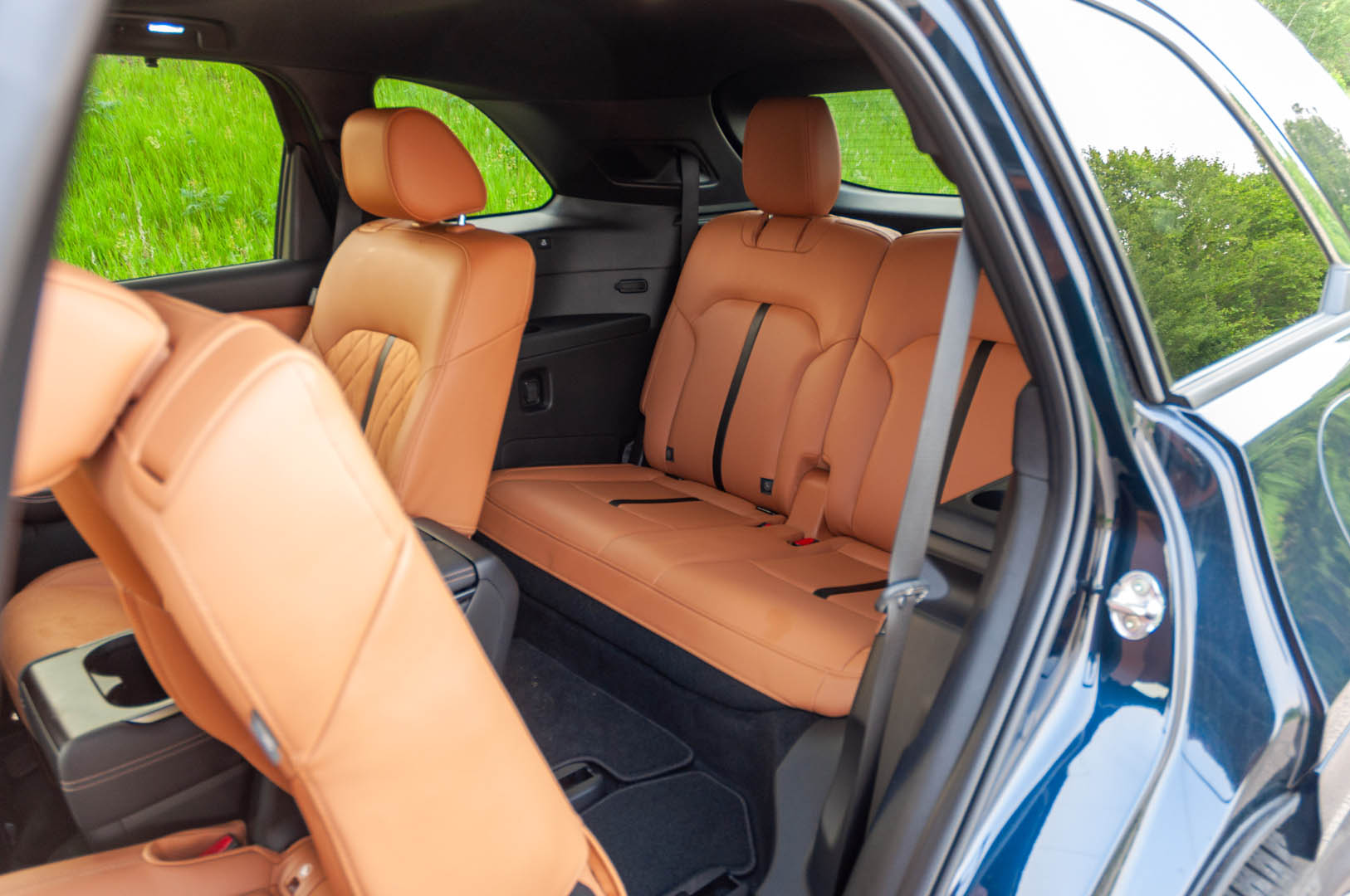 The front seat bottoms are a bit short, and I’m only 5-foot-10. The second row is stadium style, with occupants sitting higher than those in front. This is due to the packaging for the plug-in hybrid’s battery, but it carries over for the non-hybrid I tested. The third row isn’t as adult-friendly as in the Jeep Grand Cherokee L or Chevrolet Traverse, but kids will be fine. Just expect complaining and some horse trading for legroom between the back rows. My kids appreciated the second-row center console for snack storage on a road trip, and the second-row heated and ventilated captain chairs were a hit, too. Fit and finish are top-shelf and miles ahead of anything found in a Honda, Kia, Hyundai, or certainly Toyota. None of those competitors have suede or linen-like material with stitching on their dashboards.