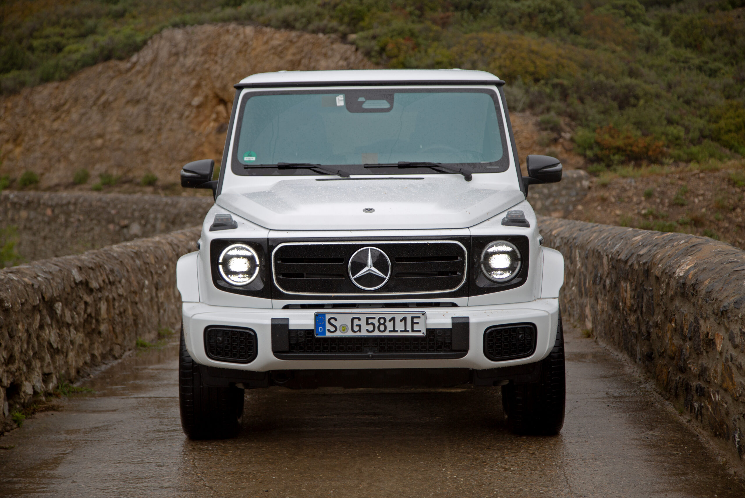 It’s the first set of turns where the G580 surprises. While replacing a heavy engine up front with a central battery pack suggests the EV G should handle better than its siblings, it leans into corners in a way that brings to mind a vintage G-Wagen; the body roll feels almost nautical, half a step behind the beat. The steering doesn’t help; it’s heavy, deliberate, and lacking in feel, making the car hard to place at speed on narrow roads. If you want a G-Class that’s fun on the street, grab the AMG G63, which now packs an available active hydraulic anti-roll system that gives it surprisingly nimble handling.