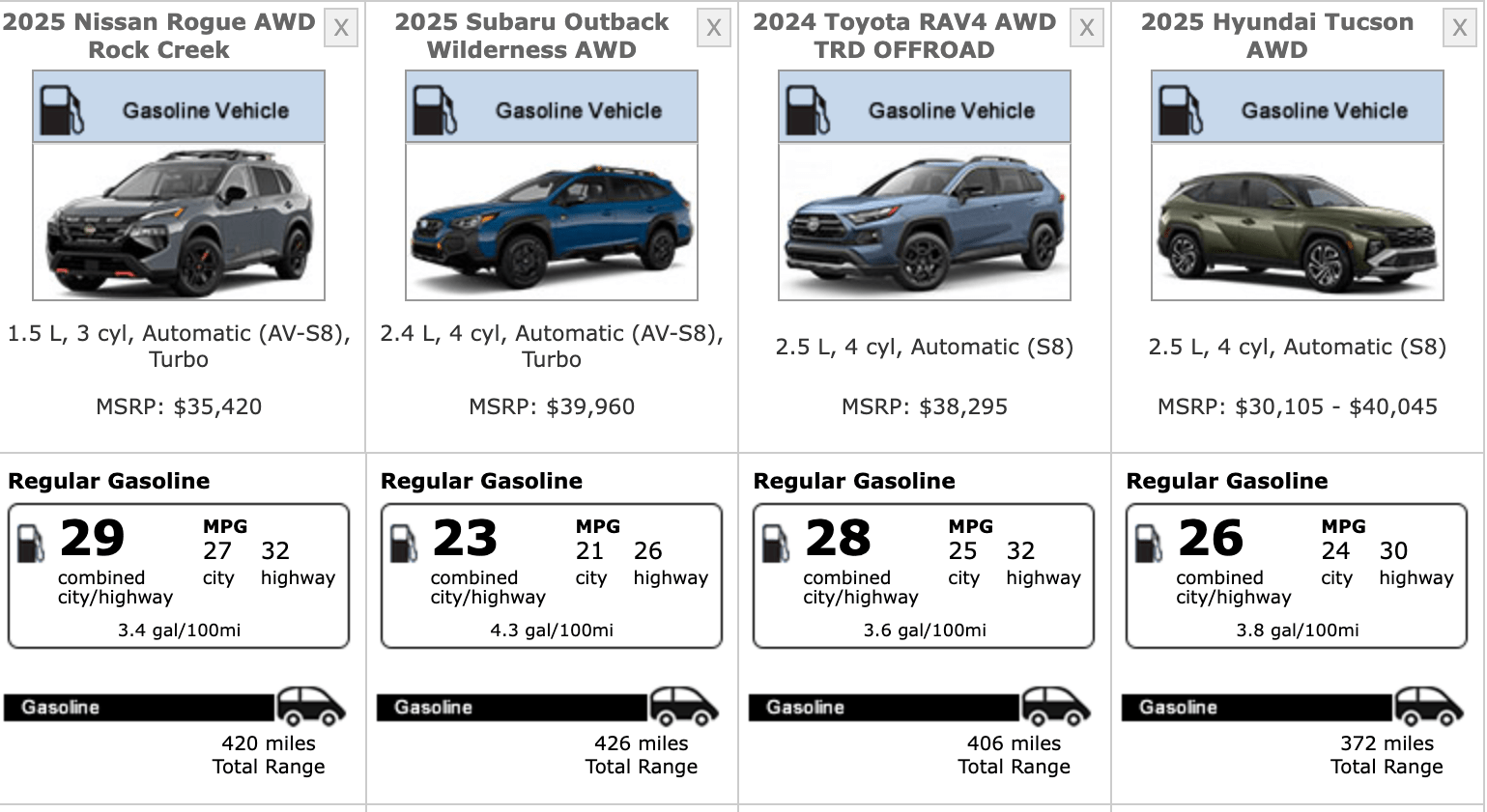 When it comes to efficiency, the Rogue RC outperforms most of its off-road-leaning rivals. Its 29 mpg combined rating is the best in this lineup, edging out the TRD RAV4 (28 mpg combined) and significantly ahead of the Outback Wilderness (23 mpg combined). The AWD Hyundai Tucson (26 mpg combined) also lags slightly behind the Rogue.