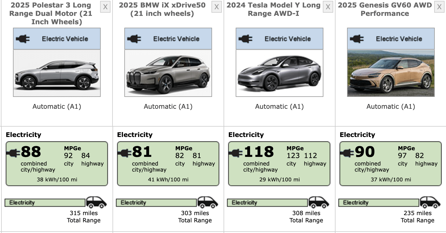On top of its aesthetic and driving excellence, the Polestar 3 is also pretty decent simply as an EV. This Long Range Dual Motor model’s 315 EPA miles beats its most direct competitors from what are arguably the EV leaders at the moment: the Tesla Model Y Long Range AWD, BMW iX xDrive50, and Genesis GV60 Performance which are rated for 308, 303, and 235 miles, respectively. As mentioned previously, opting for the Performance Pack cuts the Polestar 3’s range down to 279 miles.
