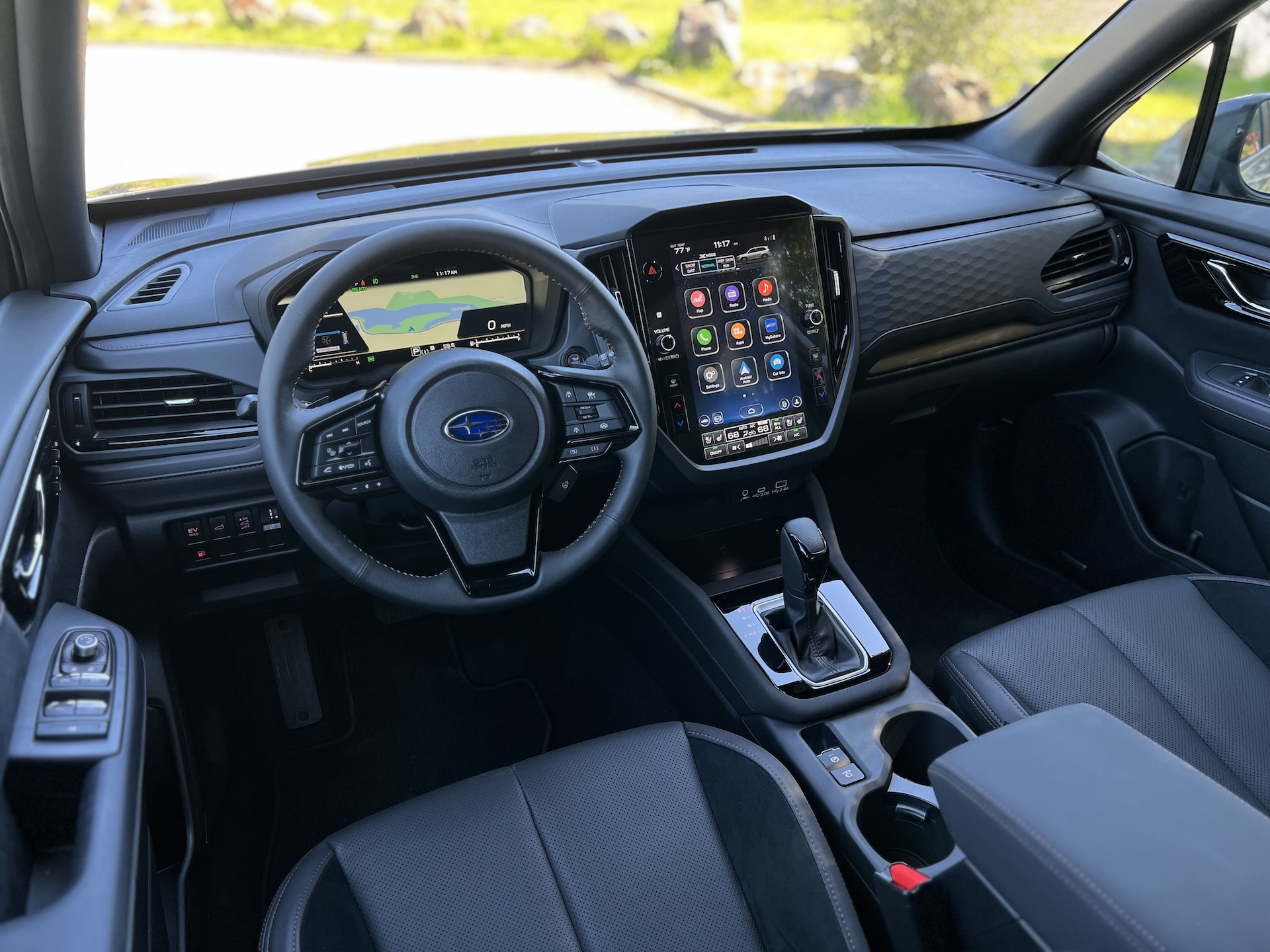 The Forester Hybrid interior features vegan leather, except on this top Touring trim, where it is apparently real. The more expensive the vehicle, the more genuine the leather, I guess. Also standard is a hybrid-only 12.3-inch digital cluster display that can project your choice of native navigation or Apple CarPlay. The hybrid has standard wireless Android Auto and CarPlay, but only CarPlay can appear within the gauge screen. Interestingly, if you want, you can have the in-car navigation display in the cluster, but Apple or Google Maps on the center touchscreen. In some BFE locations, one might work better than the other.