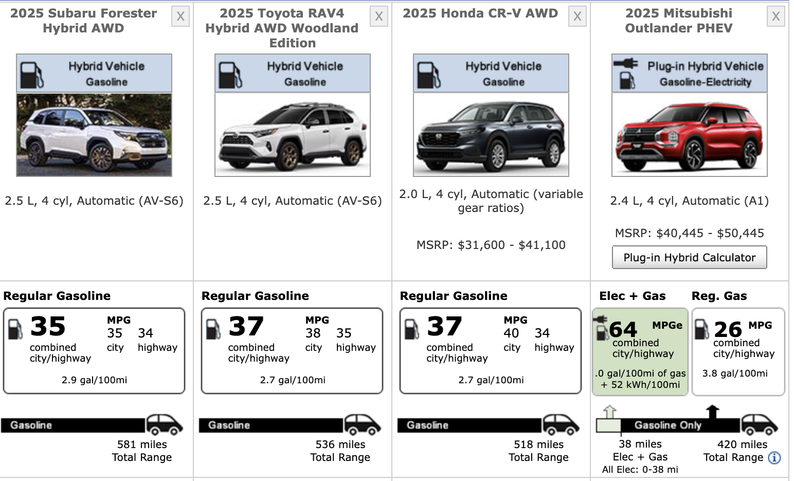 Opting for a Hybrid Forester over the gas, hp is up, but so is fuel economy. The most fuel-efficient gas Forester returns an EPA-estimated 29 mpg combined, while the Forester Hybrid gets 35 mpg combined. Given that, my daylong test on all manner of roads returned just 29 mpg. Comparing official figures the Forester lags slightly against its direct rivals from Toyota and Honda. The hybrid Mitsubishi Outlander, meanwhile, is a plug-in.