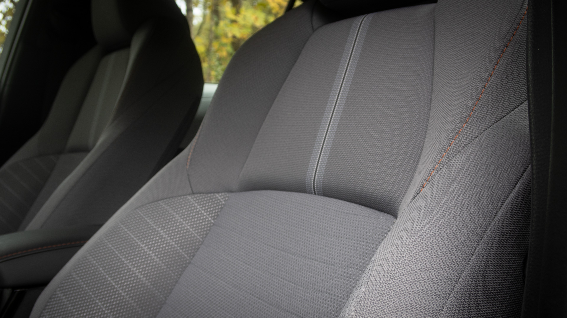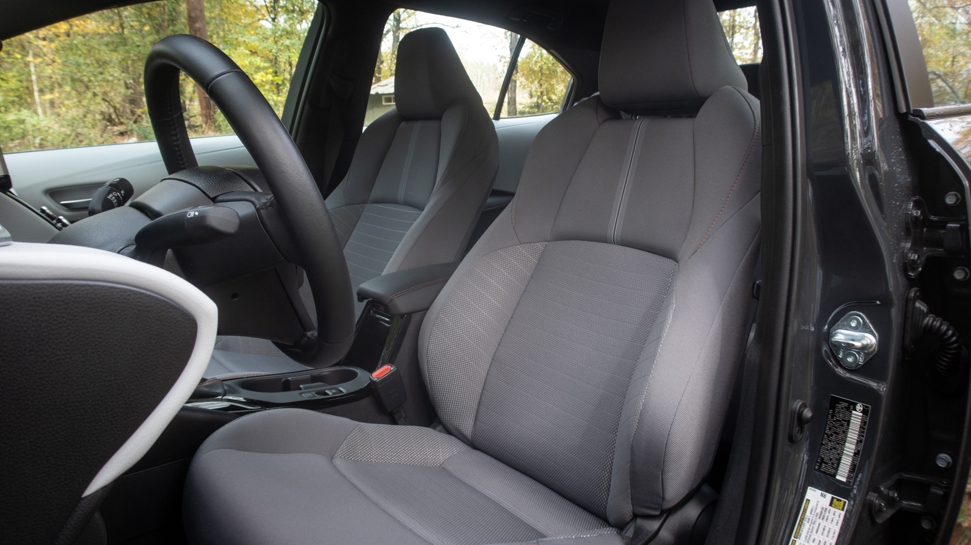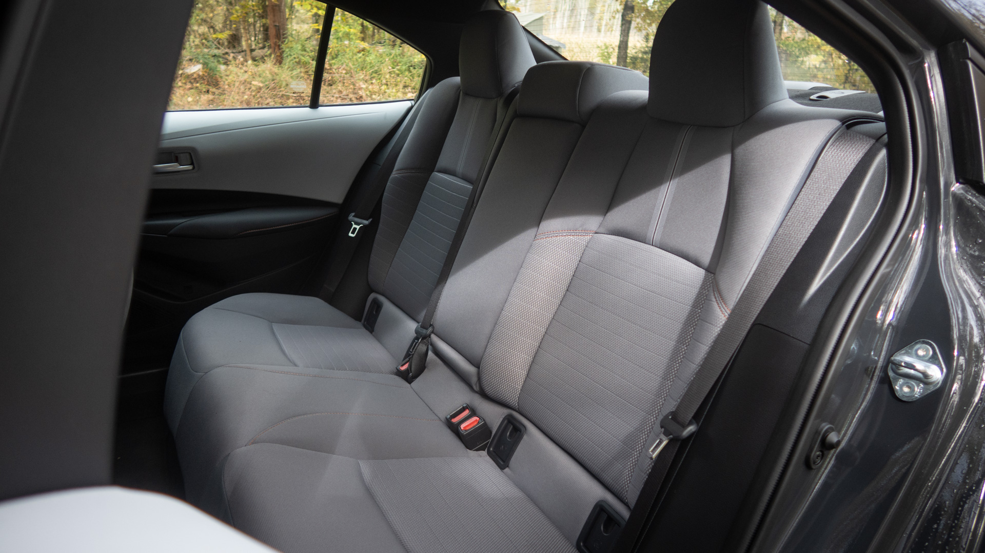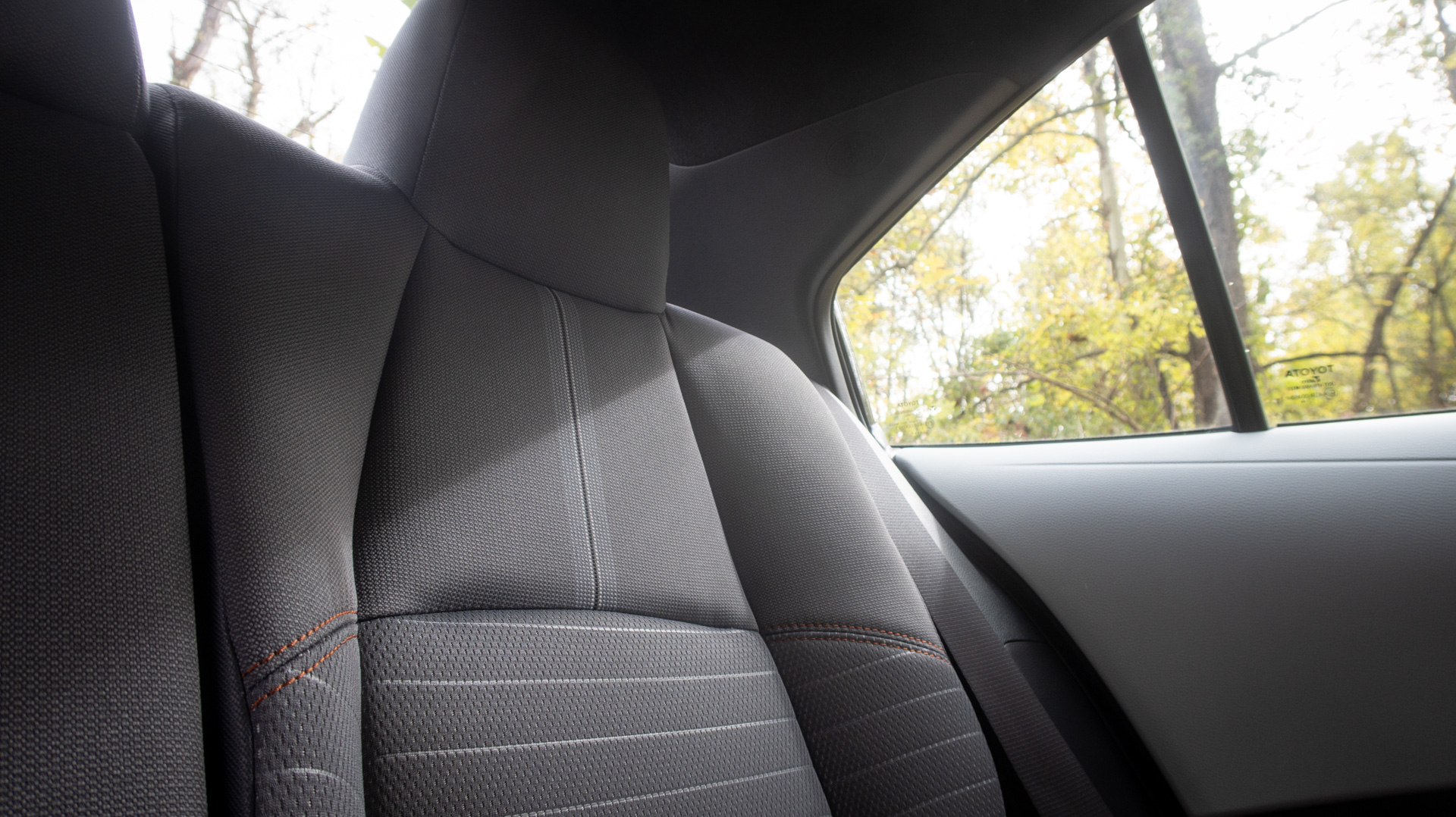 The Corolla’s seats are OK, not impressive, not bad, and I’d give about the same assessment to most of the cockpit’s looks and layout. Material choices feel reasonably robust, and a small contribution of orange piping goes a long way toward making the interior look and feel better. A big, plastic tombstone protrudes from the middle of the dashboard to hold a screen for smartphone connectivity and infotainment, which I absolutely hated.