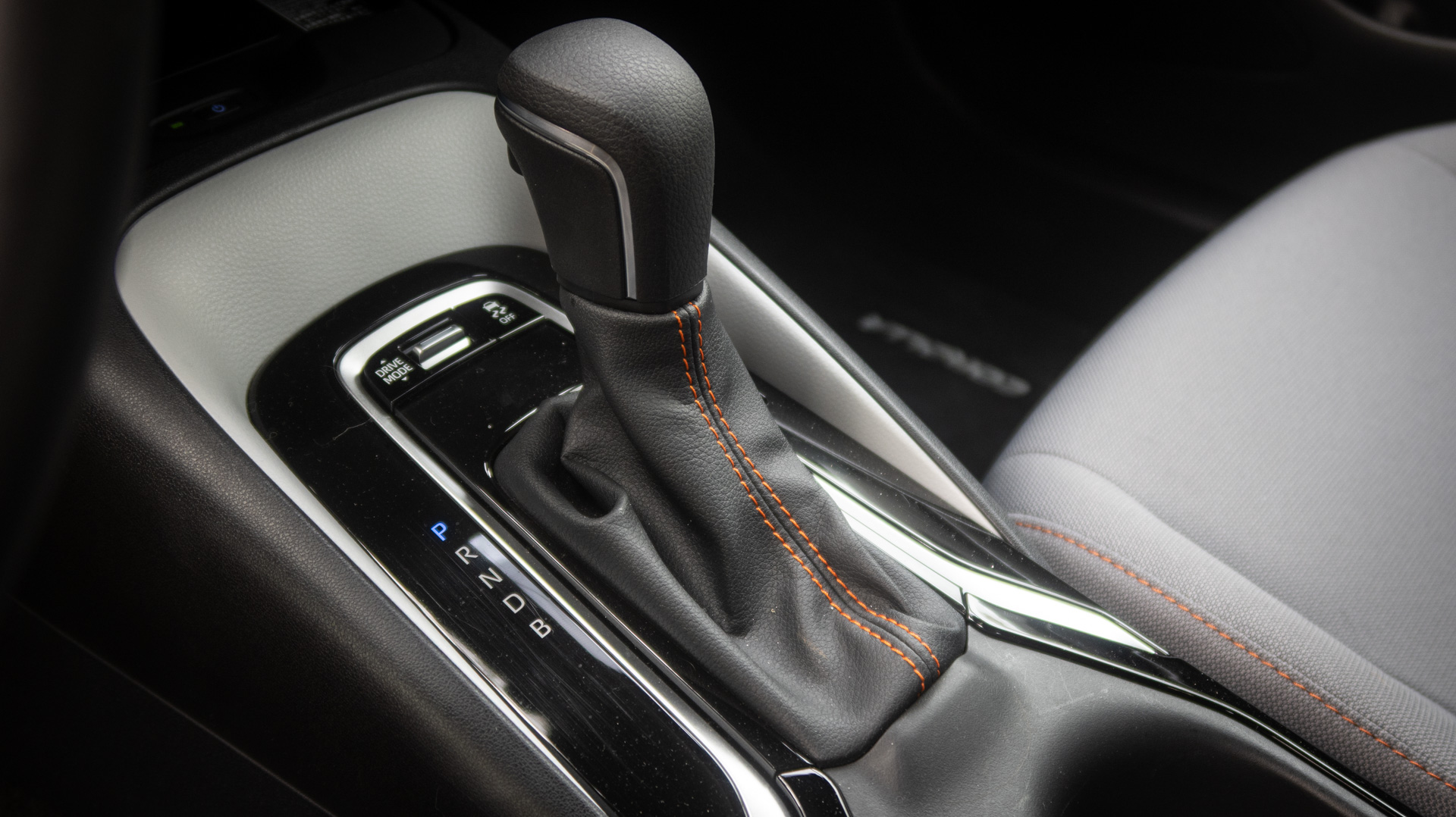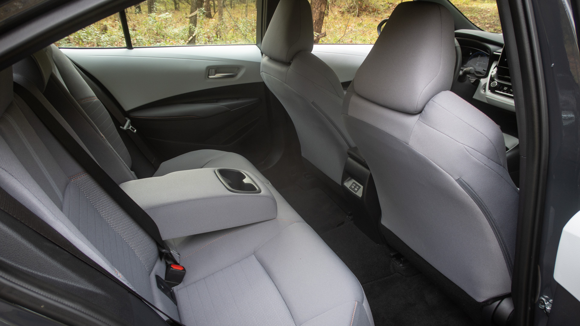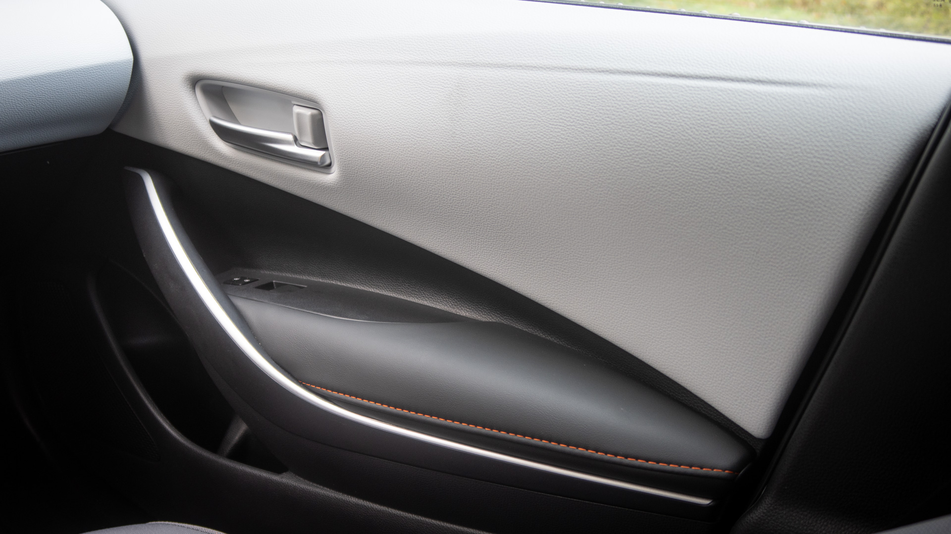 The Corolla’s seats are OK, not impressive, not bad, and I’d give about the same assessment to most of the cockpit’s looks and layout. Material choices feel reasonably robust, and a small contribution of orange piping goes a long way toward making the interior look and feel better. A big, plastic tombstone protrudes from the middle of the dashboard to hold a screen for smartphone connectivity and infotainment, which I absolutely hated.