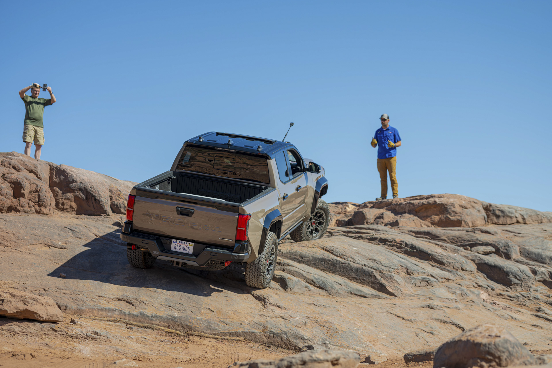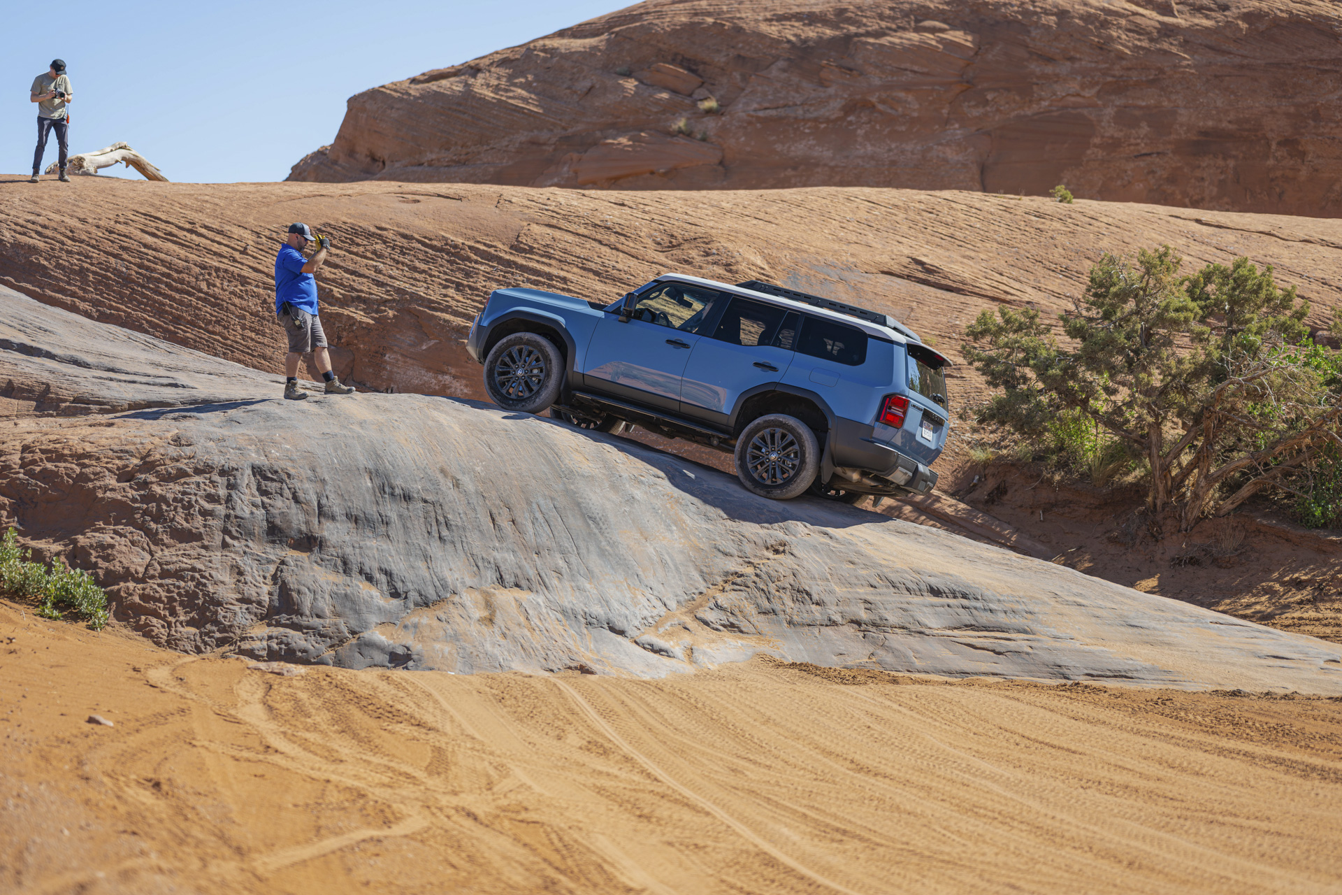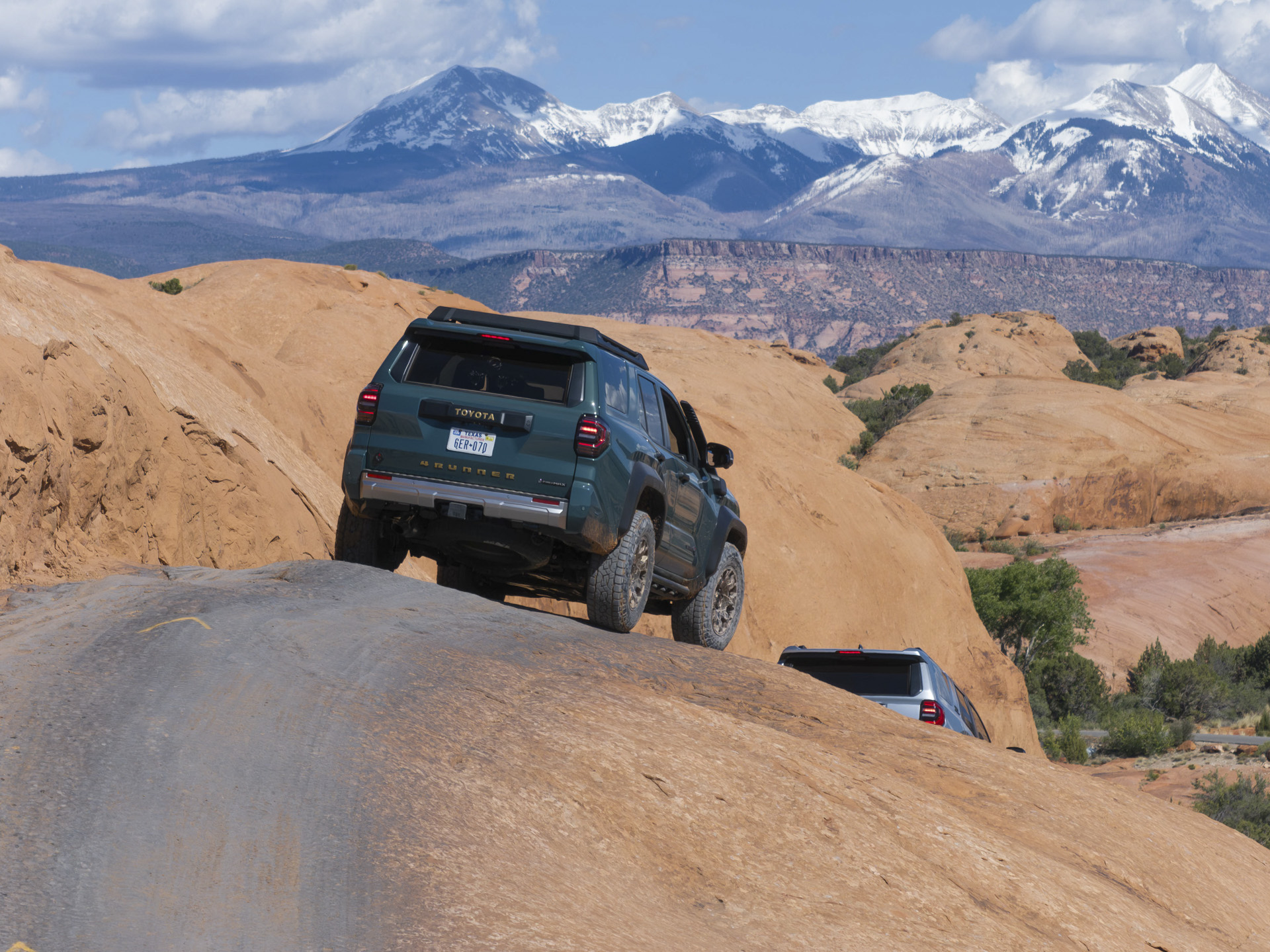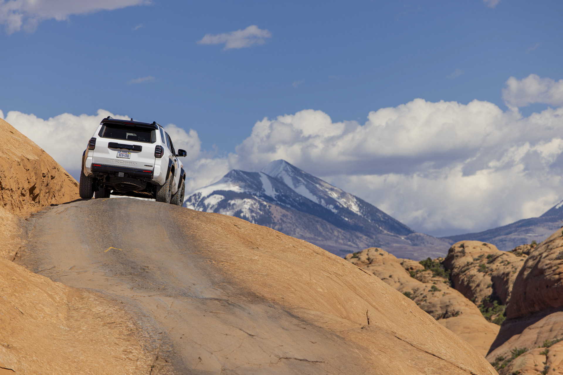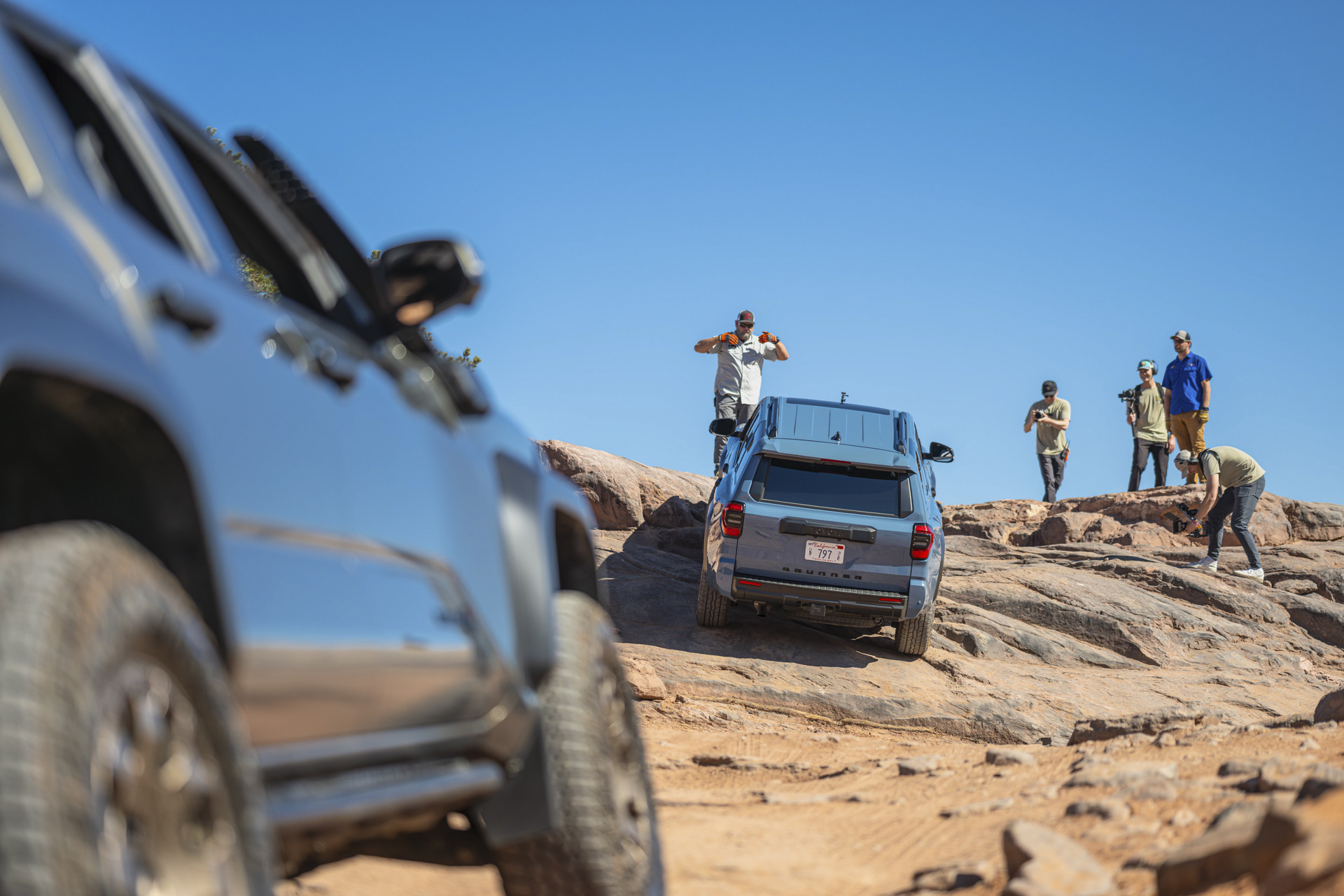 That brings us to our task: Getting a convoy of stock 2025 Tacomas, 4Runners, and Land Cruisers out-and-back on about half of the trail known as Hell’s Revenge. FunTreks rates this run as “difficult.” Having done it a few times myself, I would call it more of a hard-moderate (unless you hit all the extra-credit extreme obstacles like Hell’s Gate, then it’s really scary). A lot of the challenge is mental—you have to scale a few fins at the beginning that are so steep and skinny it’s easy to get rattled and wonder why you’re putting yourself through so much stress. Otherwise, you just have a few shelves and some really uneven rock sections. Slow and steady wins the day (unless you’re in a UTV, which pretty much just tramples its way over everything).