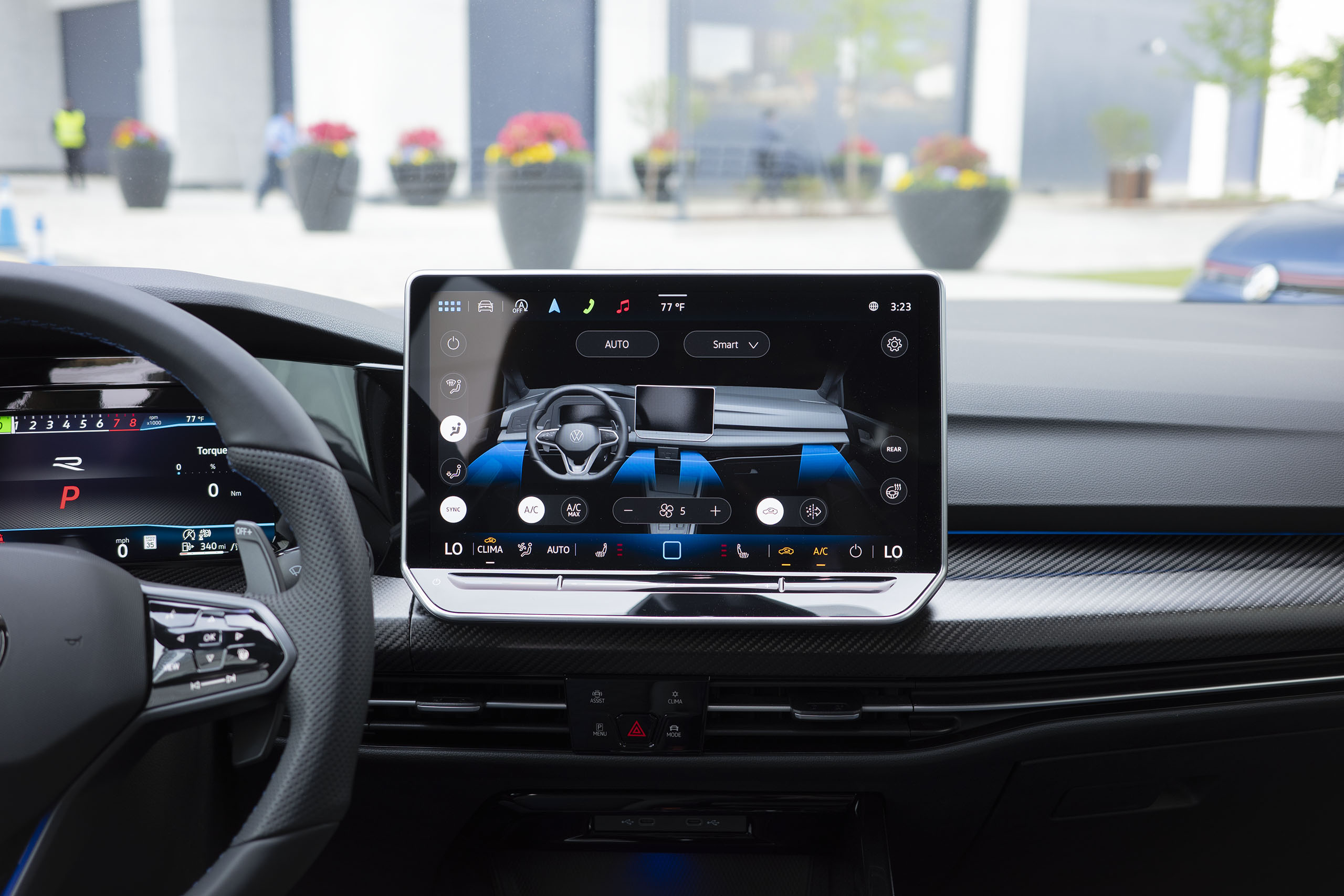 Outside, the Golf R gets a new front fascia with LED headlights that swivel; “R” badging on the doors; and standard forged 19-inch wheels that look sublime. Inside, the old 10-inch infotainment touchscreen has been replaced with one that measures 12.9 inches from corner to corner, and the capacitive sliders for volume and dual-zone temperature below the screen are now backlit—hallelujah.