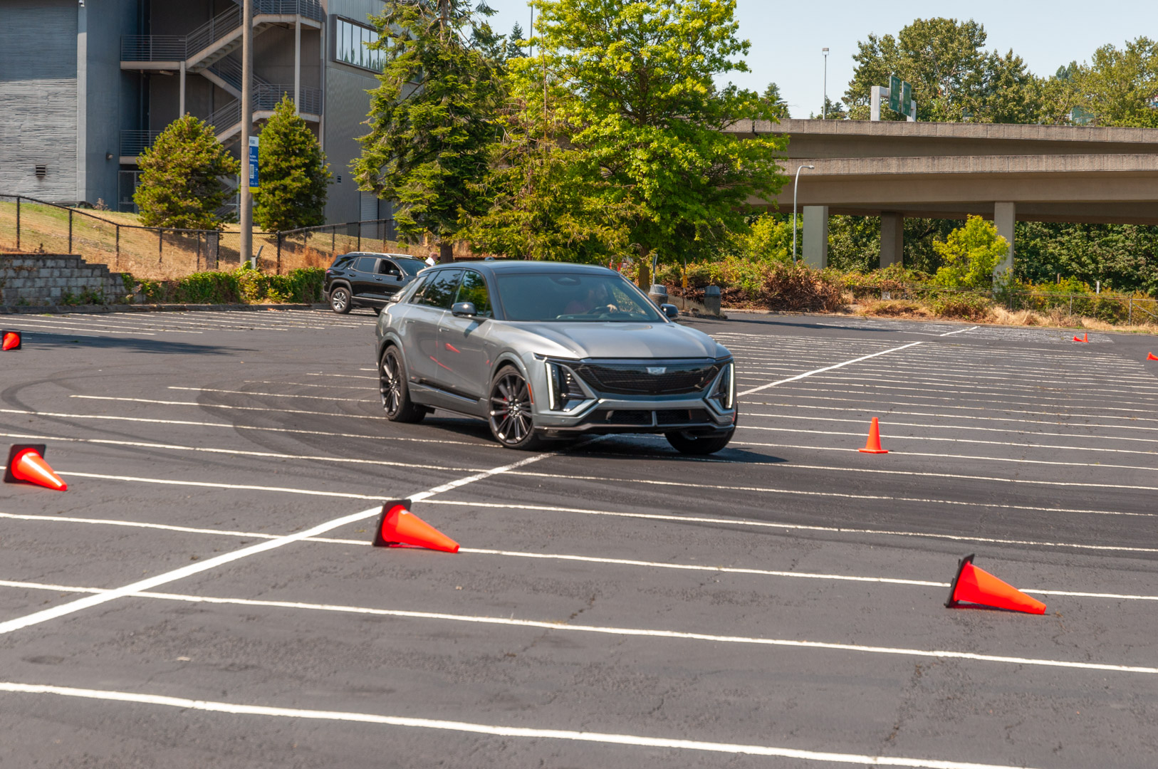 Cadillac let me loose in a closed-off parking lot to rip 0-60 mph runs for an hour straight. Cadillac said the Lyriq-V does the deed in 3.3 seconds, but I did it in 3.2 immediately with Launch Control according to the onboard time, which also measures 0-100 mph and a 1/4 mile time. Enabling Launch control is easy. Simply tap the V button on the steering wheel, push the brake pedal to the floor, push the accelerator to the floor, let off the brake, hold onto that steering wheel because things now move quickly. Another journalist somehow hit 3.0 seconds flat for the 0-60 mph sprint. Naturally I slid behind the wheel and continued to launch off the line until I matched his number. Had time not run out I would’ve kept going until the car forced me to stop or I hit 2.9 seconds.