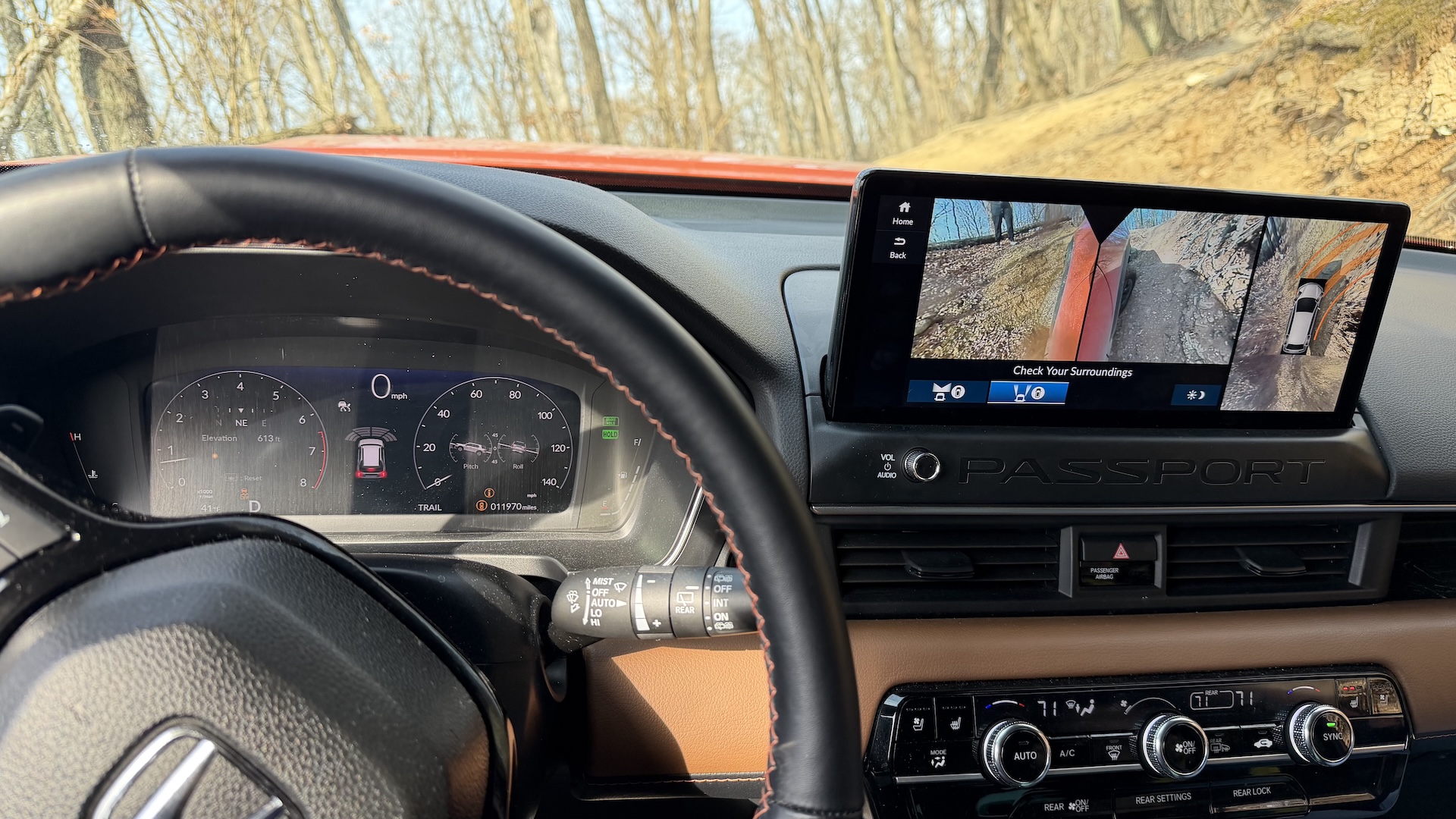 In case you’re not super familiar with the Passport’s specs, here are the basics: the 3.5-liter V6 produces 285 horsepower and 262 lb-ft of torque and is paired with a 10-speed automatic transmission. Honda’s second-gen Intelligent Variable Torque Management four-wheel-drive system sends power to all four wheels, while Trail Torque Logic with Snow, Trail, and Sand modes manages power, torque, and slip settings depending on trail conditions.