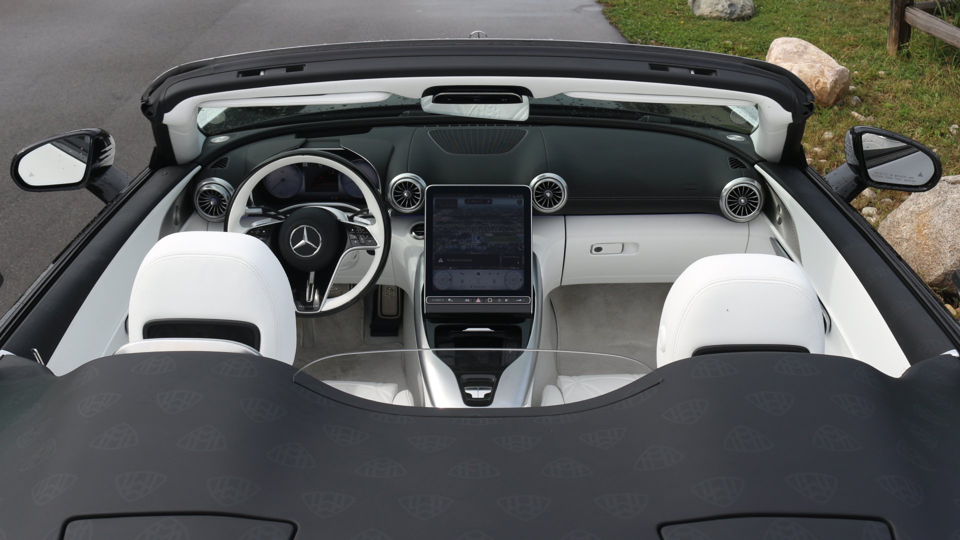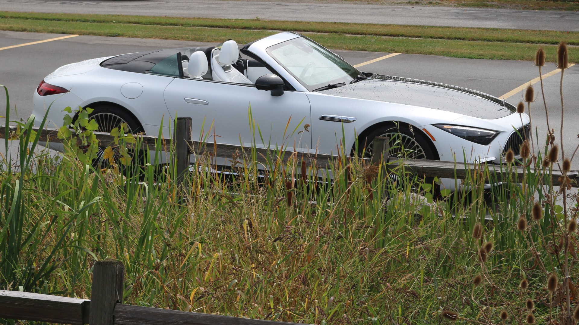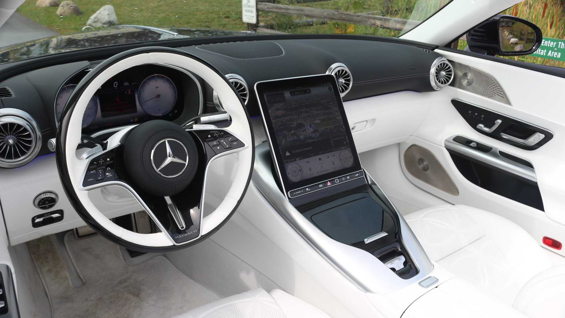 Inside, it’s pretty conventionally Mercedes, provided you’re used to seeing them, with virtually every option checked. But given the limited scope of the SL within Benz’s current lineup, this is probably how you’ll see most of them, too. It certainly doesn’t disappoint. Perhaps the most glaring indicator that this car is not meant for people like me is that I can’t stop thinking about how hard it must be to keep these supple white floor mats clean.