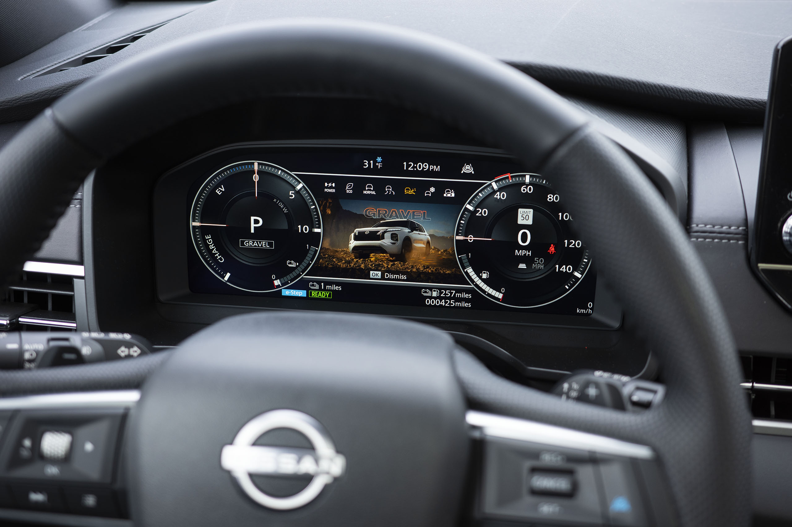 The Rogue Plug-In’s chassis is especially well-sorted, benefitting from Mitsubishi’s torque-managing Super All-Wheel Control system that offers seven (count ’em) driving modes. Channeling Mitsubishi’s rallying tradition, most pertain to specific surface types, such as mud, gravel, or snow. I didn’t take the Rogue off-road, and while it was very cold during this trip down to Nissan’s U.S. base in Tennessee, it wasn’t quite snowing, so I can’t speak to the vehicle’s prowess off the black stuff. Strangely, this dial gives drivers the choice of a power mode or a tarmac mode, and it’s not especially clear which I’d choose for “spirited” driving, let alone why.