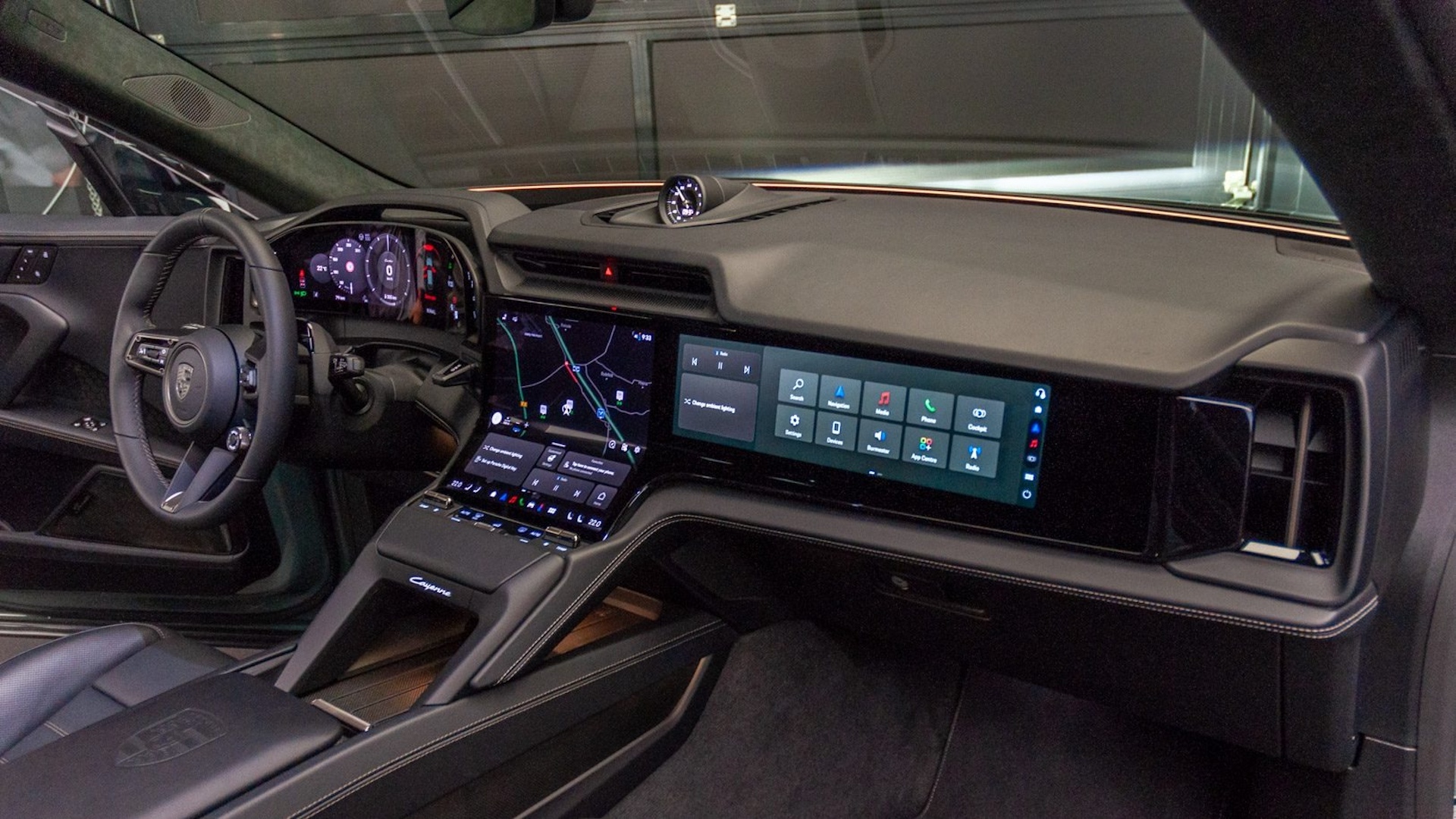 A Cayenne Electric can have up to four screens, depending on the configuration: a gauge cluster screen, a center screen, a front passenger screen, and a backseat climate screen. Every Cayenne Electric will feature a 14.25-inch OLED curved digital gauge cluster, similar to the one found inside the Taycan. The screen itself is incredibly thin, as evident from its edges. It’s reconfigurable and can have everything from a power meter to Apple Maps navigation or Google Maps.