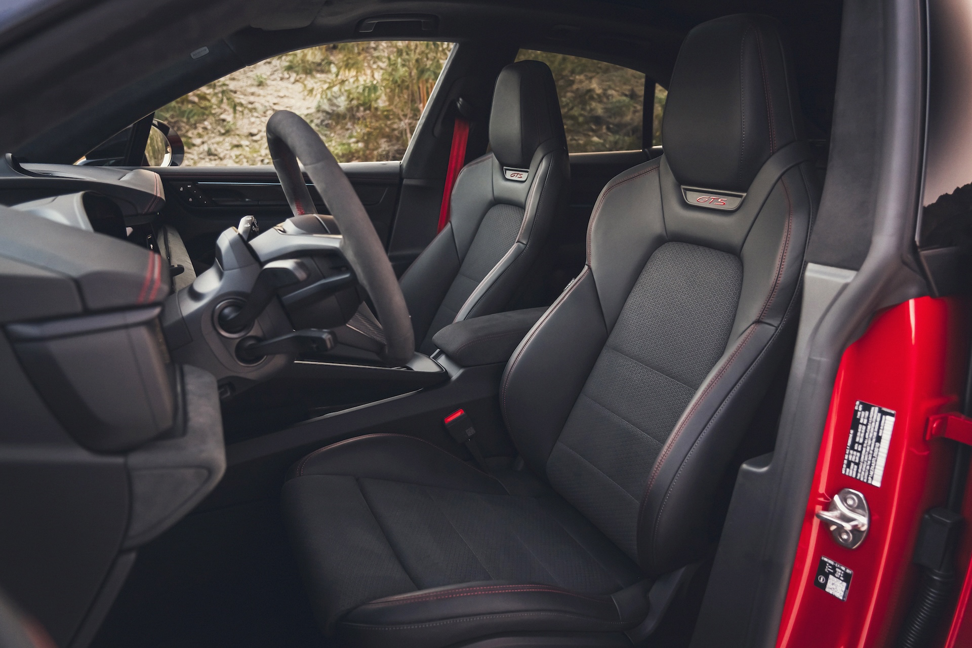 The Macan GTS also debuts an updated front and rear design that will become standard across all Macan Electric models later this year. If you’re trying to spot the GTS in a parking lot, look for the black accents on the mirrors and doors, which are model-specific. That updated fascia, paired with a splash of black trim, made my Carmine Red tester an obvious fan favorite of the day.