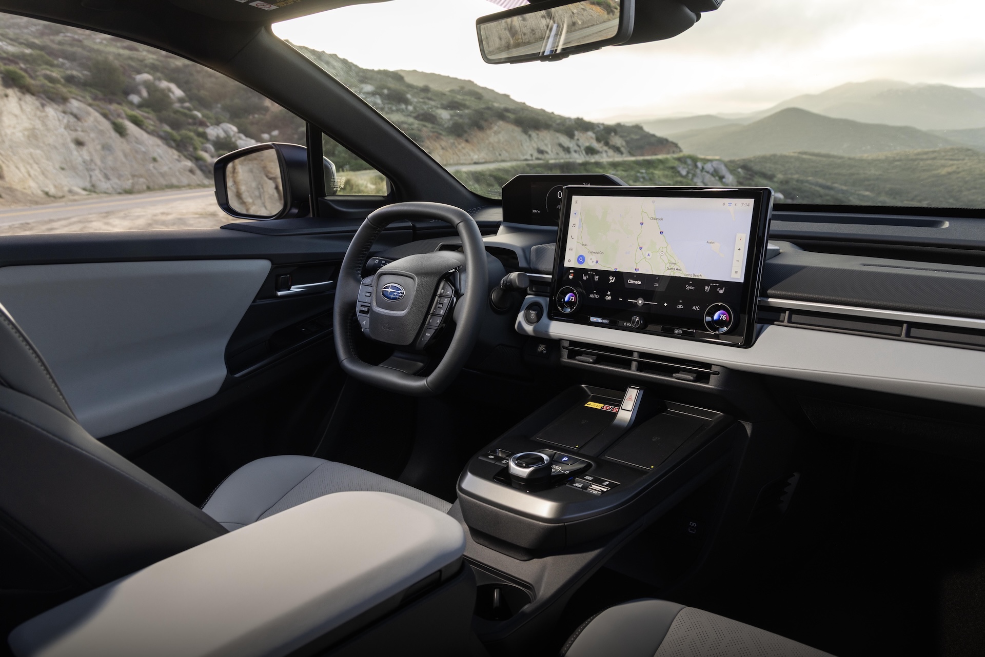 The Trailseeker interior lines up perfectly with Subaru’s pragmatic past, too. It’s an uncomplicated place to work, with a smaller digital display for speed, regen, and more, all above a squircular steering wheel. The broad-shouldered console houses twin phone chargers and drive-mode selectors, with storage beneath it. Above that, a massive 14.0-inch screen from Toyota’s supply house weighs down the dash, complete with wireless CarPlay and dual knobs for climate adjustment. That, plus a handful of horizontal surfaces, tells the whole story. There’s nothing, save for those screens, to distract.